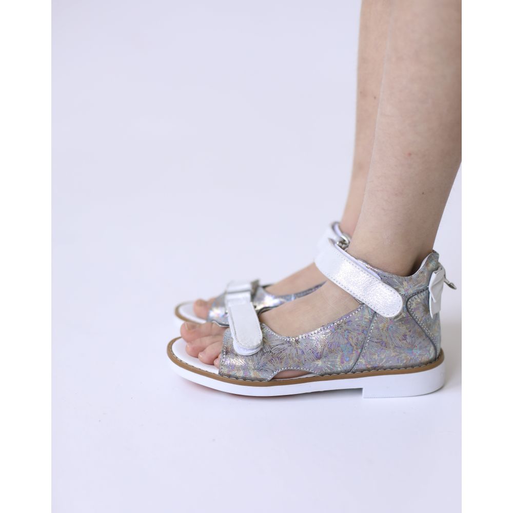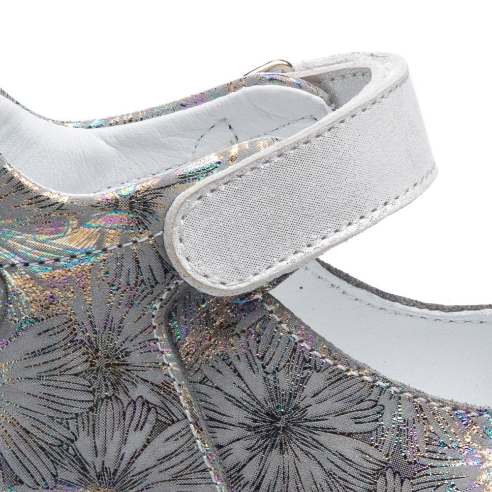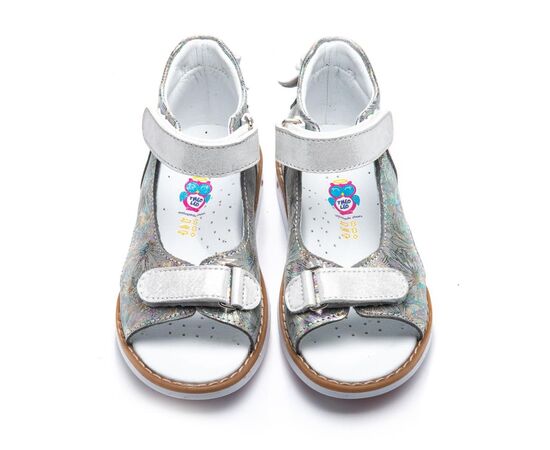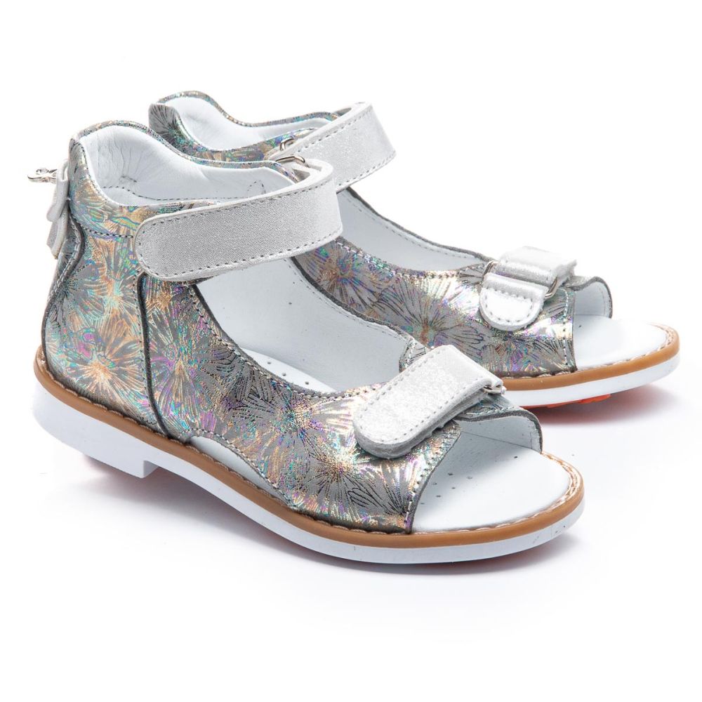 Босоніжки Theo Leo 1116 - красиве взуття для дівчинки з натуральної шкіри сріблястого кольору зі стильним малюнком. Фіксуються на нозі за допомогою двох липучок. Устілка і підкладка - натуральна шкіра.