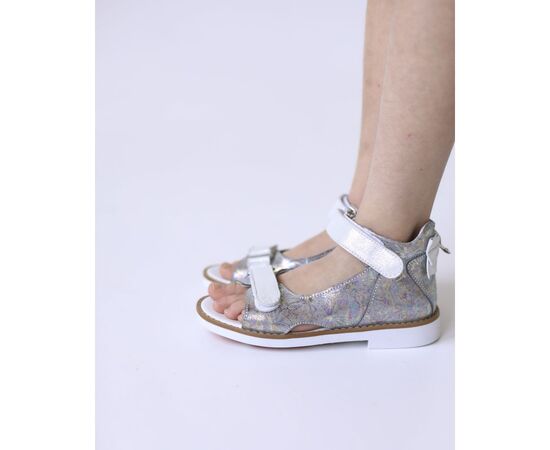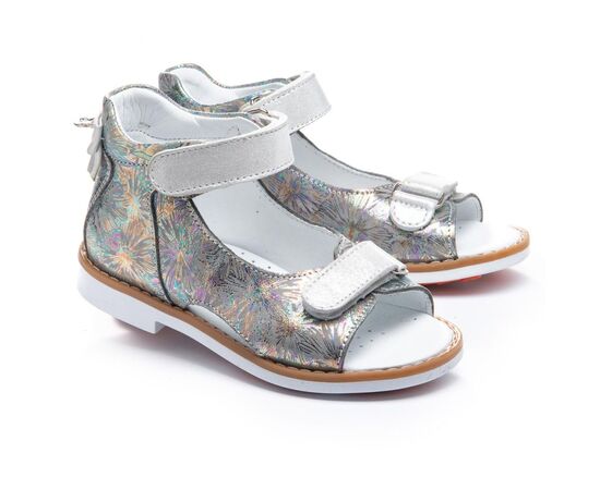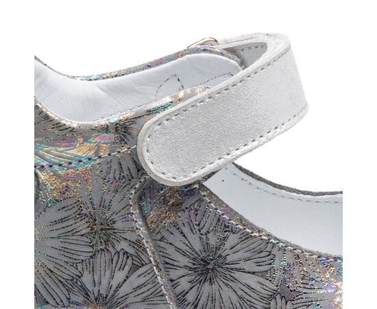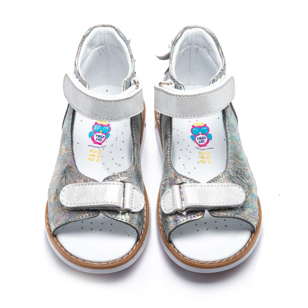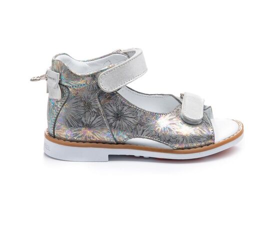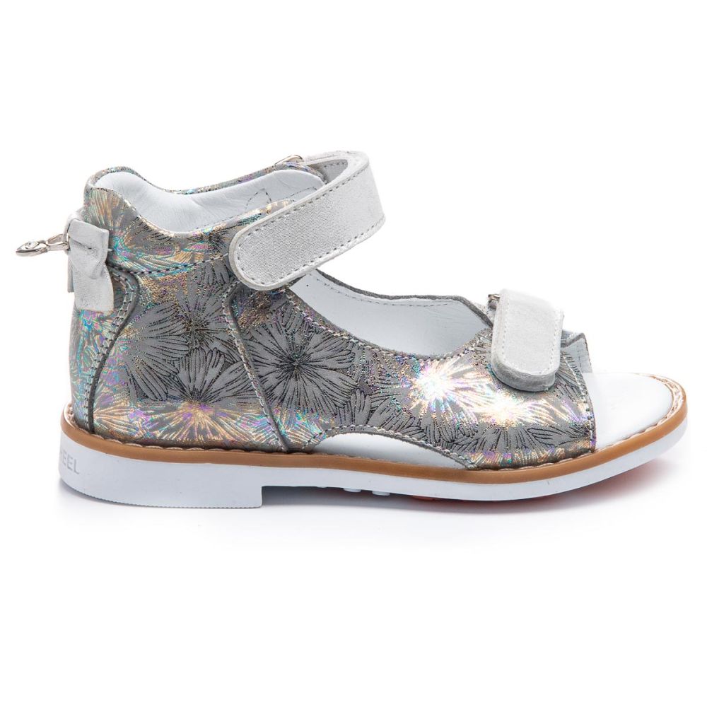 Босоніжки Theo Leo 1116 - красиве взуття для дівчинки з натуральної шкіри сріблястого кольору зі стильним малюнком. Фіксуються на нозі за допомогою двох липучок. Устілка і підкладка - натуральна шкіра.