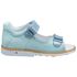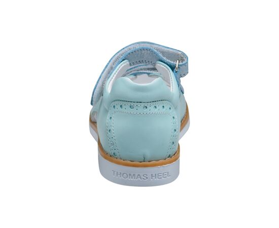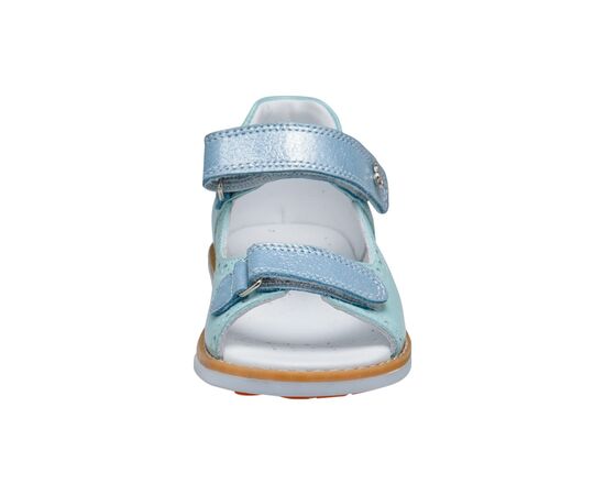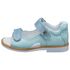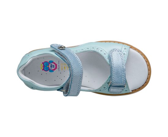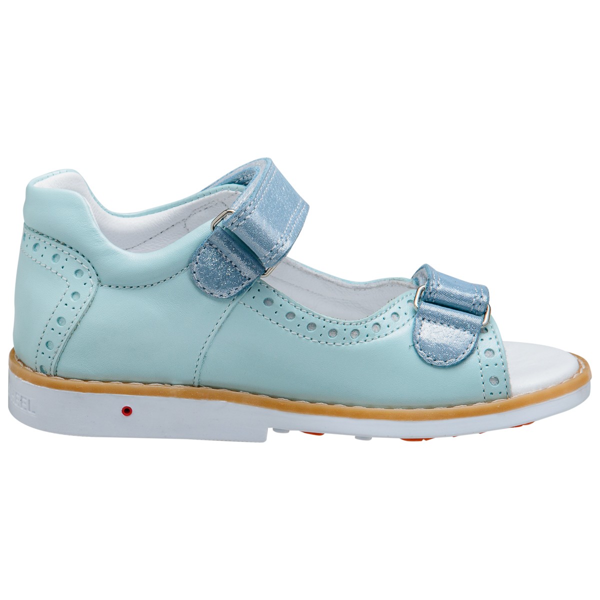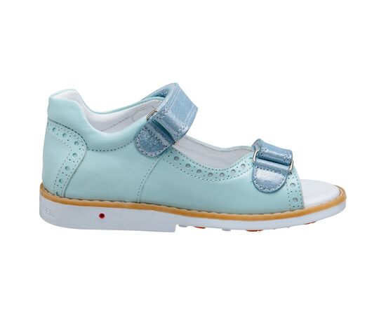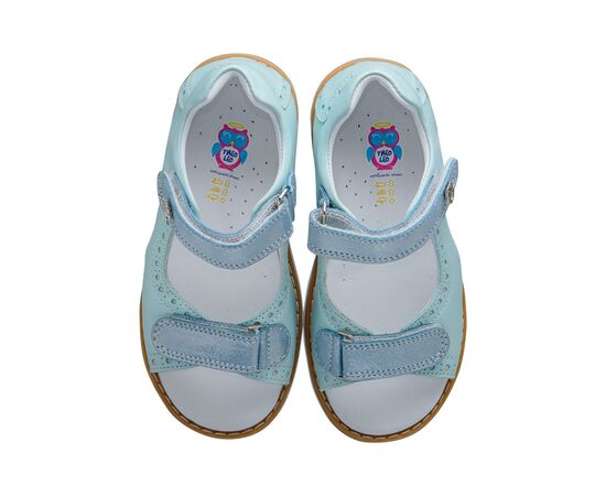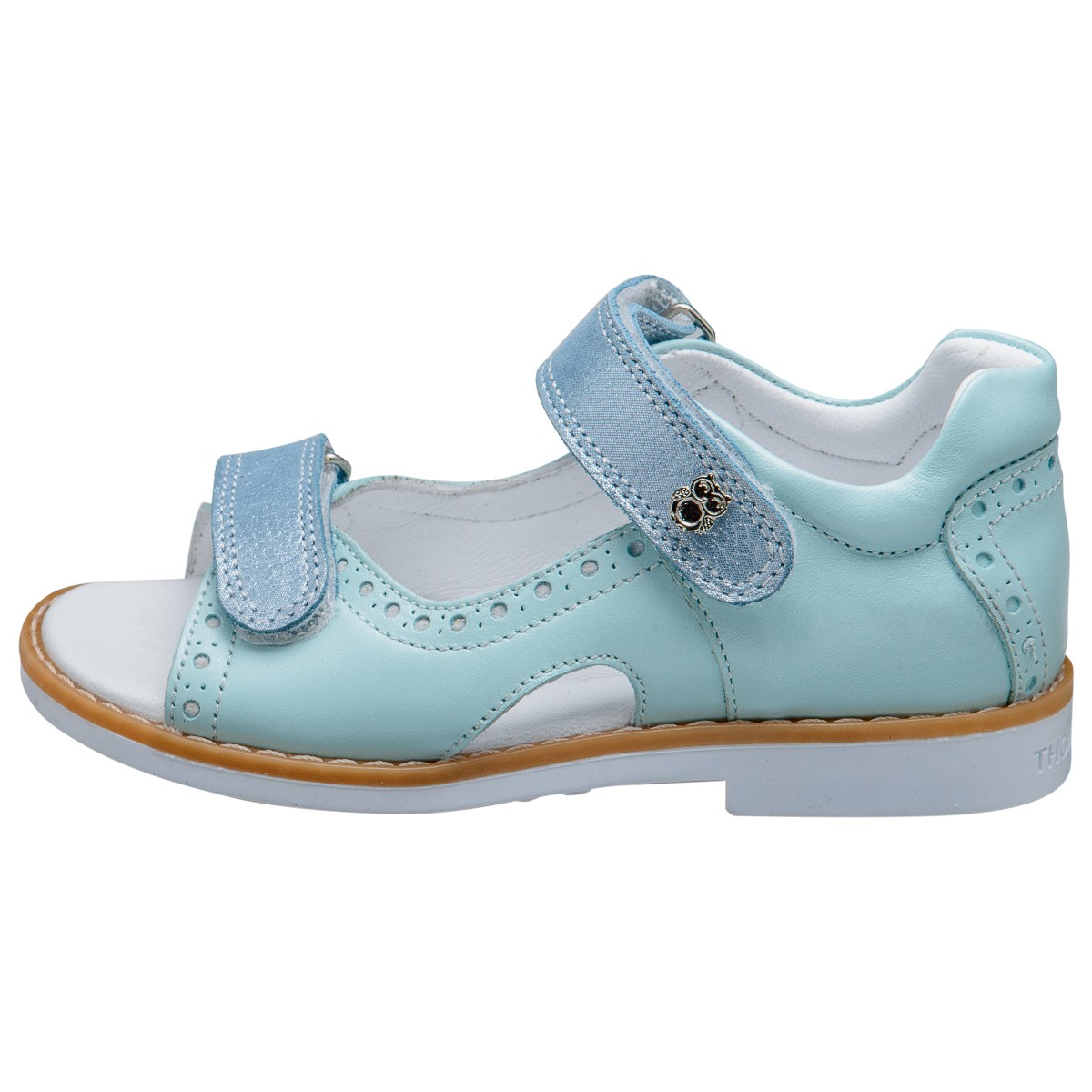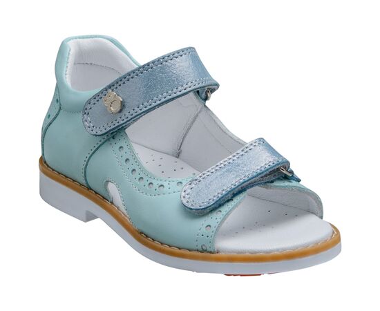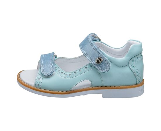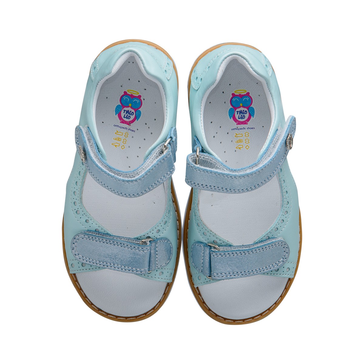 Theo Leo 921 - красиві босоніжки для дівчинки з натуральної шкіри бірюзового кольору зі стильною перфорацією. Фіксуються на нозі за допомогою двох липучок. Устілка і підкладка - натуральна шкіра. Присутній анатомічний супінатор, каблук Томаса. Підошва виконана з термопластичної гуми, не ковзає і добре амортизує.