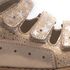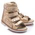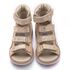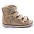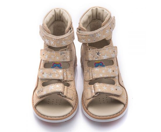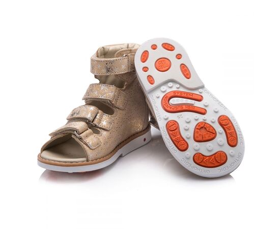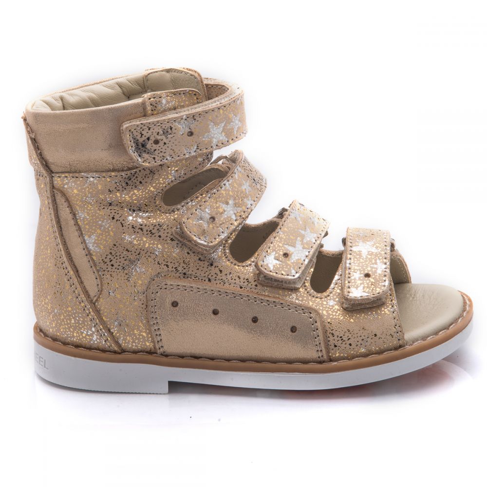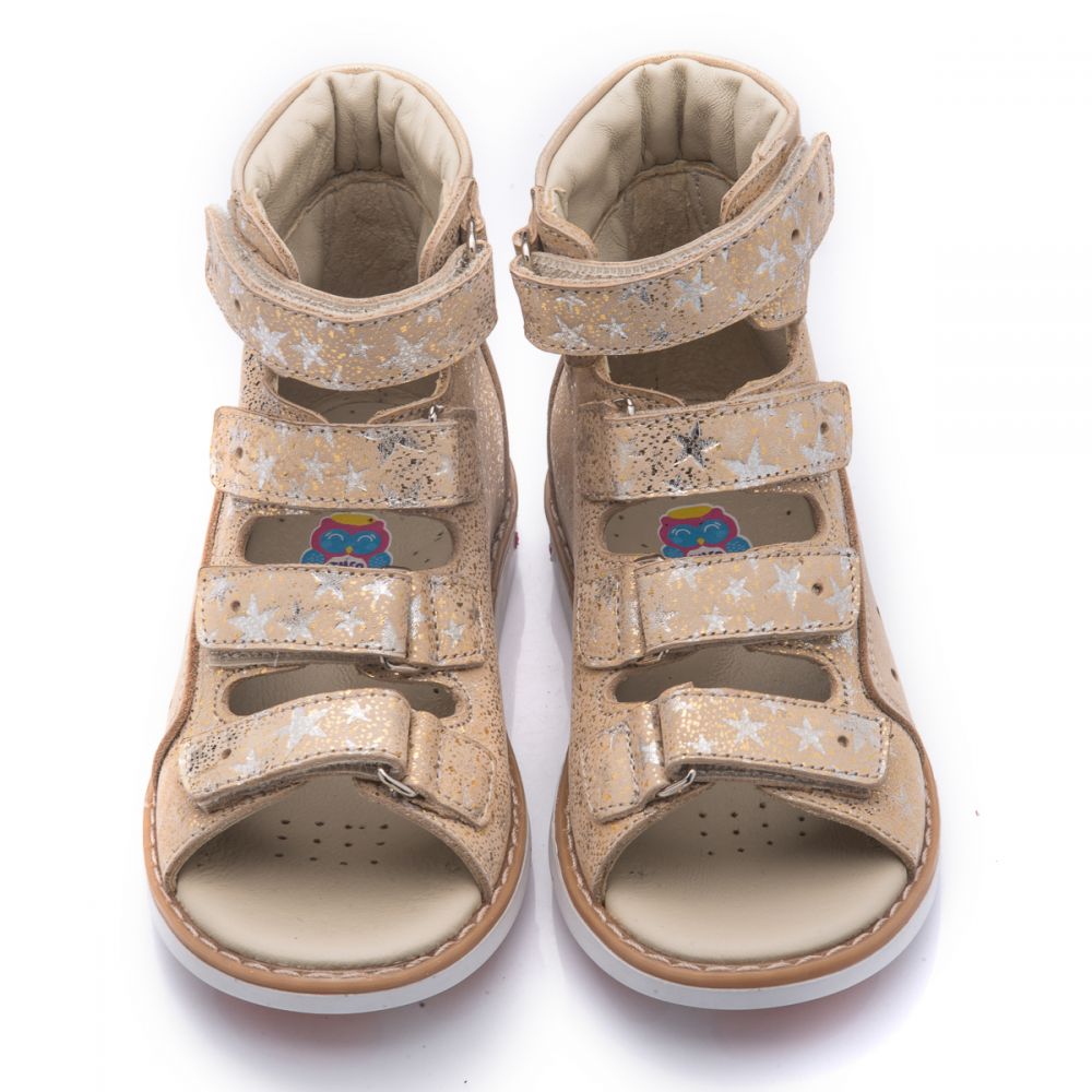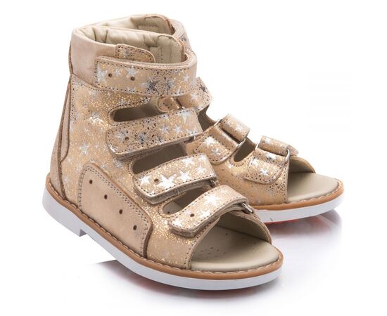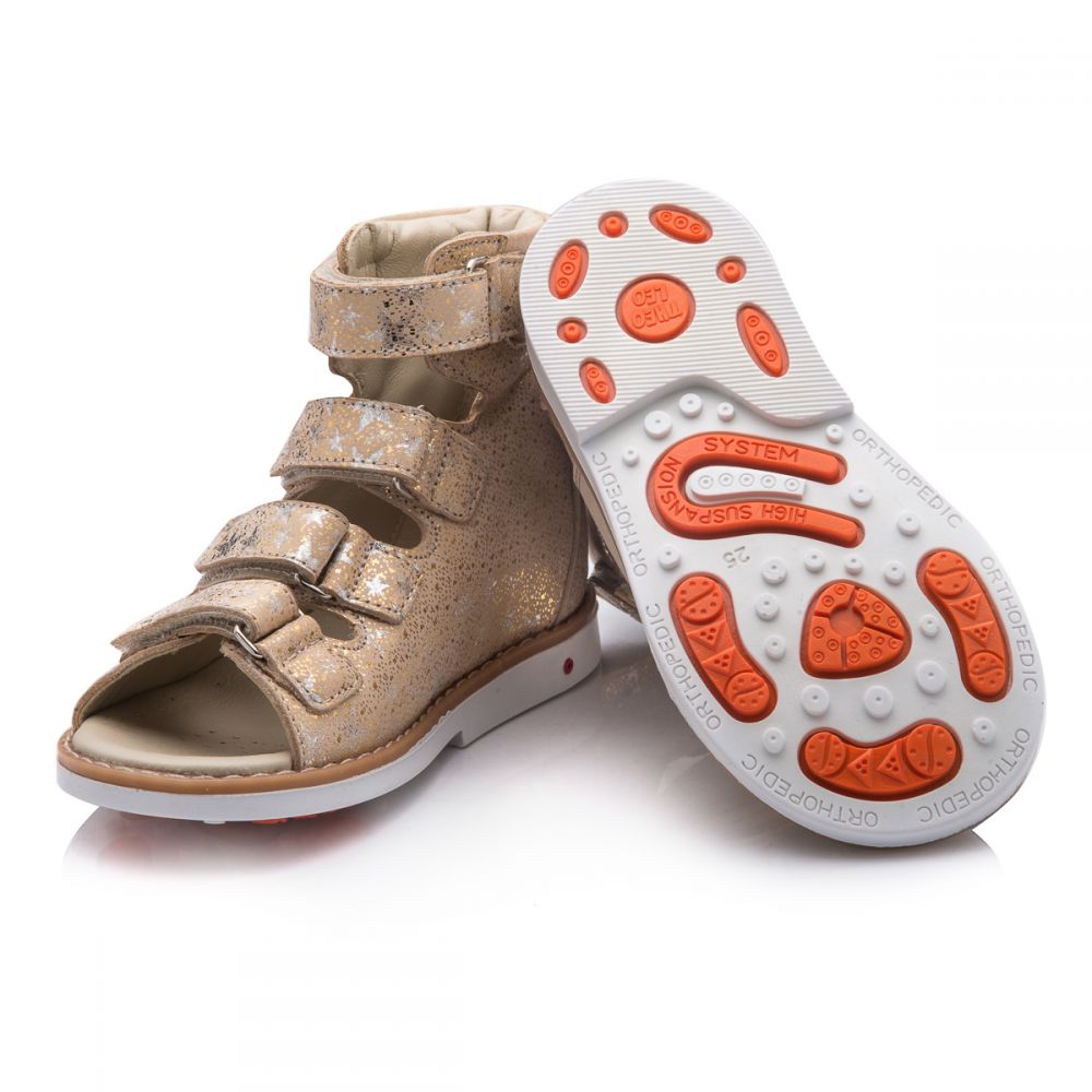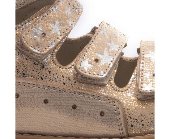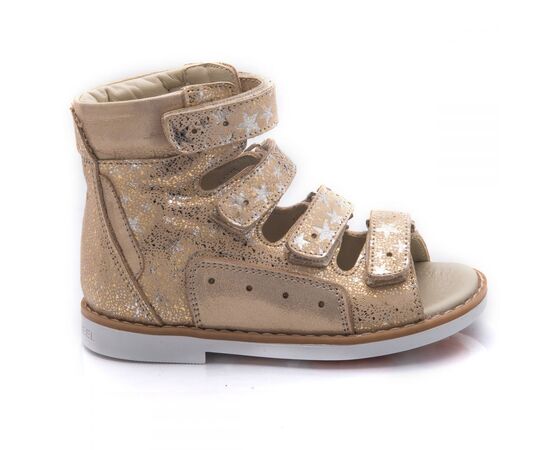 Theo Leo 751 - ортопедичні босоніжки для дівчинки виконані з натуральної шкіри золотистого кольору з візерунком у вигляді сріблястих зірочок. Декоровані вставкою з однотонної золотистої шкіри. Застібаються і фіксуються на нозі за допомогою 4 липучок. Підкладка та устілка з анатомічним супінатором - натуральна шкіра. Підошва - нековзна, з каблуком Томаса, добре амортизує, стійка до температур.
