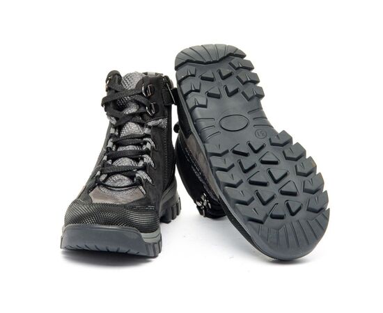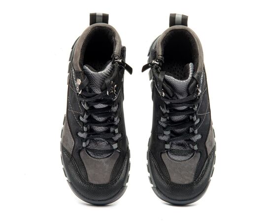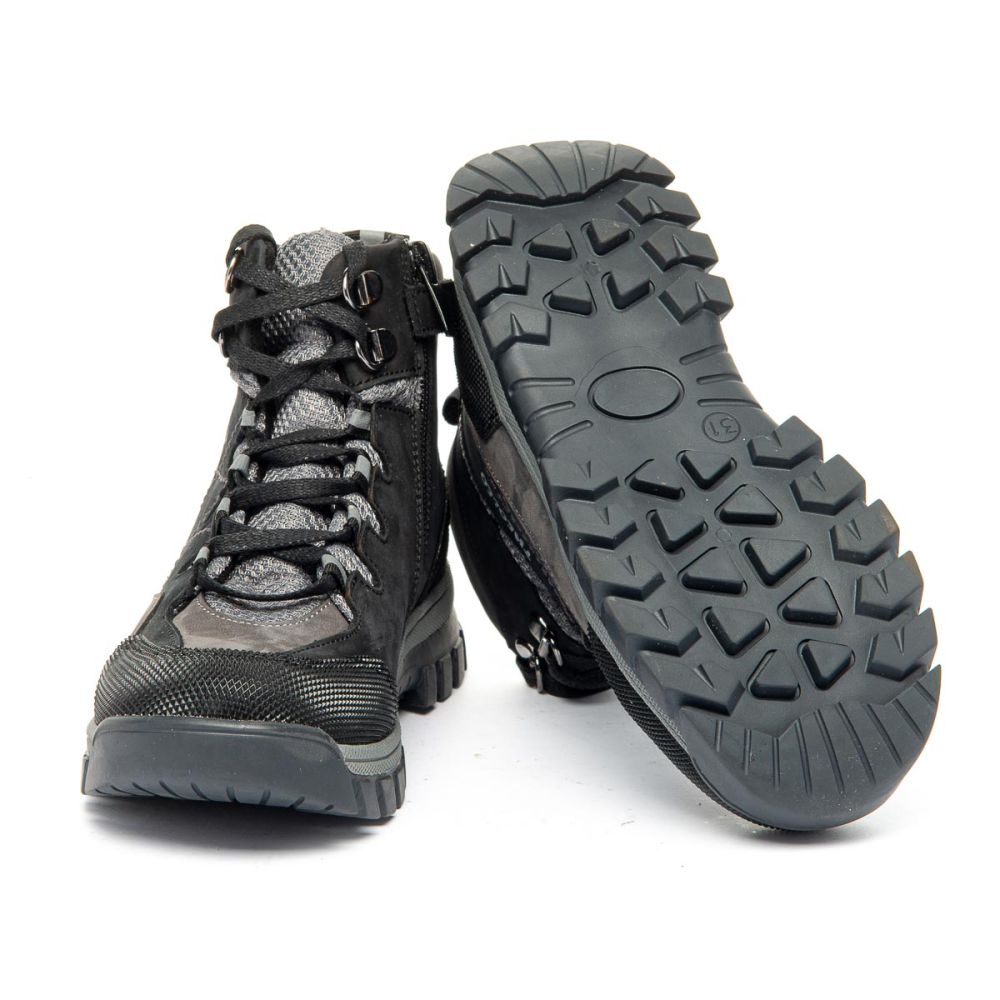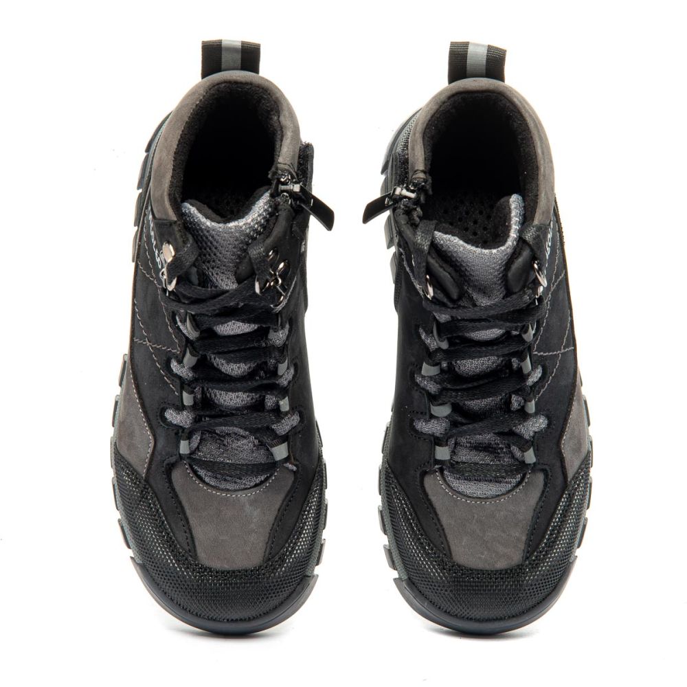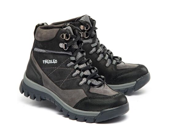 Осінні черевики для хлопчика LEO-1351 виконані з натурального нубуку чорного кольору, декоровані вставкою з сірого нубуку. Модель на блискавці і декорована шнурівкою. Носок та задник моделі укріплений ущільненою вставкою.