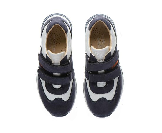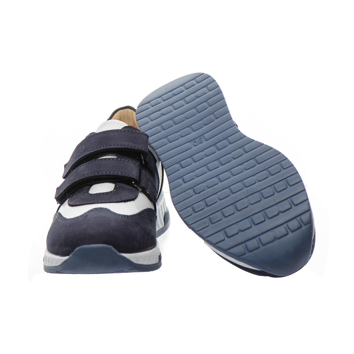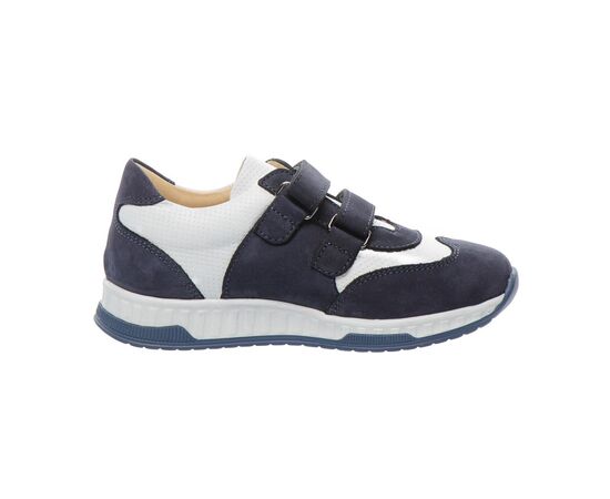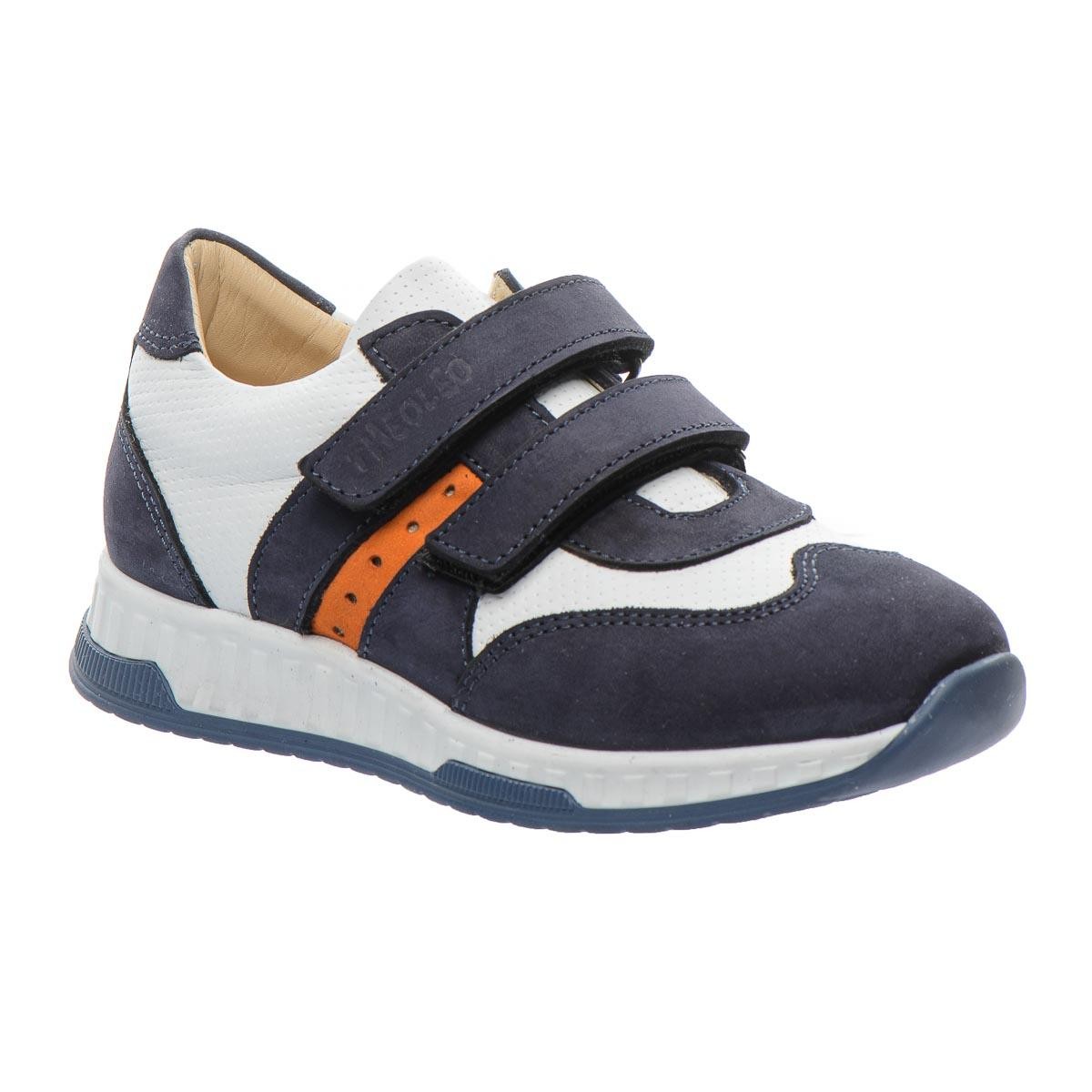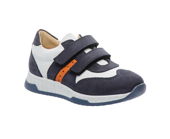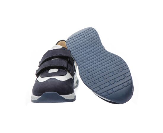 Фактурним доповненням моделі виступає застосування перфорації у верхніх шарах нубука. Контрастна вставка з натуральної шкіри білого кольору стильно доповнює дизайн моделі. Дитячі кросівки для хлопчика мають гнучку та легку підошву, жорсткий задник, супінатор та анатомічно правильну устілку. В якості застібки в кросівках використовуються дві надійні липучки, які дозволять відрегулювати повноту ніжки та значно полегшать взування. Така модель кросівок, без сумніву, користуватиметься попитом серед цінителів комфорту.