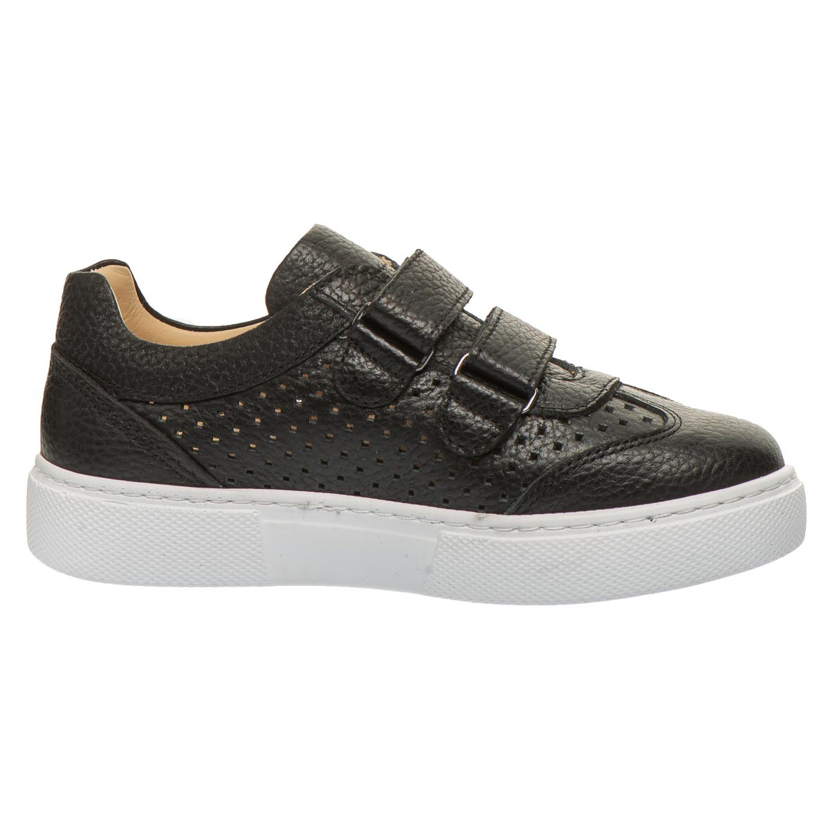 Фіксацію і можливість коригувати обсяг забезпечують дві надійні липучки. Дитячі кросівки оснащені жорстким задником і анатомічної знімною устілкою з пружним супінатором. Підошва контрасного білого відлита з термопластичної гуми, гнучка та легка, не ковзає.