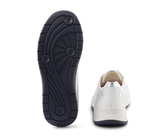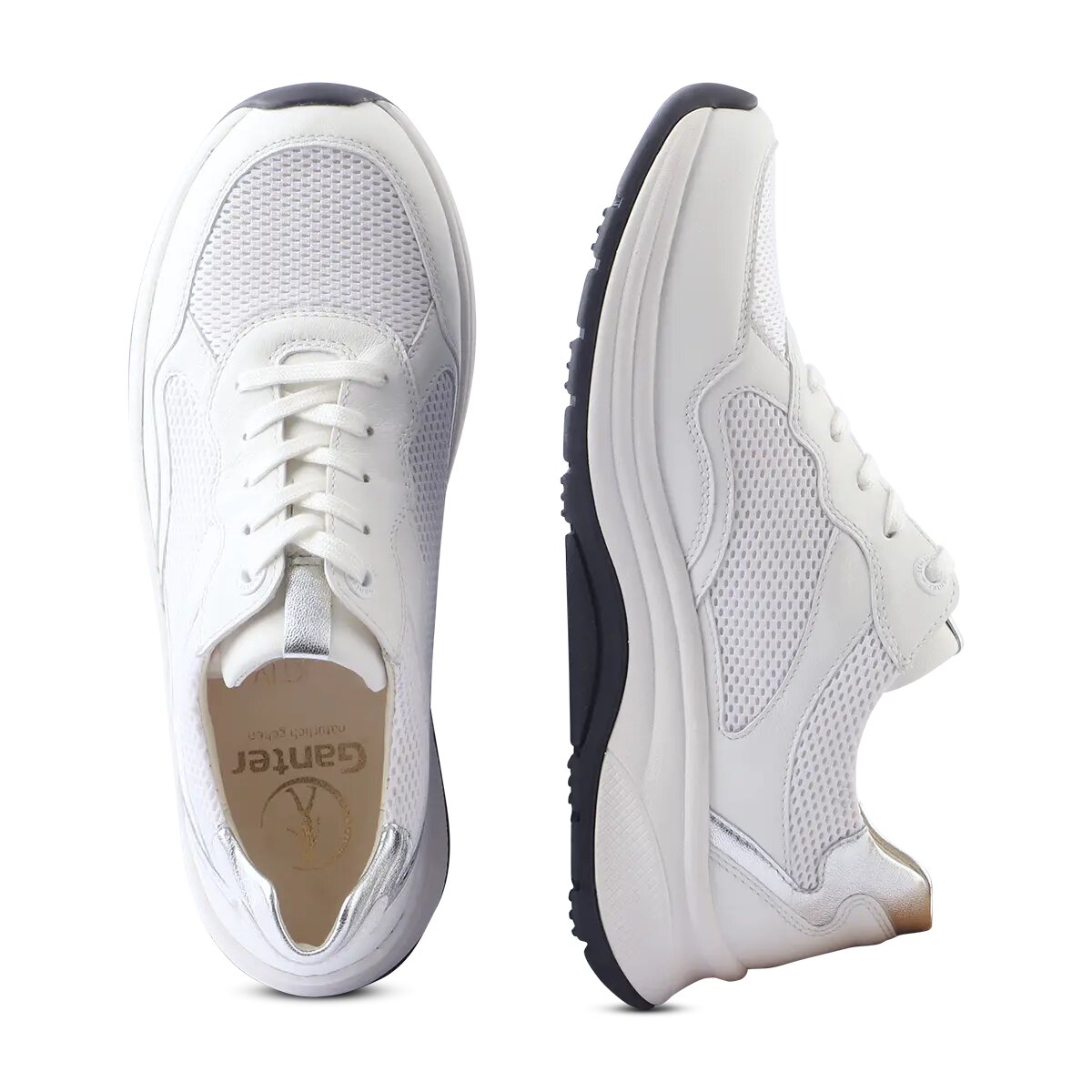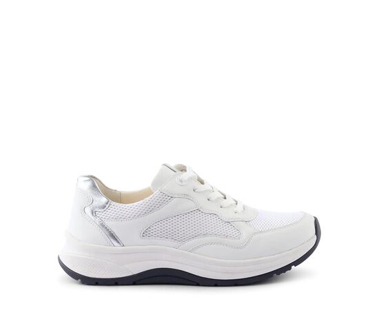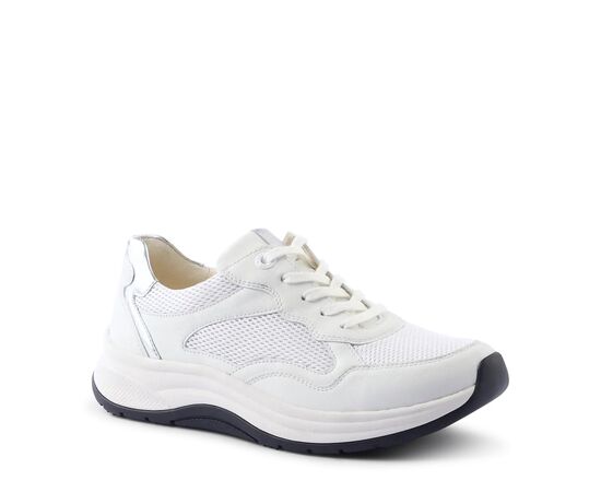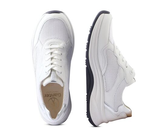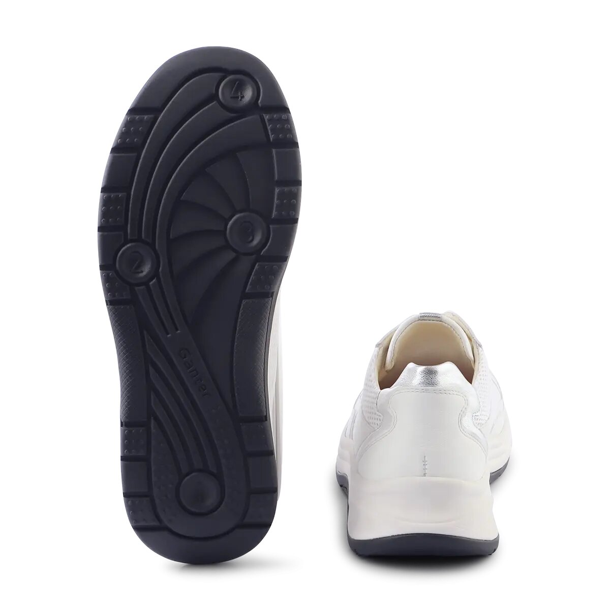 Модель High Flyer це міцні та сучасні кросівки, з запатентованою технологією Ganter Aktiv, які дозволяють активно формувати своє дозвілля — для накопичення щоденних кроків на роботі та у вільний час. Виготовлені з крутого поєднання гладкої та металізованої шкіри, біло-срібні жіночі кросівки можна поєднувати різними способами. Спортивно-шикарний силует доповнюють вставки Airmesh.