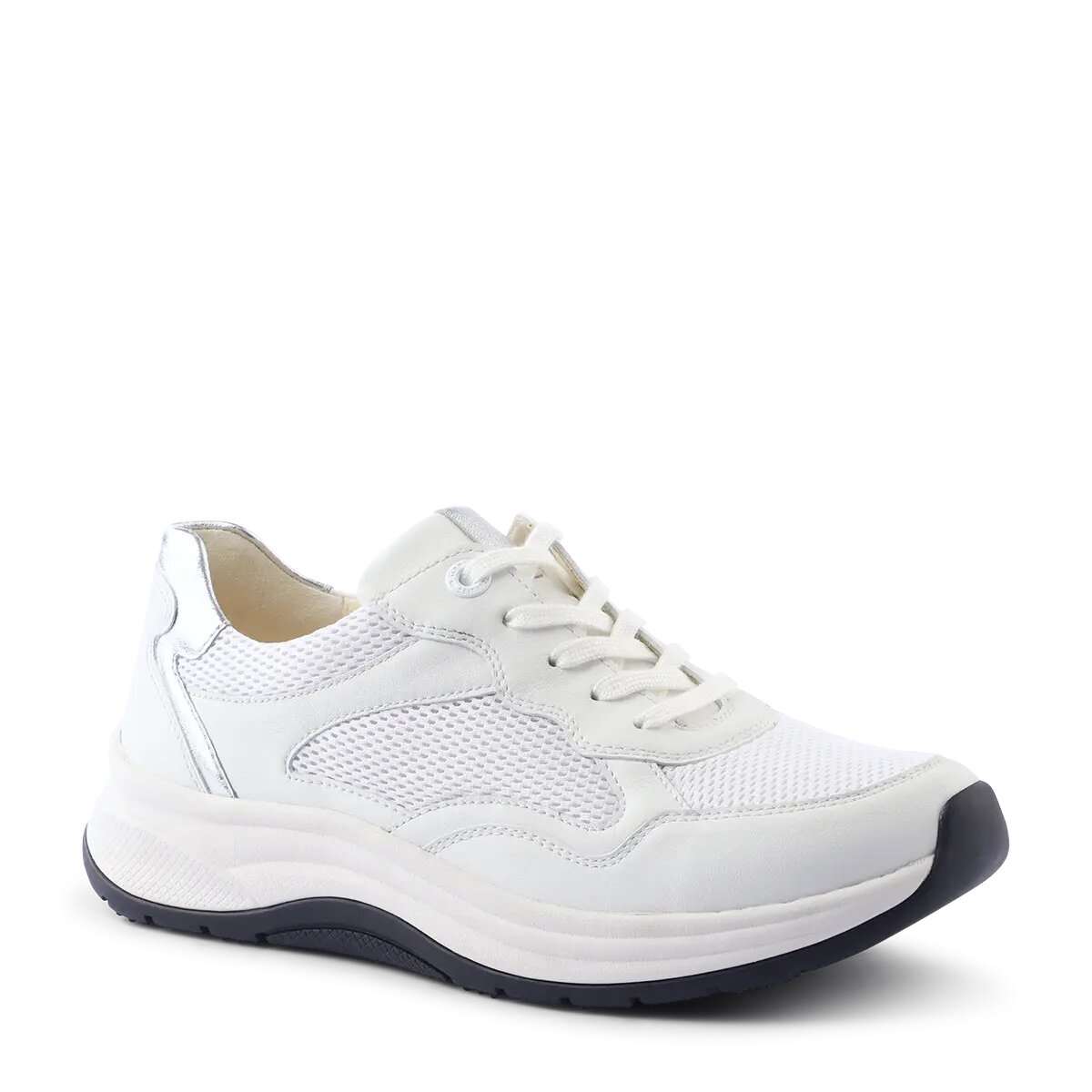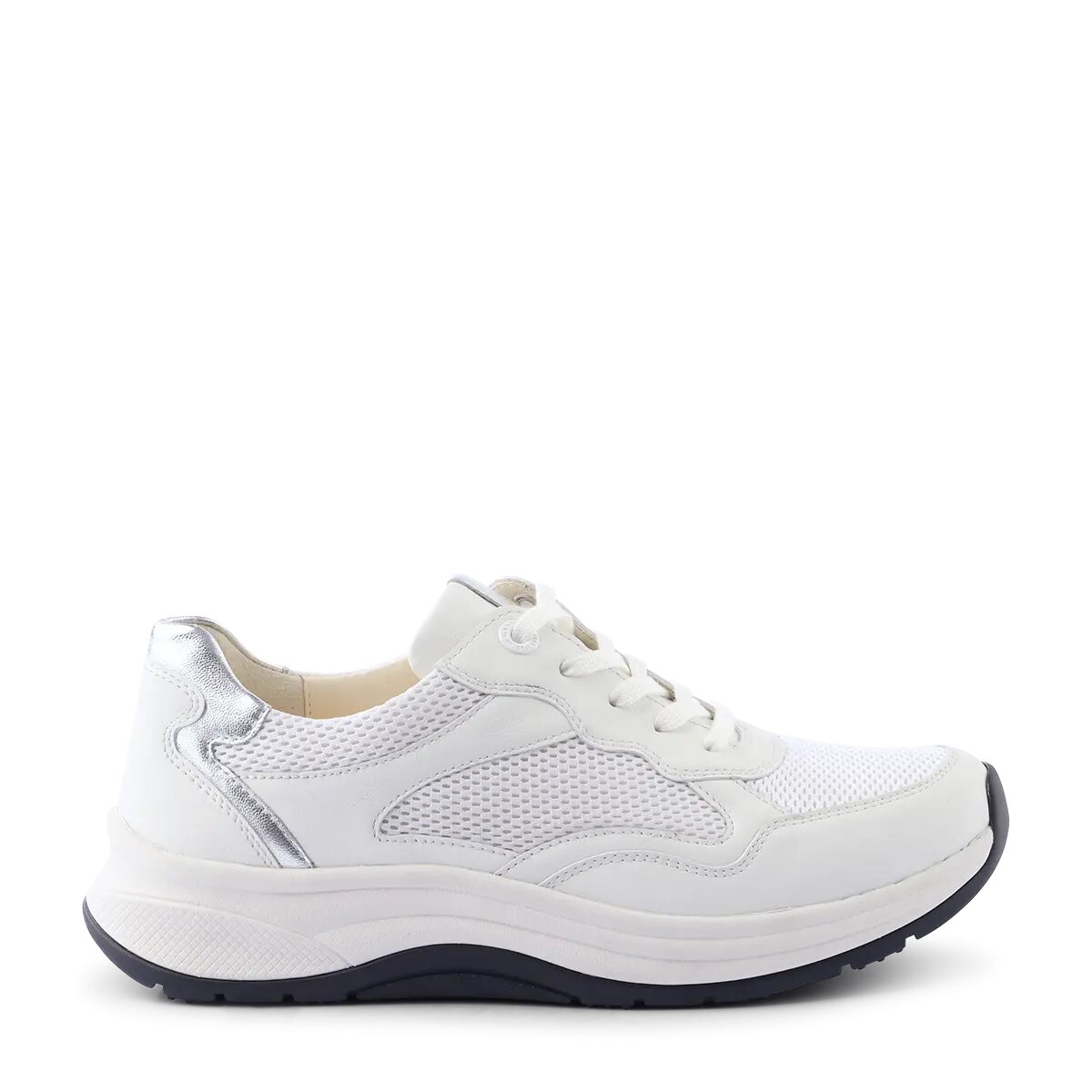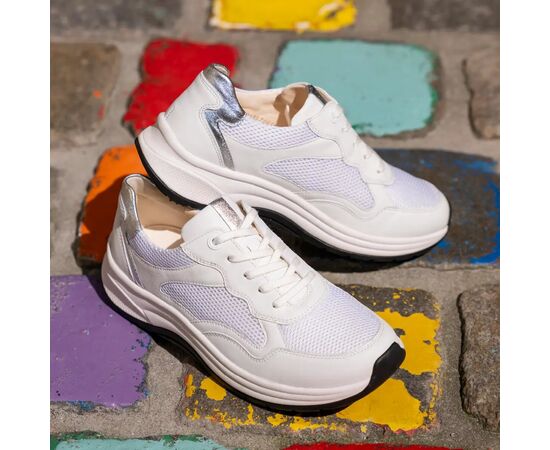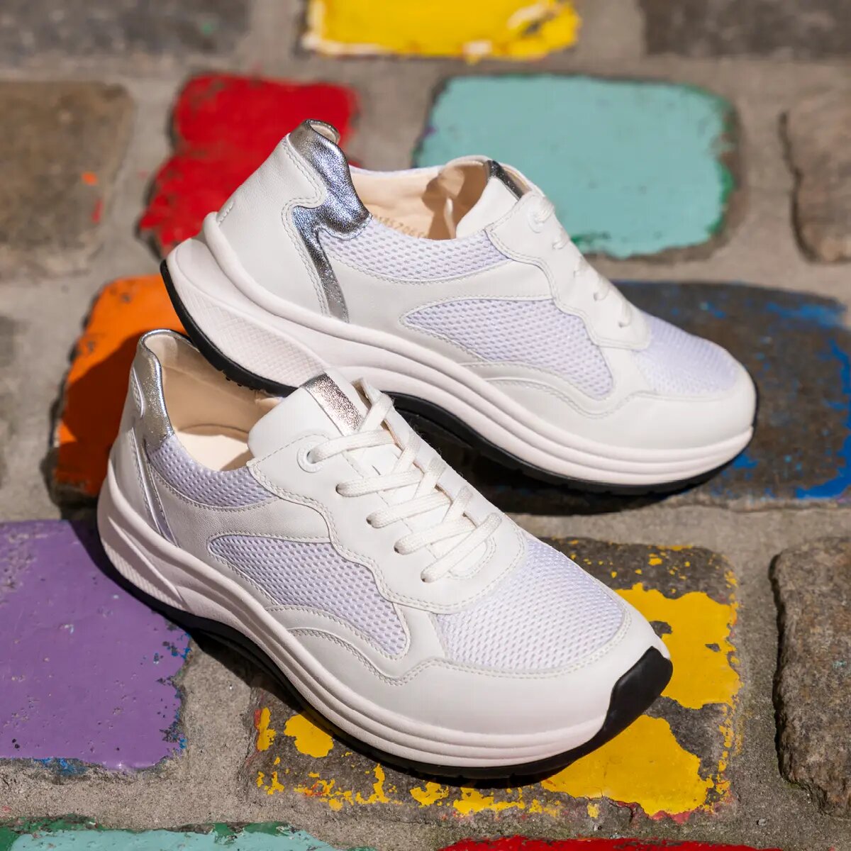 Модель High Flyer це міцні та сучасні кросівки, з запатентованою технологією Ganter Aktiv, які дозволяють активно формувати своє дозвілля — для накопичення щоденних кроків на роботі та у вільний час. Виготовлені з крутого поєднання гладкої та металізованої шкіри, біло-срібні жіночі кросівки можна поєднувати різними способами. Спортивно-шикарний силует доповнюють вставки Airmesh.