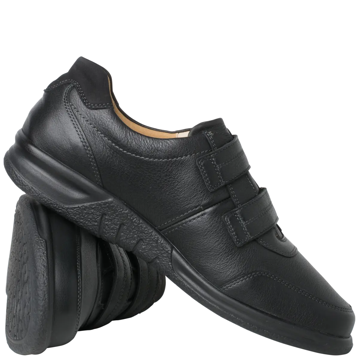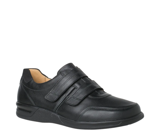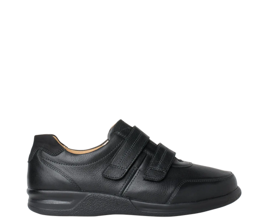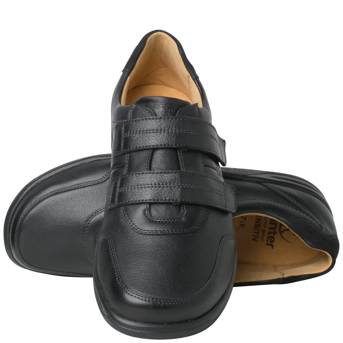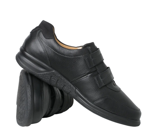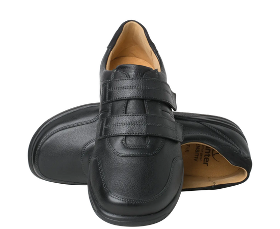 Ортопедичні туфлі GANTER Kurt з серії Sensitiv м'які і комфортні, створені спеціально для дуже чутливих ніг (без давлячих швів та зі спеціальною м'якою устілкою). Виготовлені із чорної шкіри наппа з практичними двома стрічками на липучках дозволяють індивідуально регулювати посадку, зручний універсальний віріант. Ортопедична устілка з'ємна, що дозволяє використовувати індивідуальну ортопедичну устілку. Підошва дуже легка і має відмінну амортизацію. У них Вам буде комфортно в будь-якій ситуації. Це відмінне придбання для гардероба в стилі Casual і для володарів чутливих стоп. Носити взуття цілий день без проблем – KURT робить це можливим!