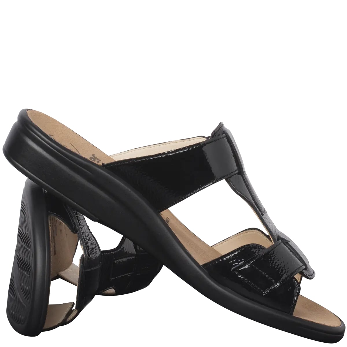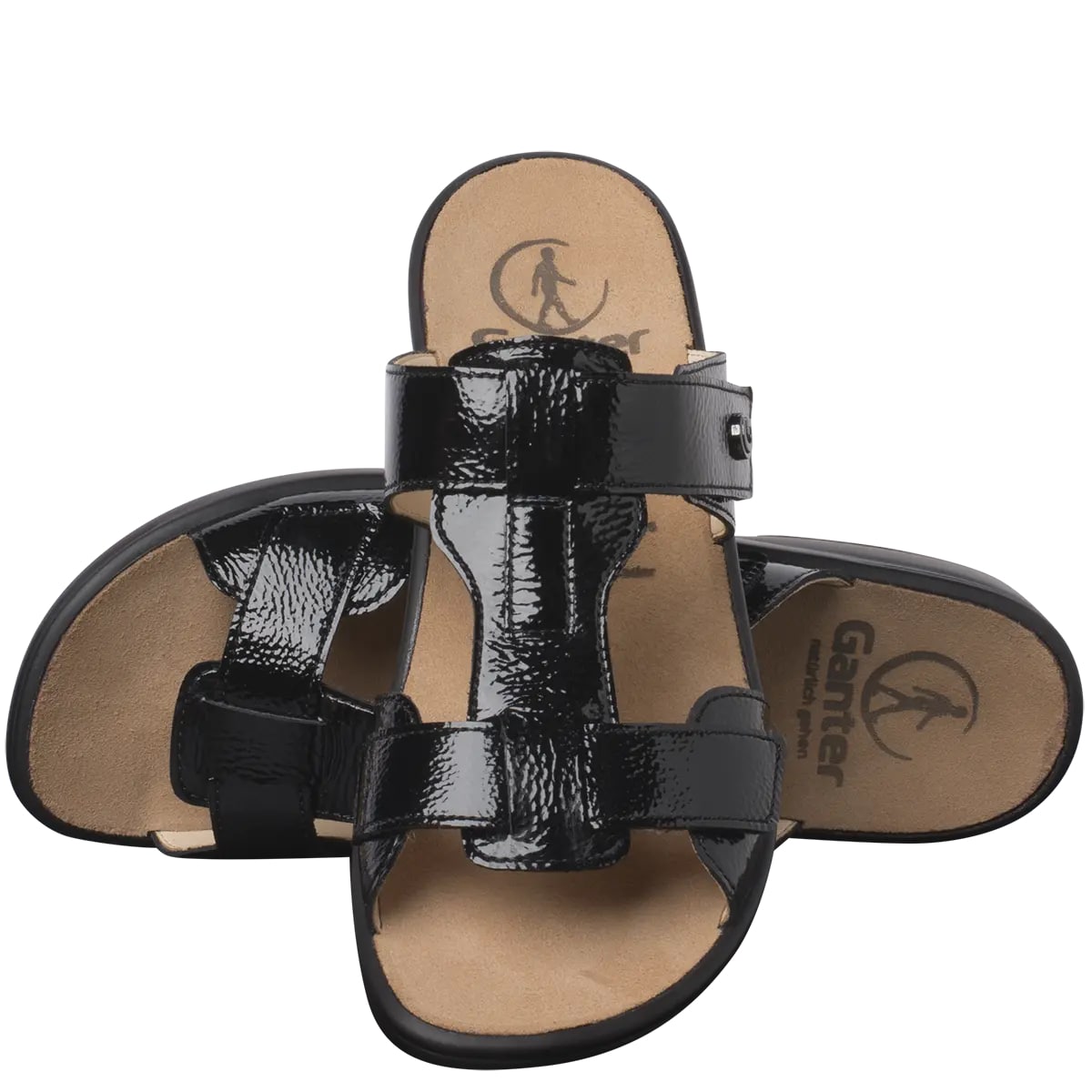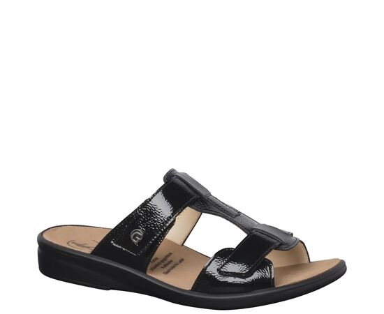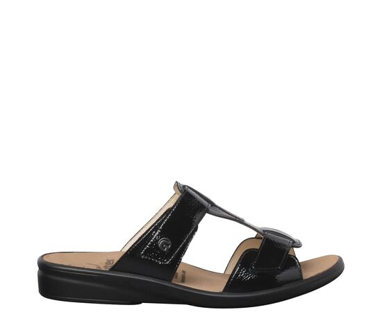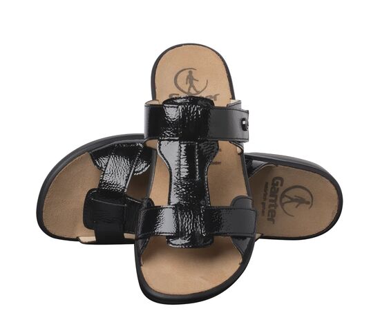 Ортопедичні шльопанці GANTER Sonnika підходять для вузьких ніжок. Вони вирізняються свіжим дизайном, виготовлені із блискучої лакованої шкіри. Два прості, але виразні ремінці забезпечують необхідну підтримку стопи і з'єднані перетинкою. Легка танкетка сприяє вертикальній поставі та дозволяє легко крокувати зранку до вечора. Першокласний комфорт гарантують гнучка шкіряна підкладка та м'яка устілка. Підошва не тільки приємно легка, але й забезпечує відмінну амортизацію, з легкістю поглинаючи нерівності поверхні та удари. Купуючи Sonnika, ви інвестуєте в зручні шльопанці на різні випадки життя.