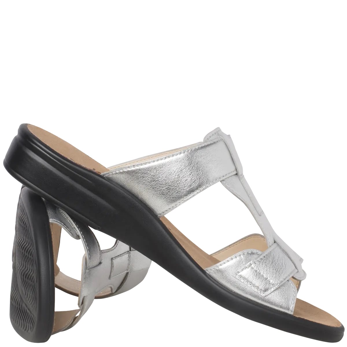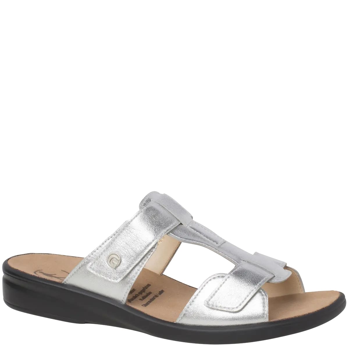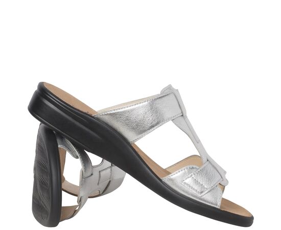 Ортопедичні шльопанці GANTER Sonnika підходять для вузьких ніжок. Вони вирізняються свіжим дизайном, виготовлені зі шкіри Perlato з металевим відливом. Два прості, але виразні ремінці забезпечують необхідну підтримку стопи і з'єднані перетинкою. Легка танкетка сприяє вертикальній поставі та дозволяє легко крокувати зранку до вечора. Першокласний комфорт гарантують гнучка шкіряна підкладка та м'яка устілка. Підошва не тільки приємно легка, але й забезпечує відмінну амортизацію, з легкістю поглинаючи нерівності поверхні та удари. Купуючи Sonnika, ви інвестуєте в зручні шльопанці на різні випадки життя.