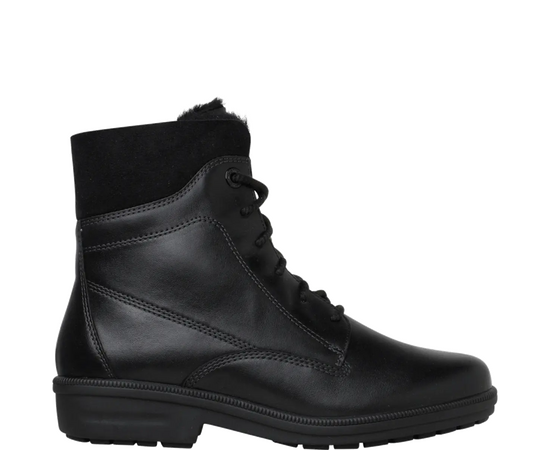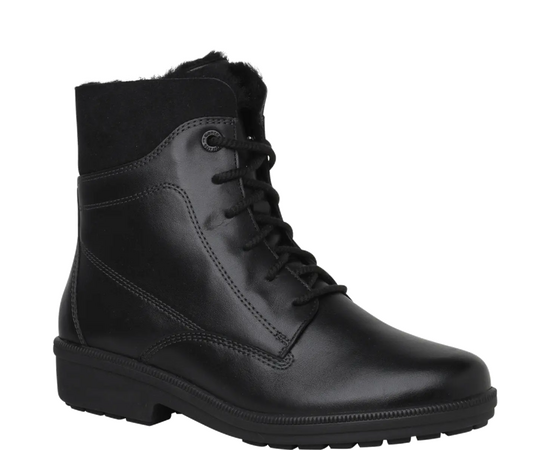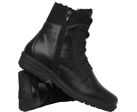 Ортопедичні зимові черевики Kathy від Ganter стильні та комфортні. Виготовлені з чорної гладкої шкіри, ботильйони є ідеальним універсалом у комфортній ширині K. Холодні температури не зашкодять вашим ногам у цьому взутті, завдяки затишній підкладці з овечої вовни, що зігріває їх. Шнурівка створює індивідуальні можливості регулювання, застібка-блискавка робить їх особливо зручними в користуванні. Халяву з пухнастої овечої шкіри можна носити догори або загорнути на черевики. Це означає, що ботильйони не тільки виглядають сучасно, але й наповнювачі допомагають уникнути неприємних точок тиску.