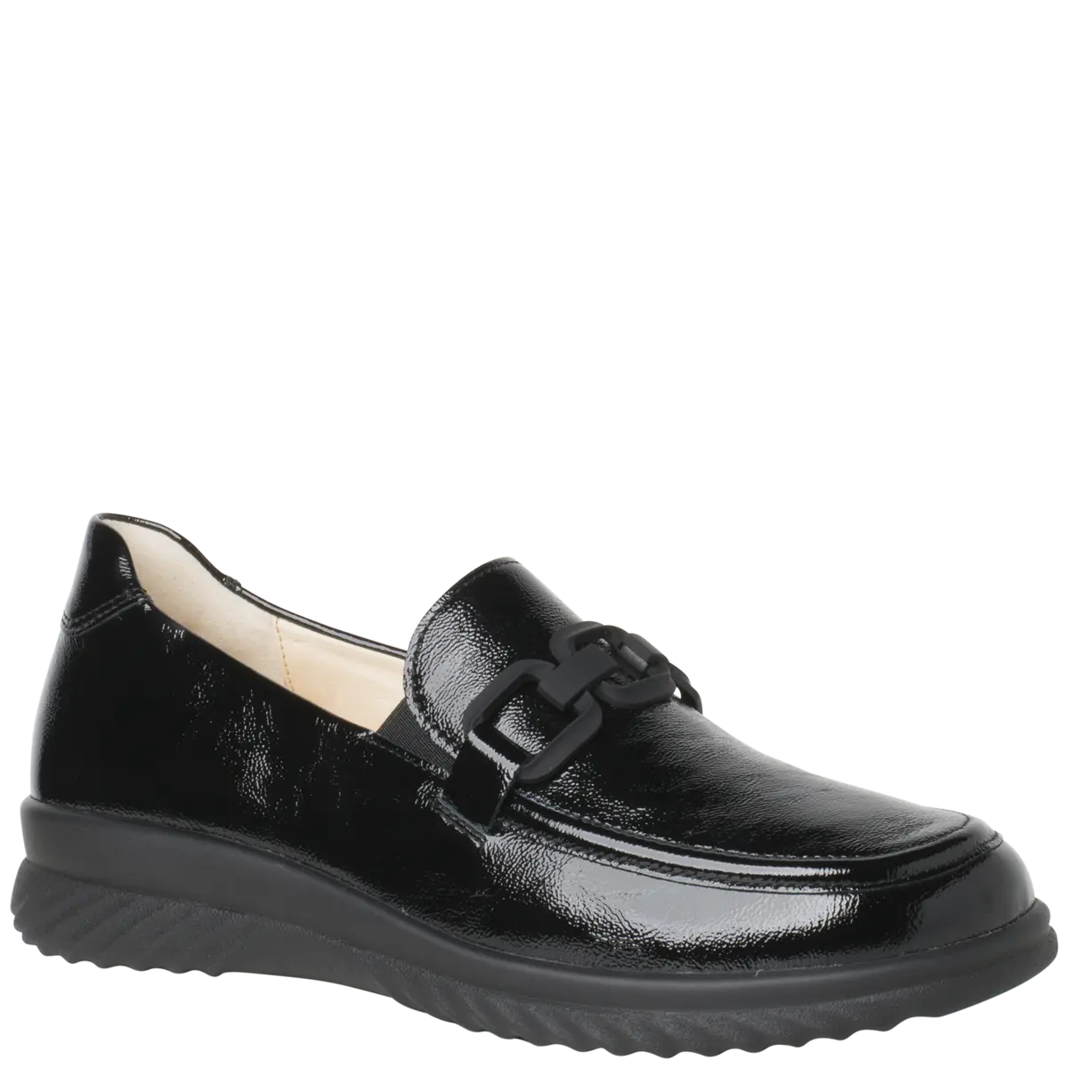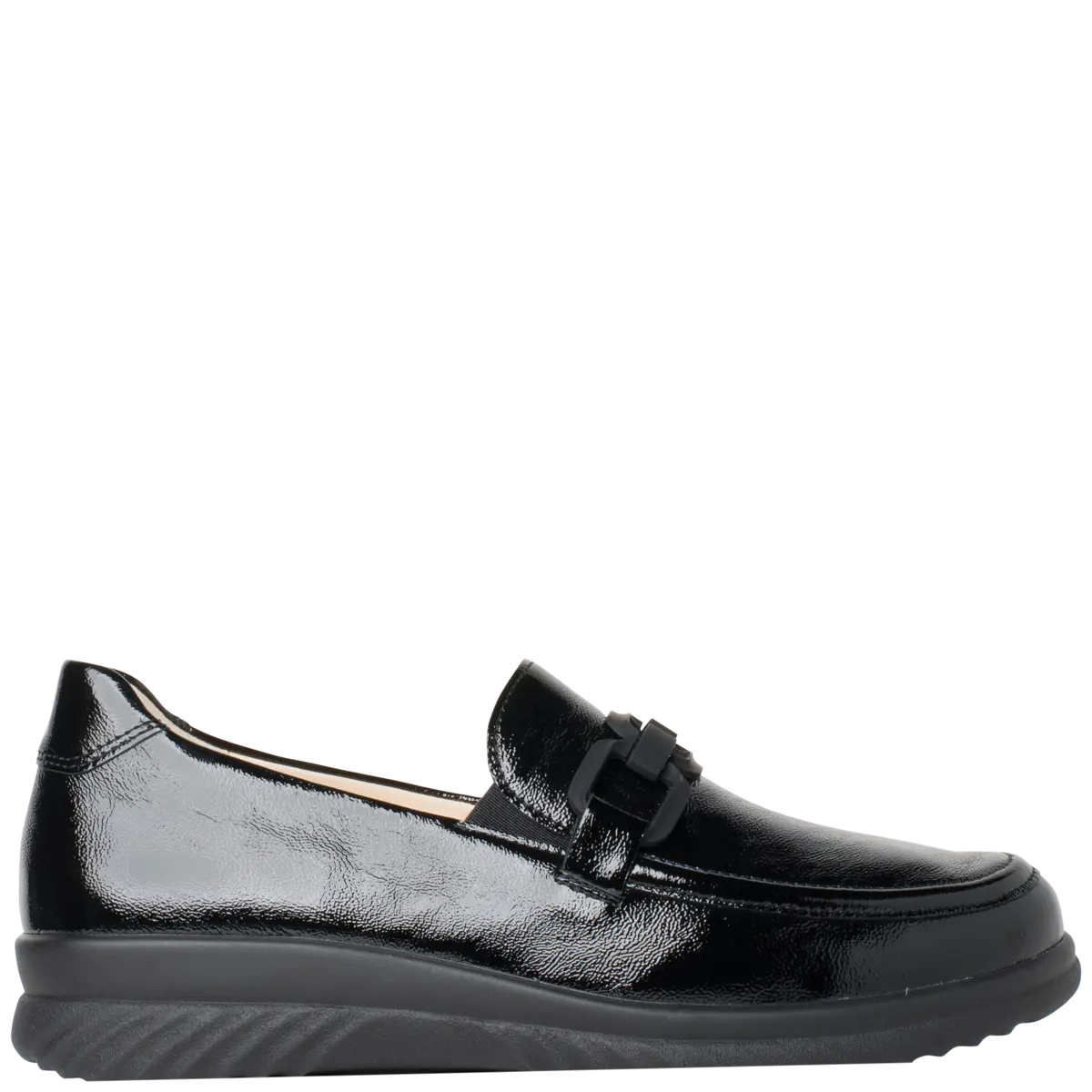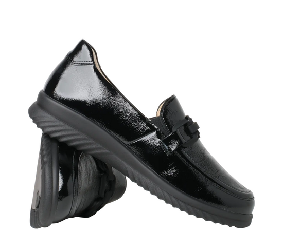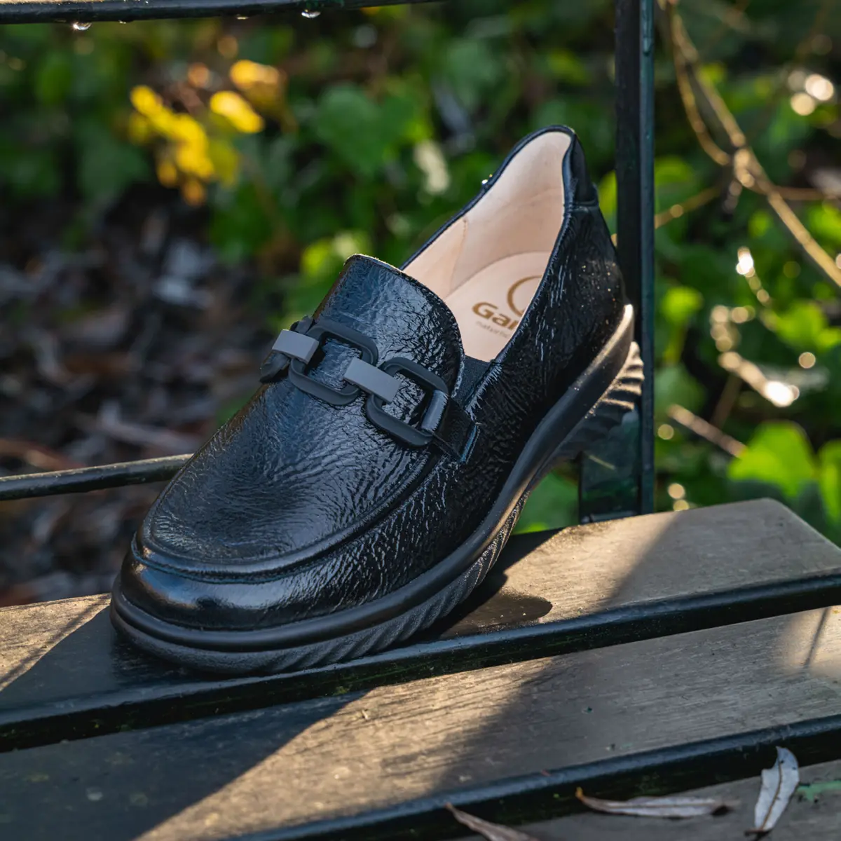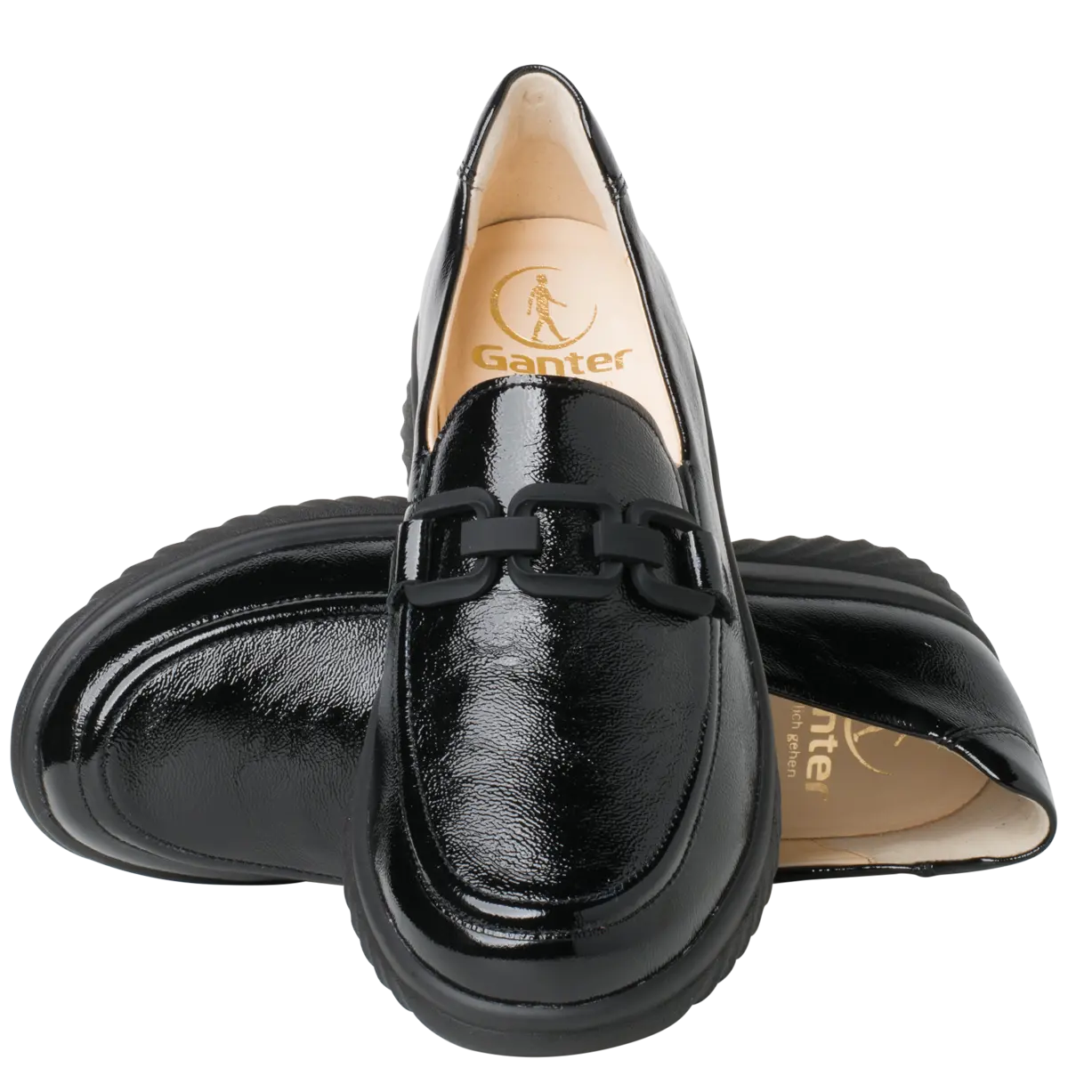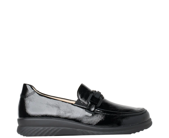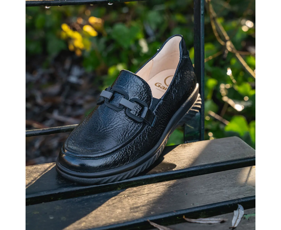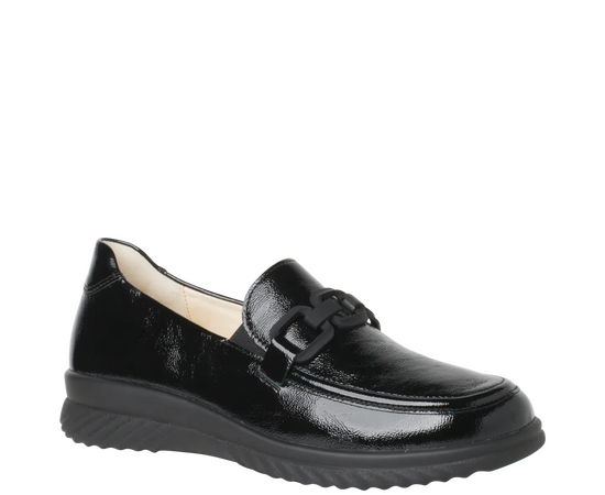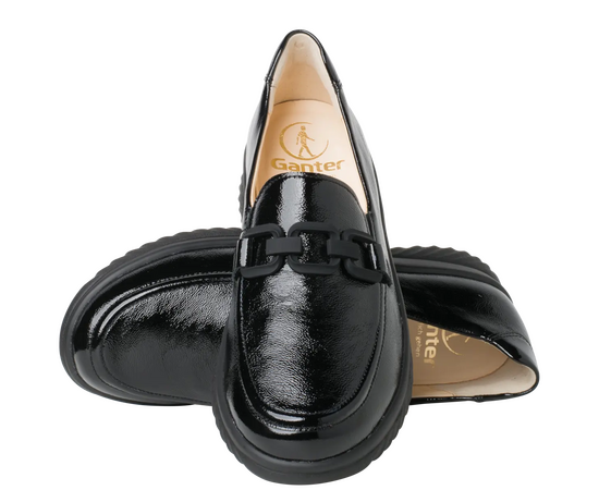 Ортопедичні жіночі туфлі Heike від Ganter елегантний компаньйон із сучасної лакованої шкіри. Зручна універсальна модель, що привертає увагу в класичному чорному кольорі. Стримані прикраси в тон моделі підкреслюють елегантний вигляд, тоді як форма виглядає спортивною, простий витончений дизайн робить лофери незамінним фаворитом для багатьох випадків. Ширина H згладжує широку стопу, а вузька п’ята забезпечує необхідну підтримку, щоб можна було без проблем долати довші відстані пішки. Завдяки висоті каблука 25 мм підтримується опорно-руховий апарат, і в той самий час ви отримуєте користь від невеликої додаткової висоти. Внутрішня підкладка виготовлена з маслянистої м'якої шкіри, яка володіє багатьма позитивними властивостями. Матеріал дихаючий, міцний і приємний до шкіри.