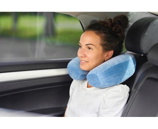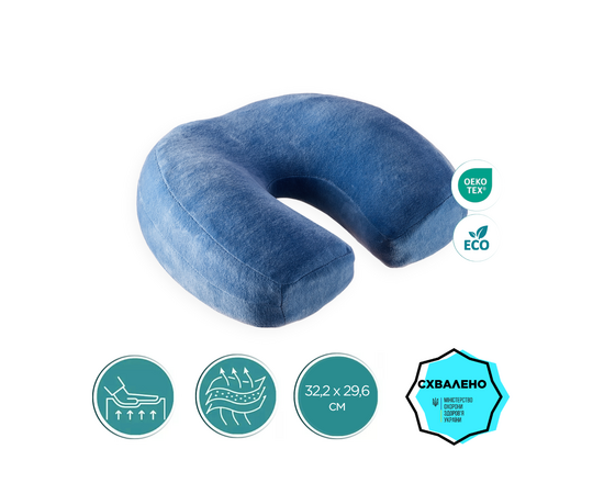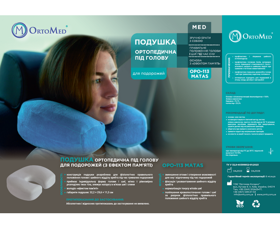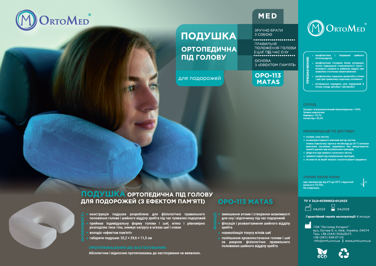 - ортопедична подушка для подорожей торгової марки Ortomed виготовлена з високоякісної піни, яка повторює і набуває форми шиї людини, обволікаючи її з усіх боків, максимально розвантажує шийний відділ хребта під час подорожей, забезпечує фізіологічно правильне положення голови та шийного відділу хребта під час тривалих подорожей у літаку, поїзді чи автомобілі.