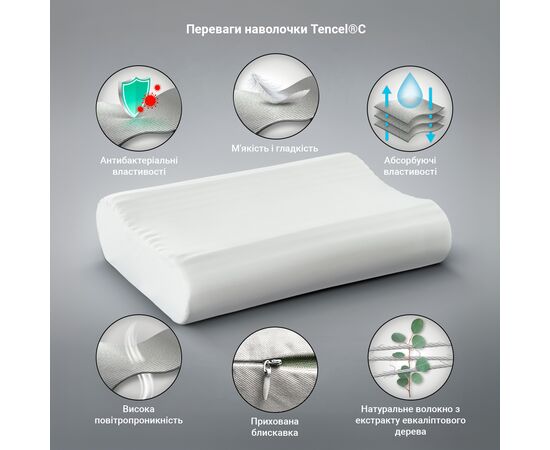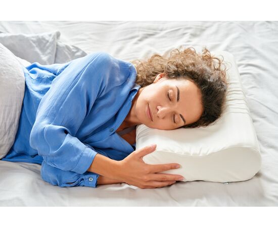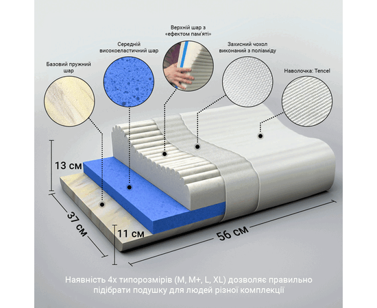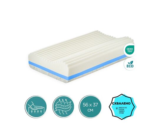 - верхній шар з «ефектом пам'яті» і валиками різної висоти забезпечує правильне положення голови та шиї, дарує відчуття невагомості, не перешкоджає повітрообміну