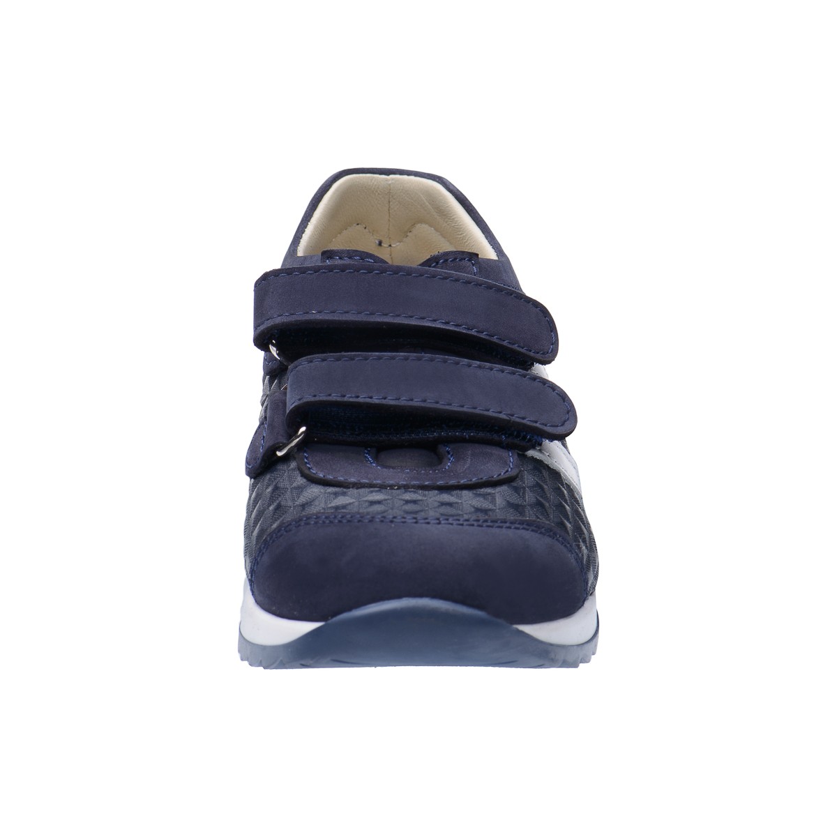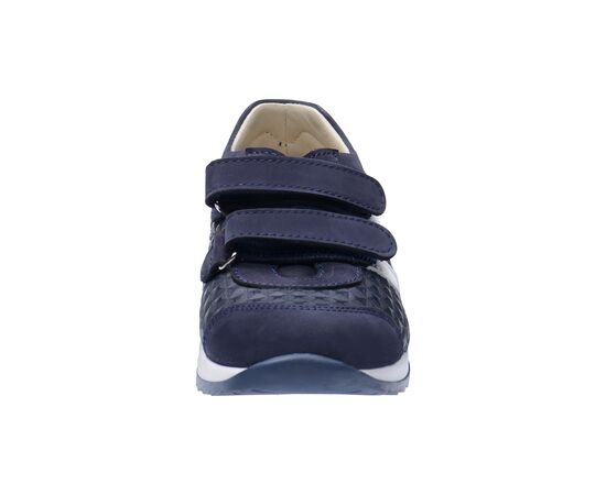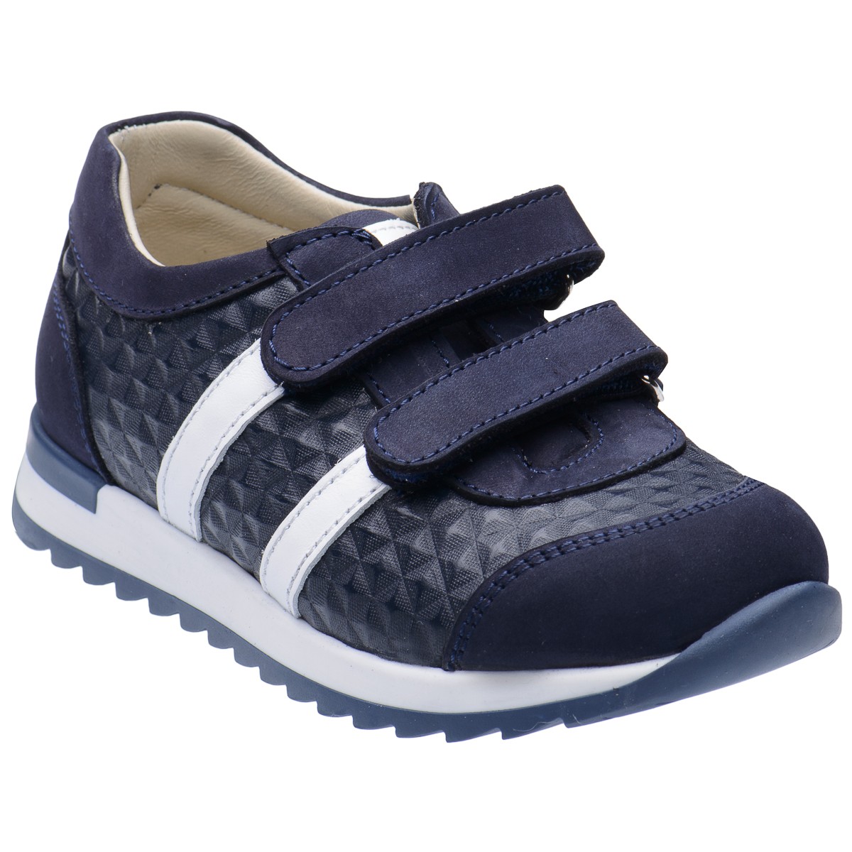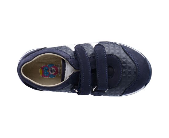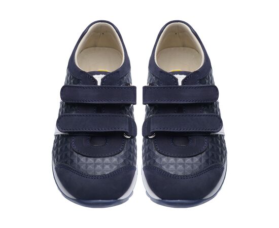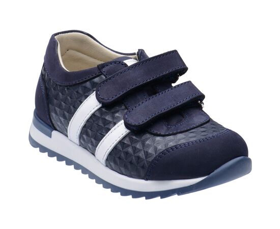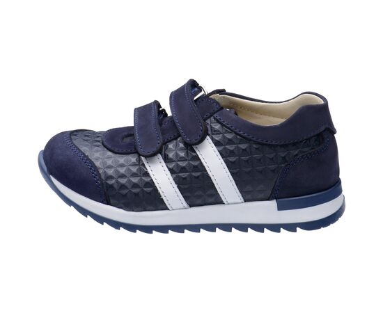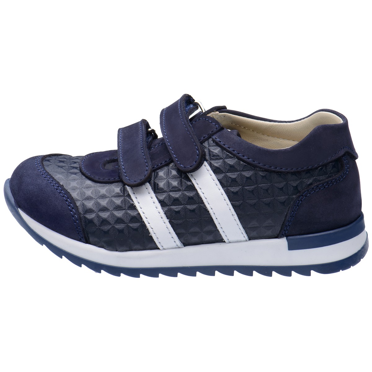 Theo Leo 0016 - кросівки виконані з натуральної шкіри темно синього кольору. Модель декорована вставками з нубуку темно синього кольору і білими зі шкіри. Устілка і підкладка - натуральна шкіра. Присутній анатомічний супінатор, модель на липучках. Підошва біло-синього кольору виконана з термопластичної гуми, не ковзає і добре амортизує.