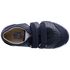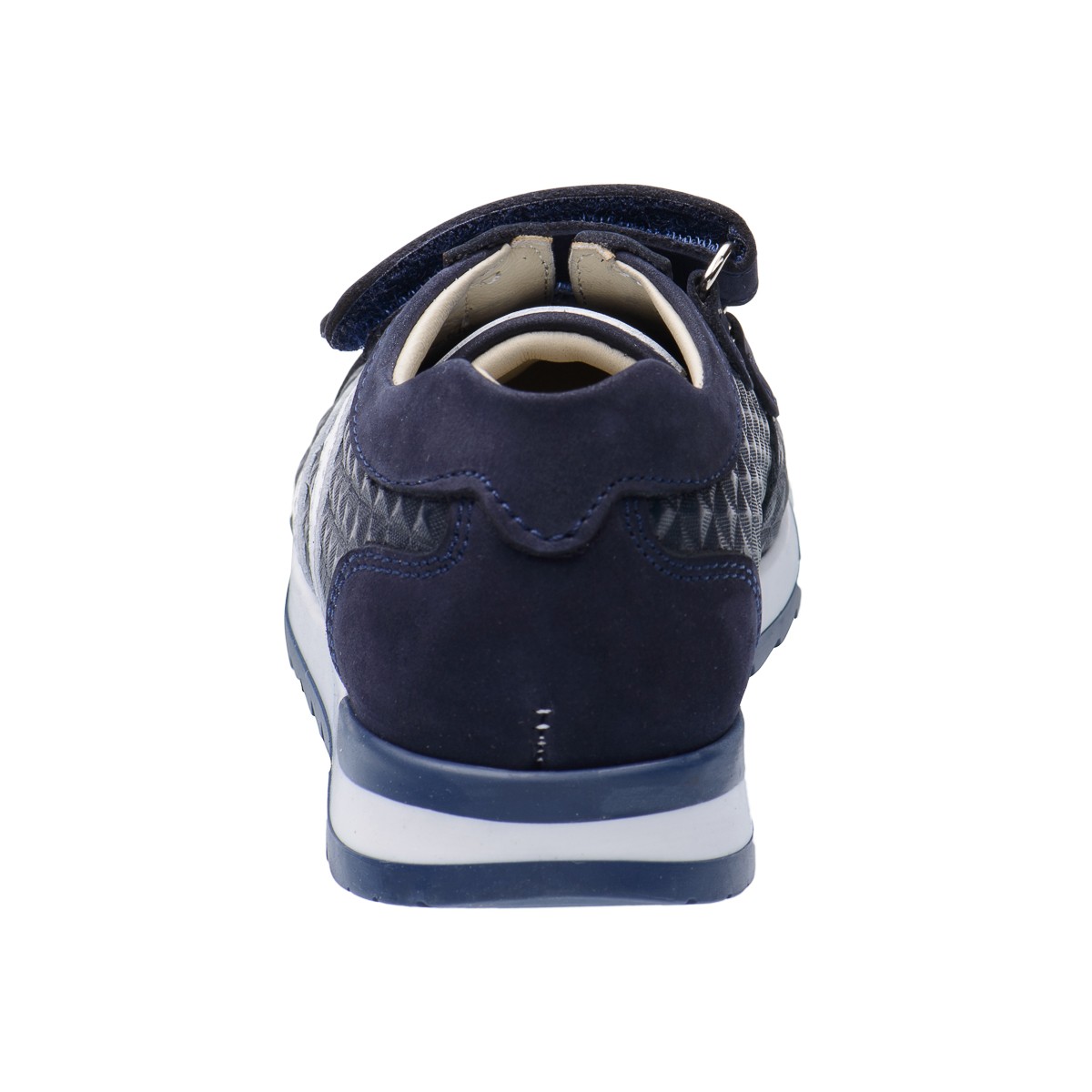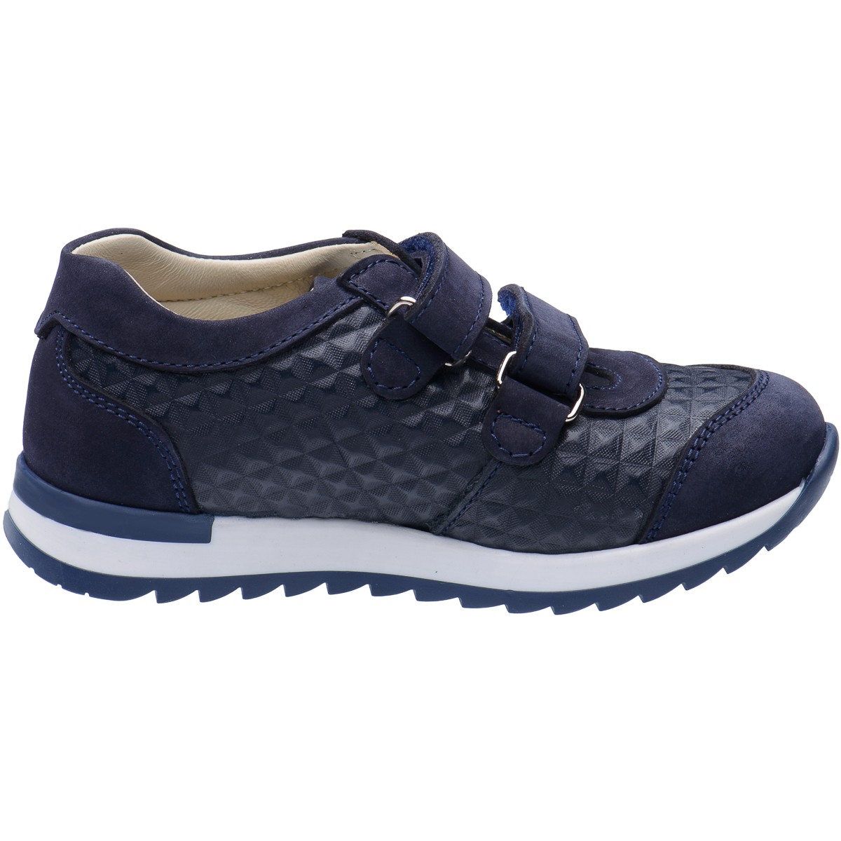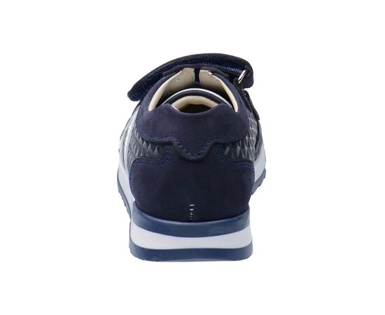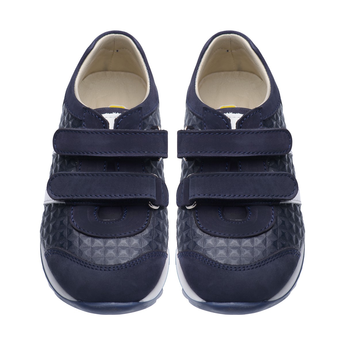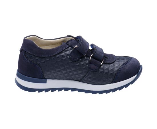 Theo Leo 0016 - кросівки виконані з натуральної шкіри темно синього кольору. Модель декорована вставками з нубуку темно синього кольору і білими зі шкіри. Устілка і підкладка - натуральна шкіра. Присутній анатомічний супінатор, модель на липучках. Підошва біло-синього кольору виконана з термопластичної гуми, не ковзає і добре амортизує.