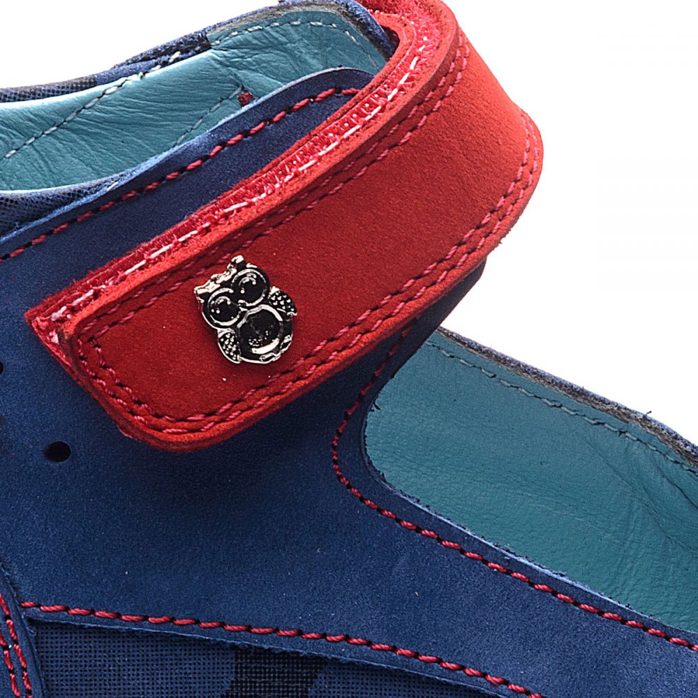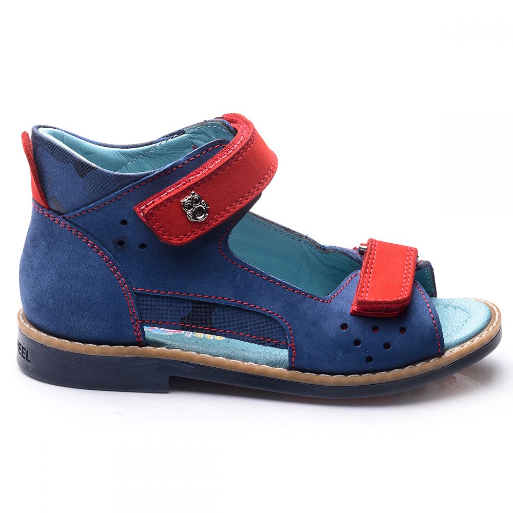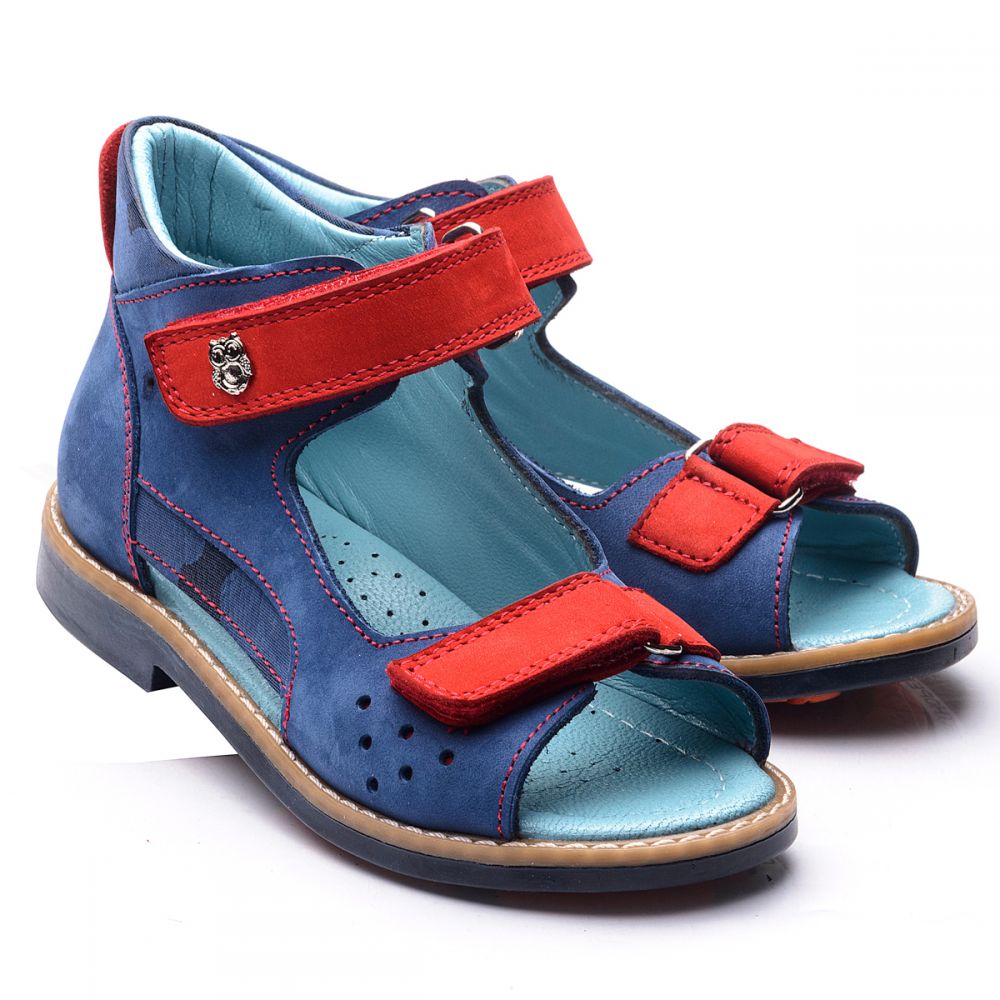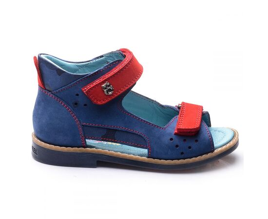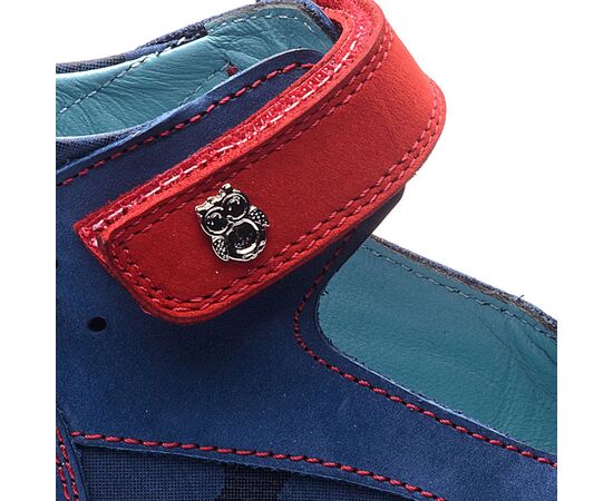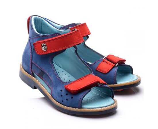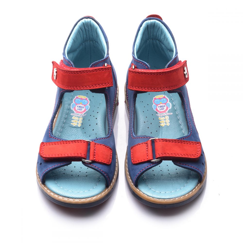Theo Leo 667 дитячі босоніжки виготовлені з натурального нубука синього кольору. Модель доповнюють вставки із червоного нубука. Взуття прикрашене незвичайним червоним рядком. Босоніжки будуть чудово виглядати з будь-яким літнім одягом Вашого малюка!