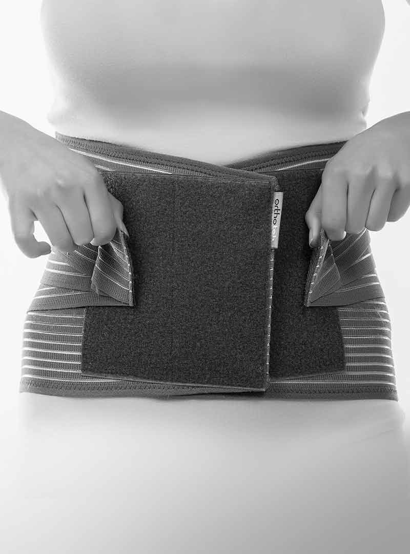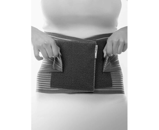 4. Захопіть та потягніть потрійні планки для додаткового кріплення вперед. Зафіксуйте їх на місці спереду. Регулюйте ступінь кріплення доти, доки не відчуєте, що Back Brace Extra Max стабільно та комфортно прилягає до тіла. У деяких випадках рекомендується одягати конструкцію лежачи.