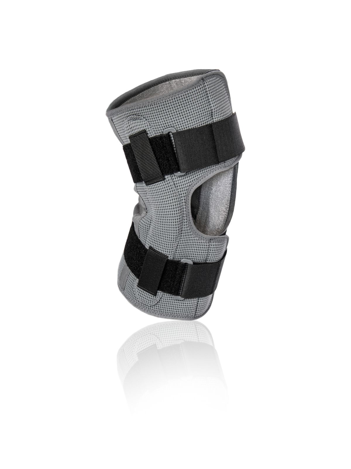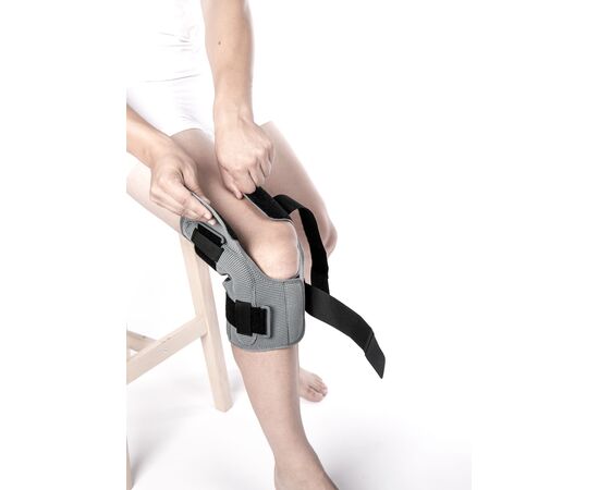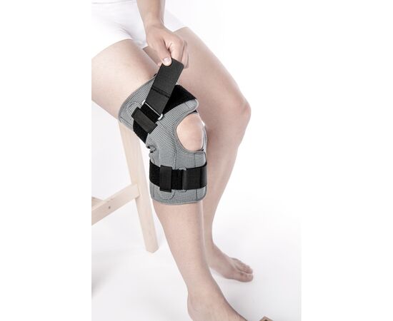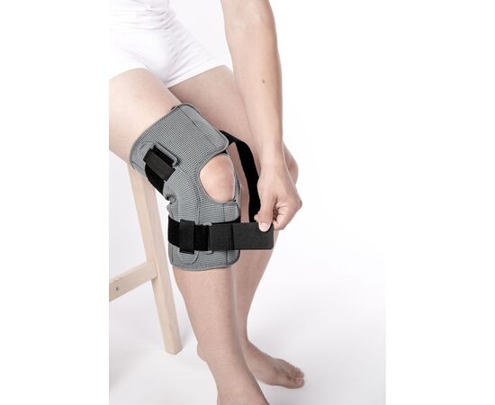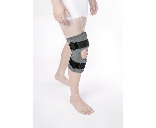 Открытая конструкция для простого надевания. Позволяет более точное расположение в соответствии с индивидуальными размерами бедра. По обе стороны от сустава расположены два алюминиевых шарнира длиной 26 см, стабильно фиксирующие боковые связки колена. Наколенник имеет две застежки-липучки вокруг конечности, расположенные ниже и выше коленного сустава. Регулировка застежки осуществляется двумя пряжками.