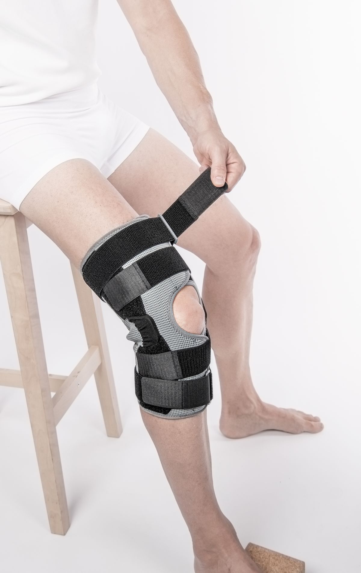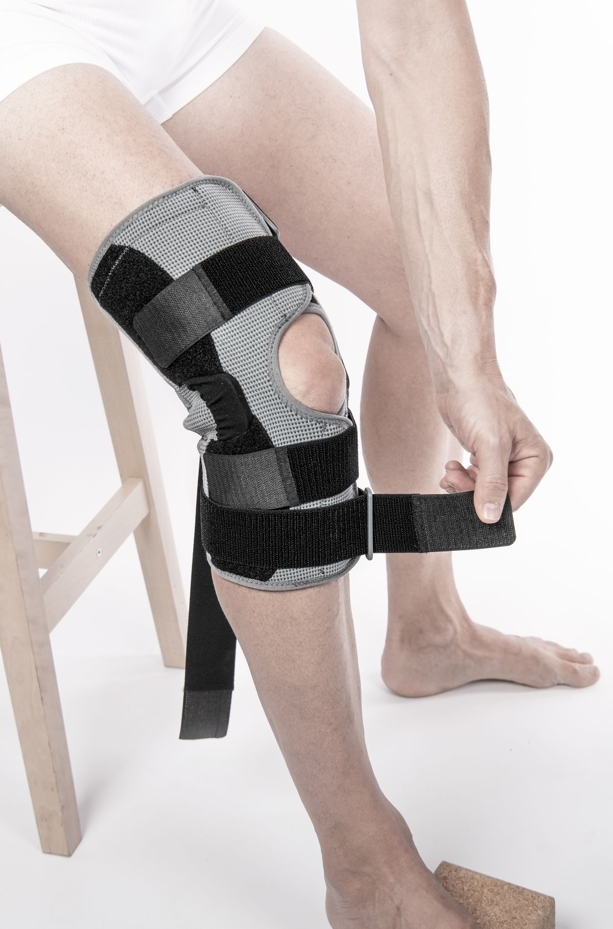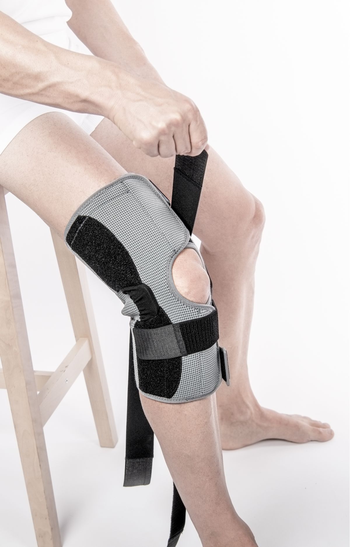 - Первой закрепите липучку ниже колена, затем закрепите липучку над коленом.