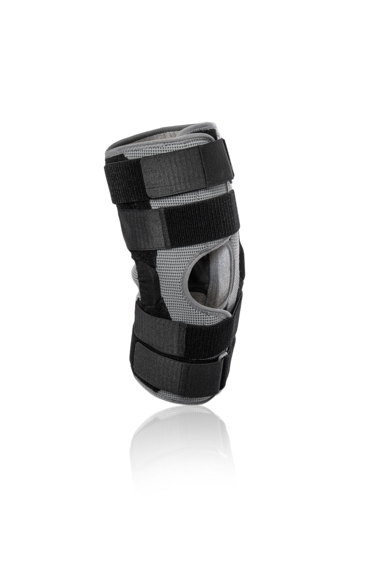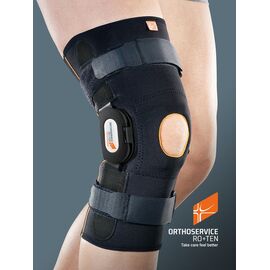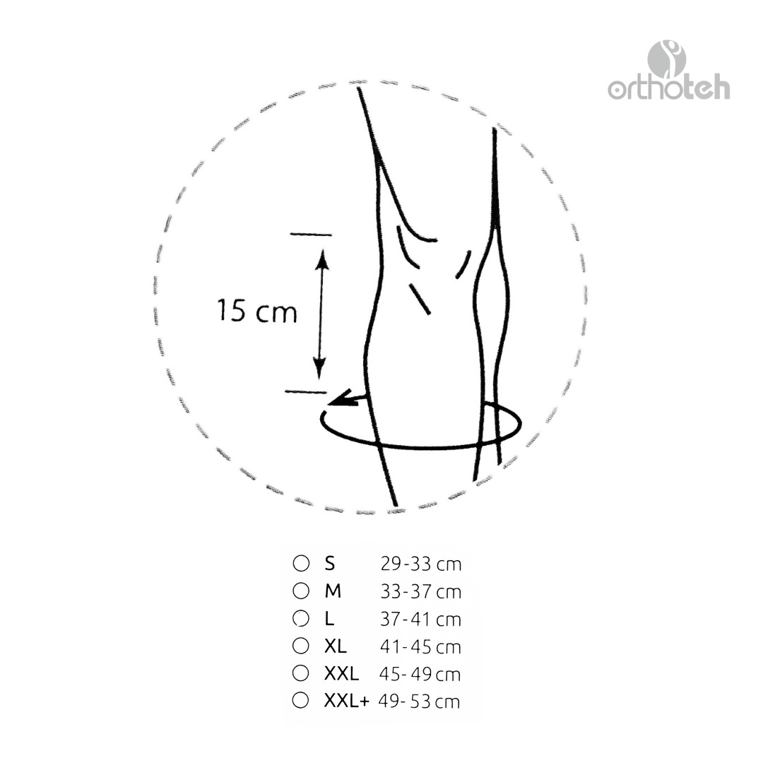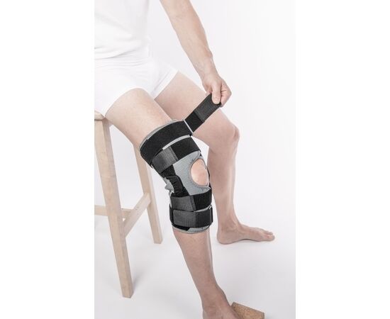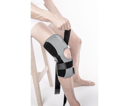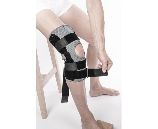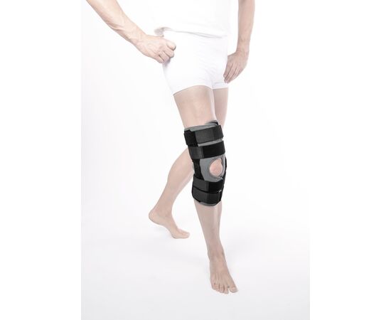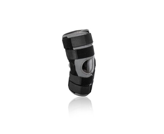 Бандаж на коленный сустав усиленный длинный Knee Brace Long Orthoteh изготовлен из воздухопроницаемого и эластичного материала. Это сочетание эластичных и неэластичных элементов, которые обеспечивают высокий уровень стабилизации колена. Коленную чашечку защищает кольцо анатомической формы которое прекрасно стабилизирует участок. Два алюминиевые механизмы расположены с обеих сторон сустава, которые обеспечивают физиологический диапазон движений. Фиксация осуществляется с помощью четырех полуэластичных застежек с липучками. Такая конструкция защищает как боковые, так и внутриколенные связки от перегрузки. Для более устойчивого расположения вшиты силиконовые детали.