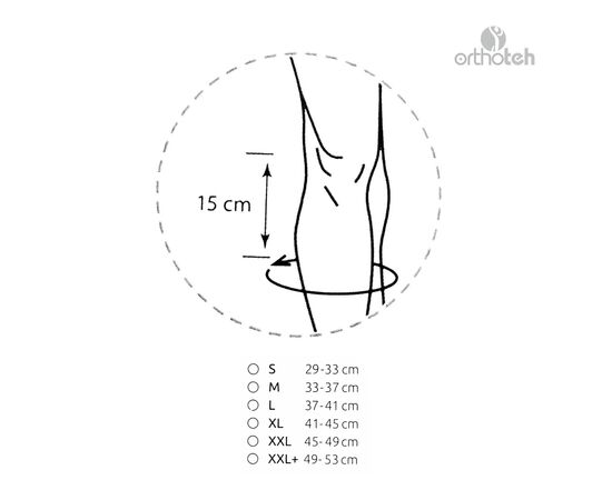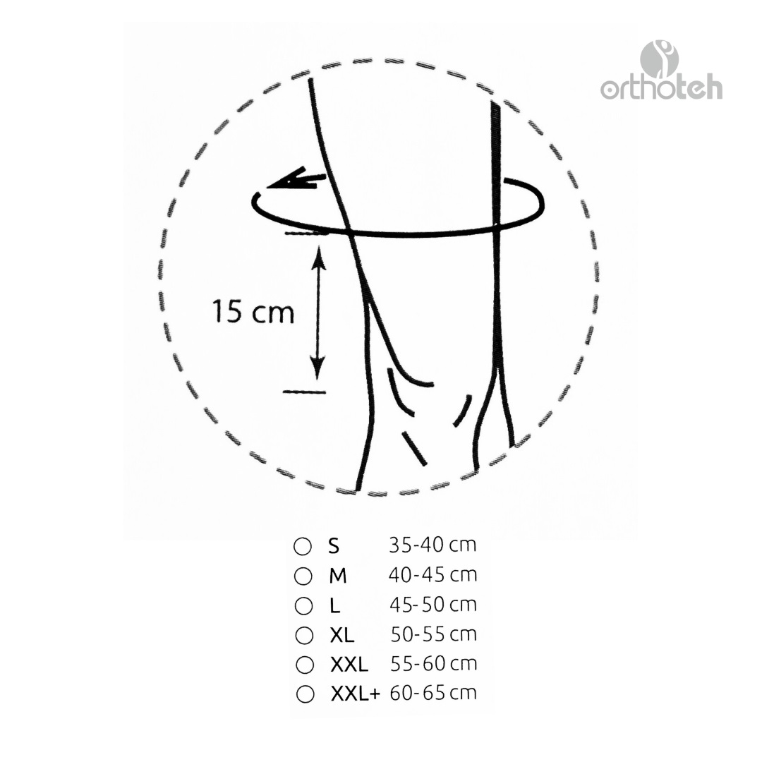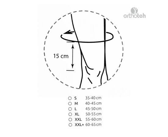 Таблица размеров: для подбора следует измерить окружность голени и бедра на расстоянии 15 см от центра коленной чашечки