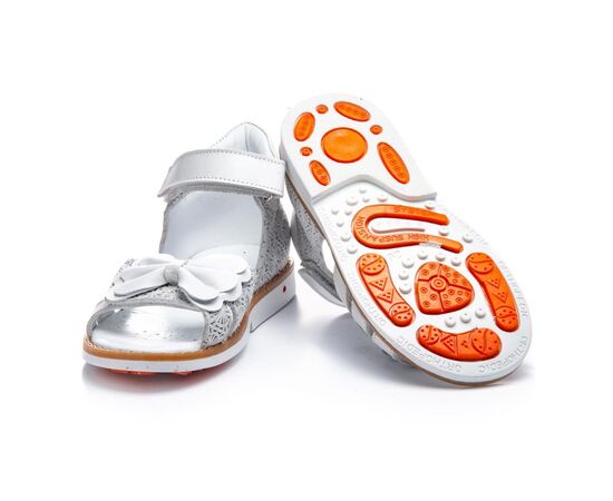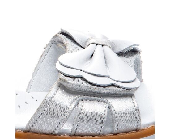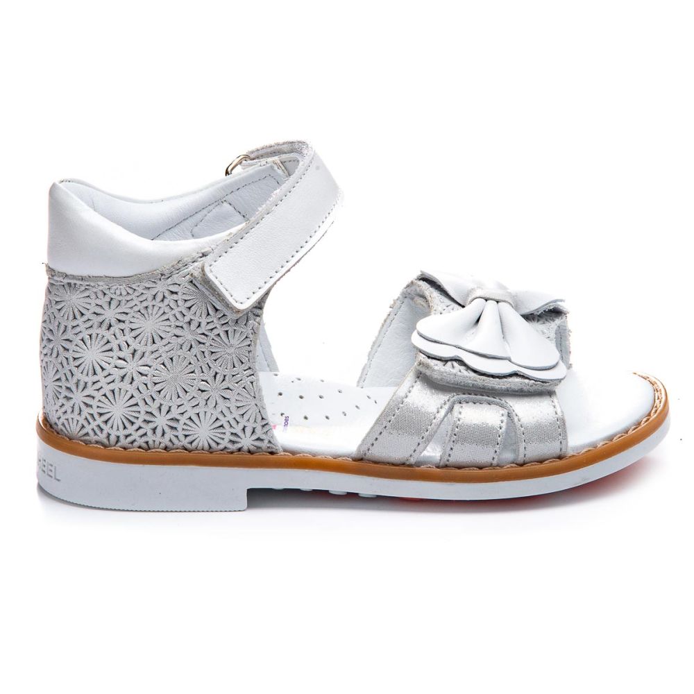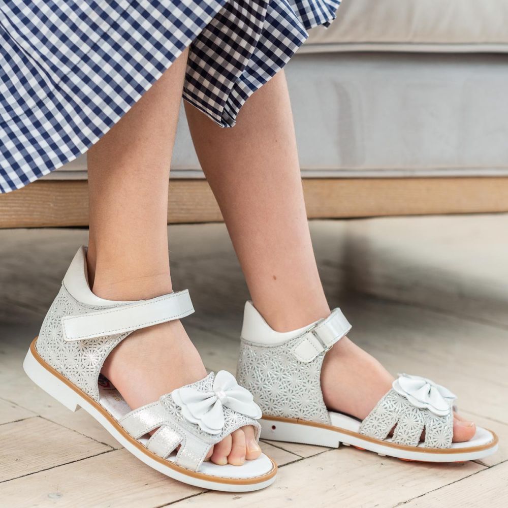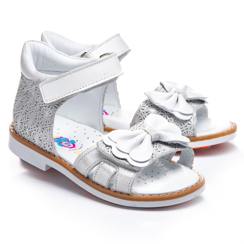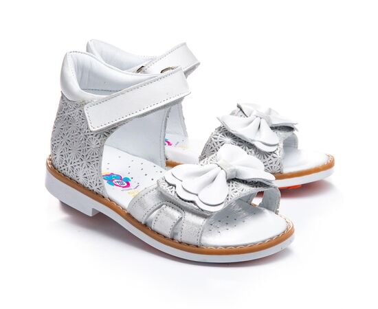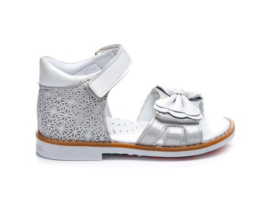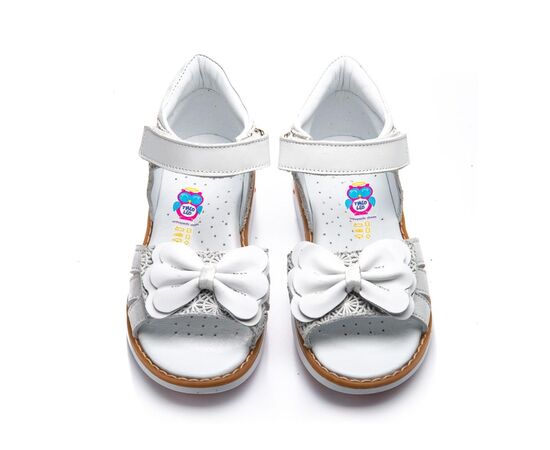 Босоножки Theo Leo 1100 - красивая обувь для девочки из натуральной кожи белого цвета со стильной перфорацией. Босоножки украшены эффектным бантом. Фиксируется на ноге с помощью двух липучек. Стелька и подкладка – натуральная кожа.