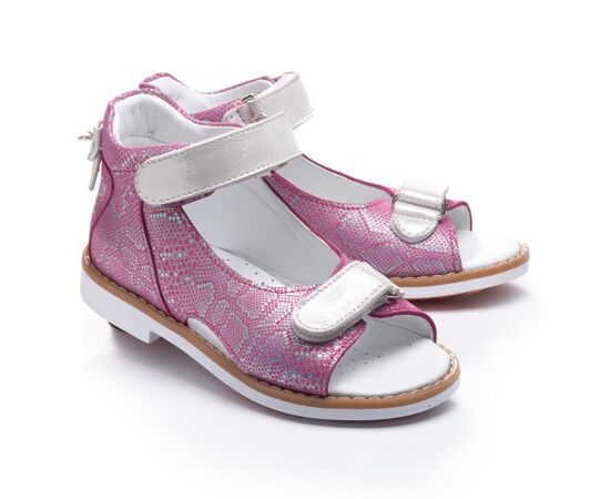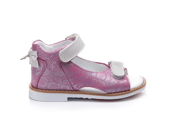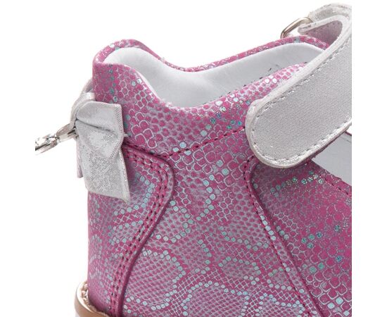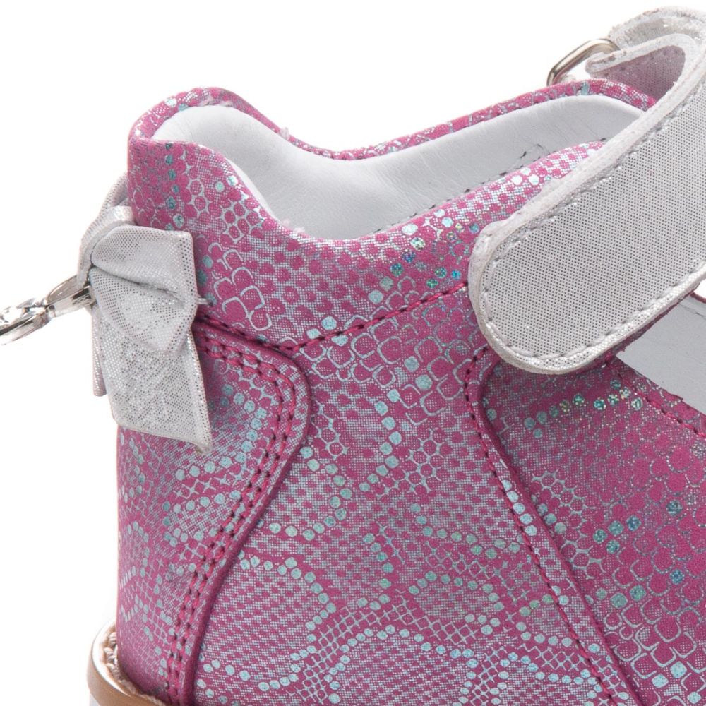 Босоножки Theo Leo 1121 для девочки выполнены из натуральной кожи розового цвета с серебряным принтом. На заднике – декоративный белый бантик. Стелька с анатомическим супинатором и подкладка изготовлена из белой натуральной кожи.
