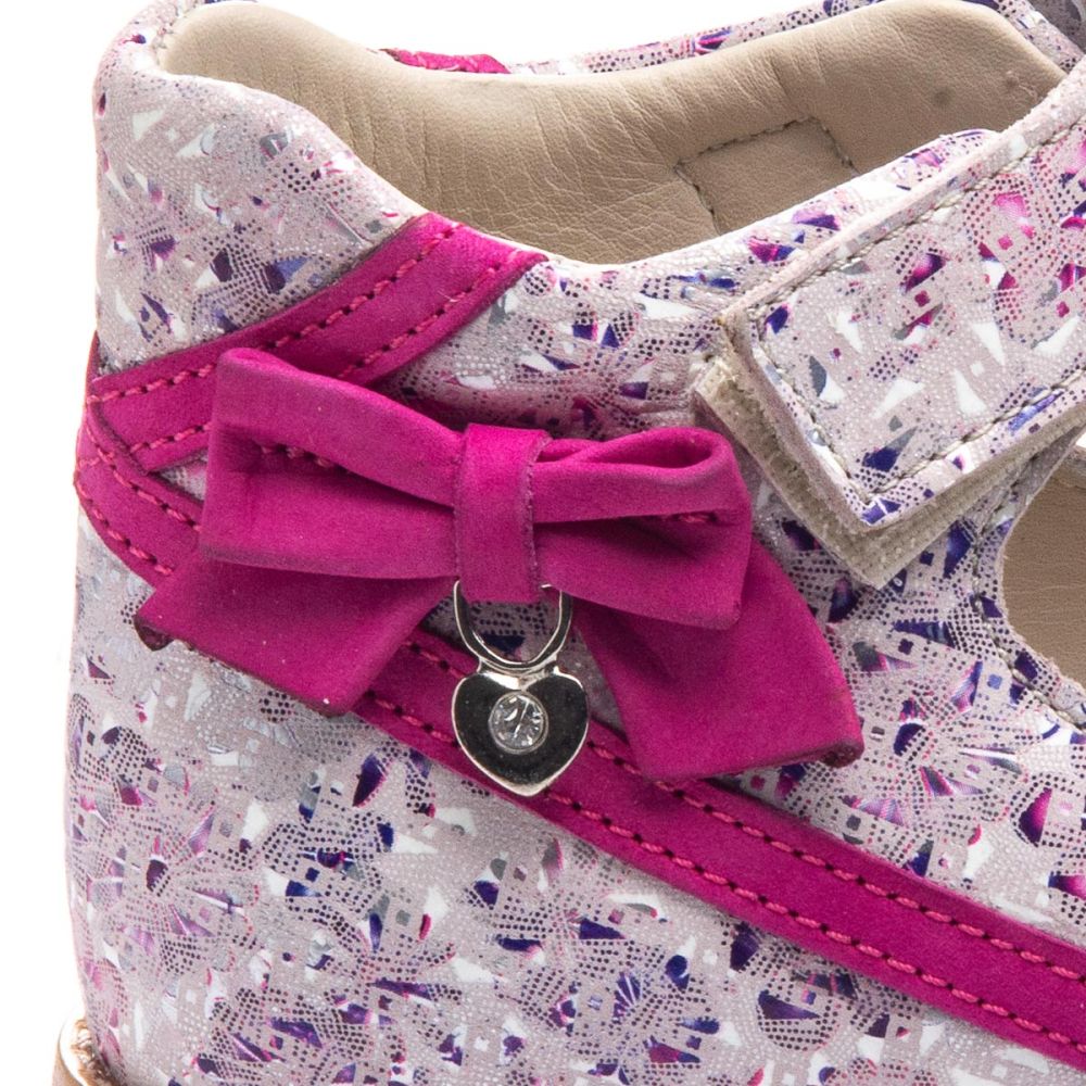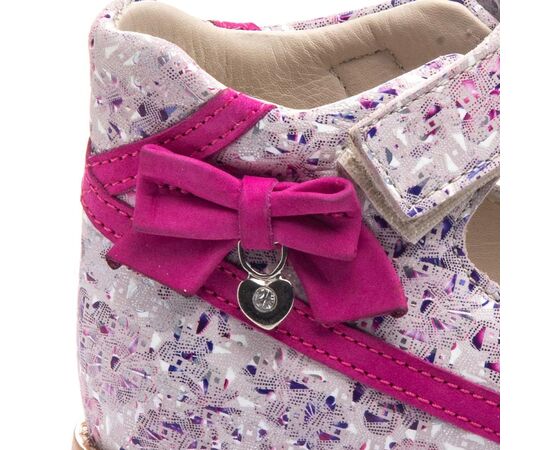 Босоножки Theo Leo 1137 для девочки выполнены из натуральной кожи розового цвета с интересным разноцветным принтом. Украшены декоративным ярким, розовым бантиком. Стелька с анатомическим супинатором и подкладка изготовлена из белой натуральной кожи.
