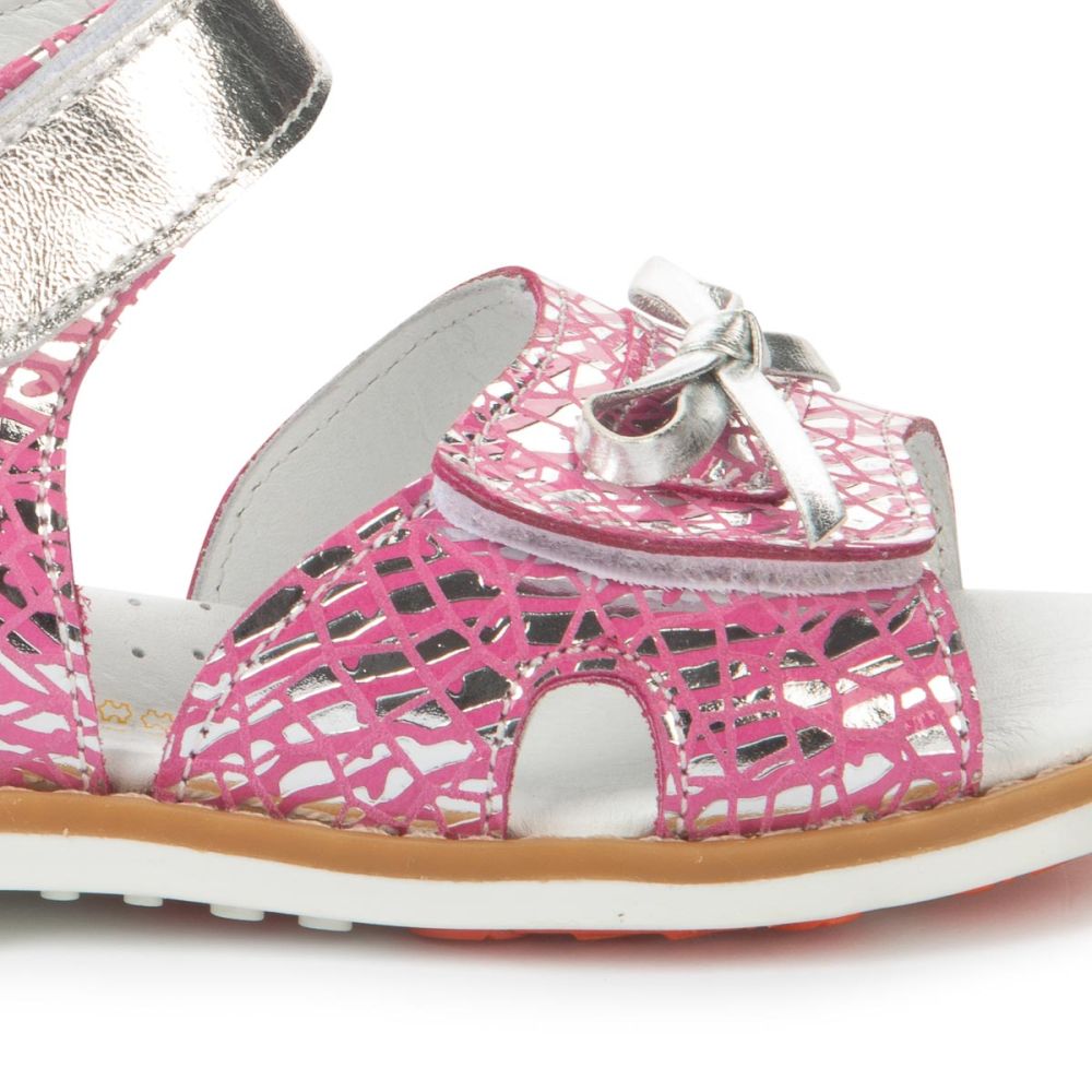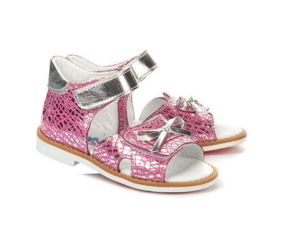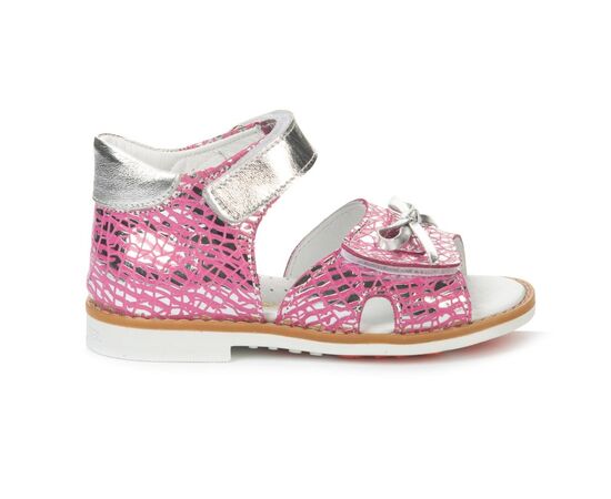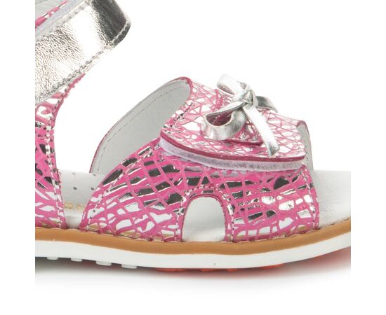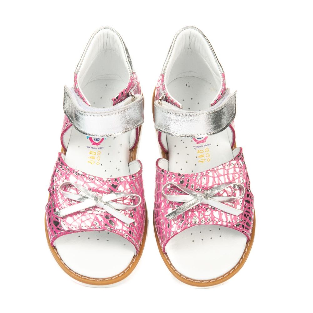 Босоножки Theo Leo 1211 для девочки внутри и снаружи выполнены из натуральной кожи красивого розового цвета с оригинальным принтом с переливом цвета. Украшены выразительными перламутровыми застежками-липучками и милым бантиком.