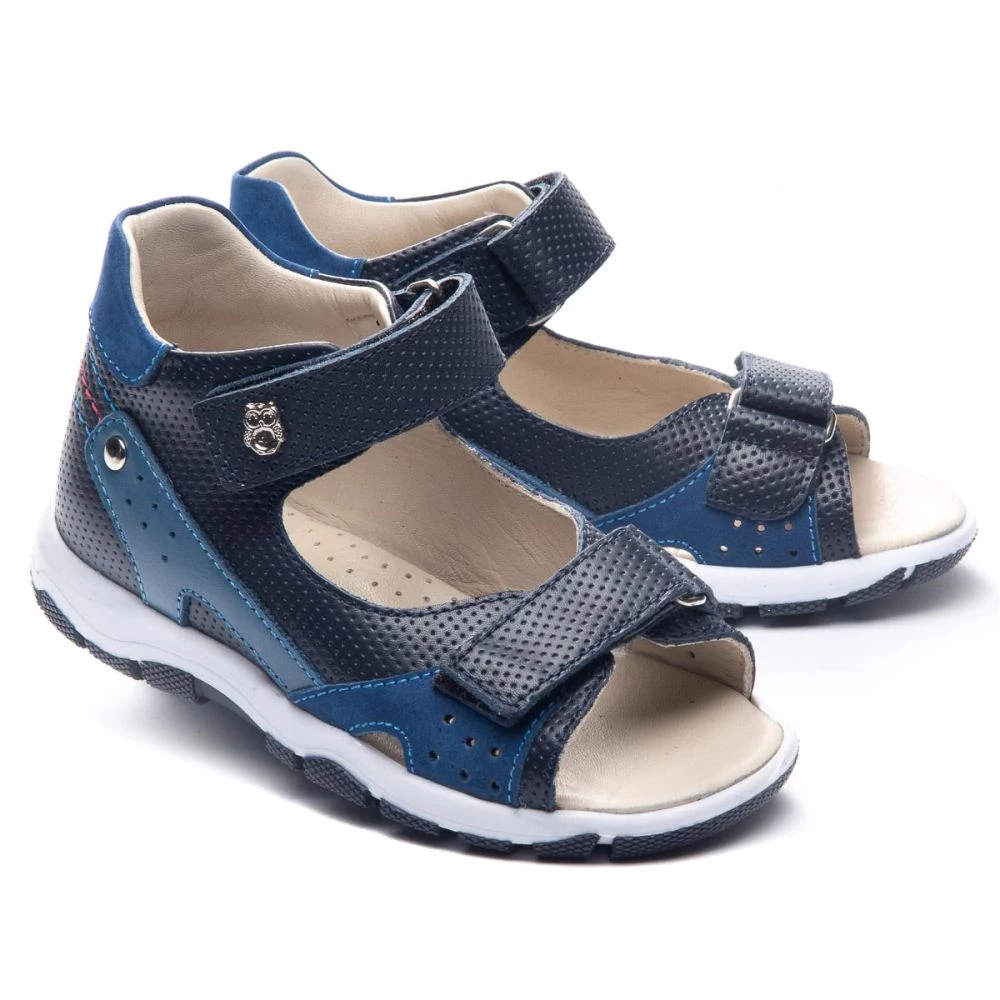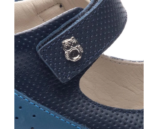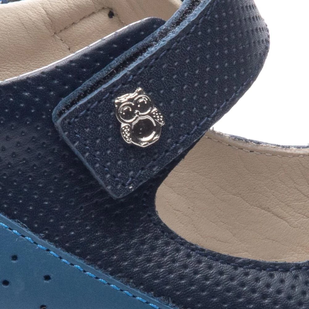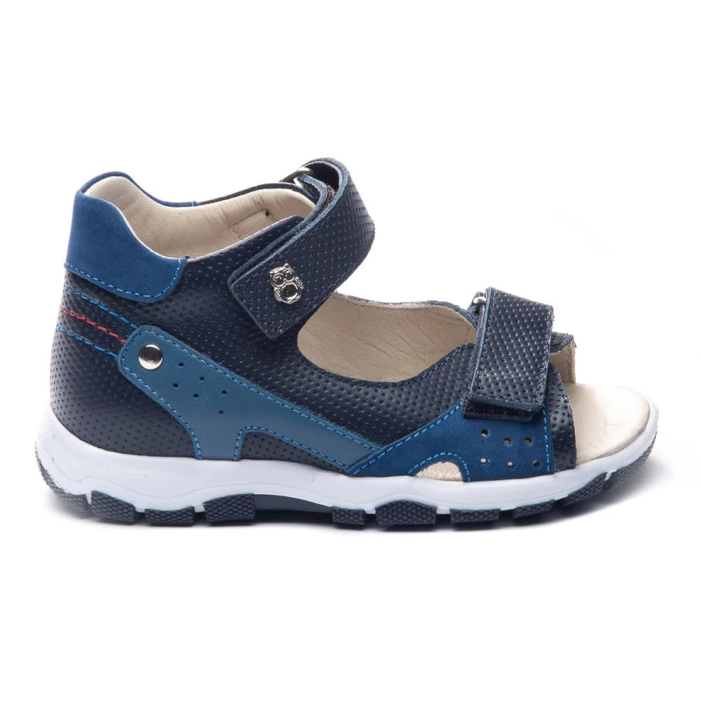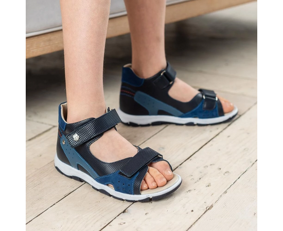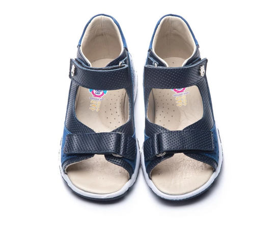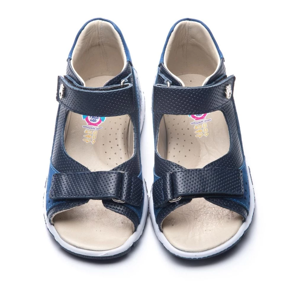Профилактические босоножки 1083 для мальчика из натуральной кожии синего цвета с голубыми вставками. Фиксируются на ноге с помощью двух липучек. Стелька и подкладка – натуральная кожа.