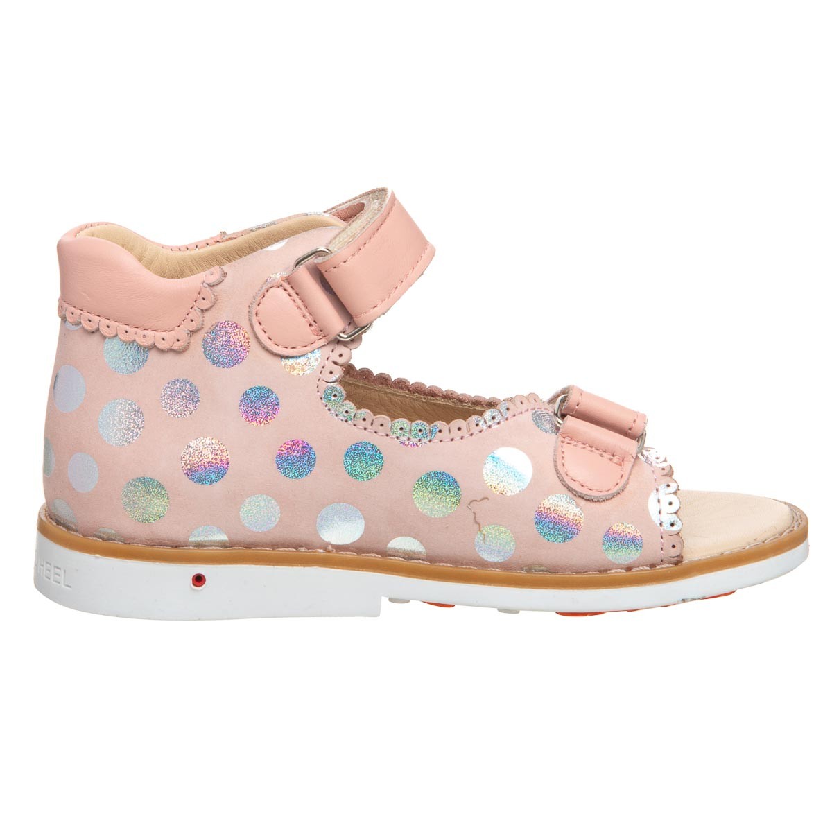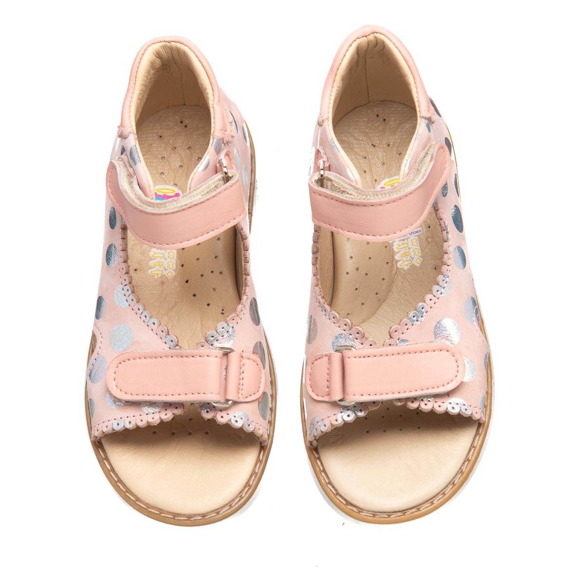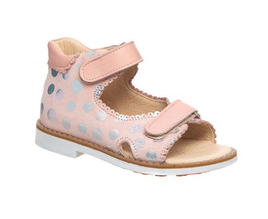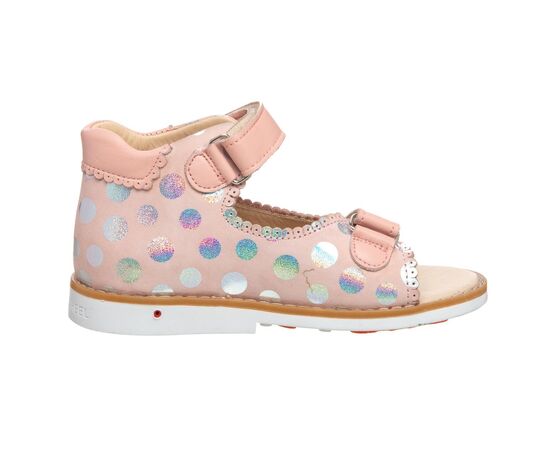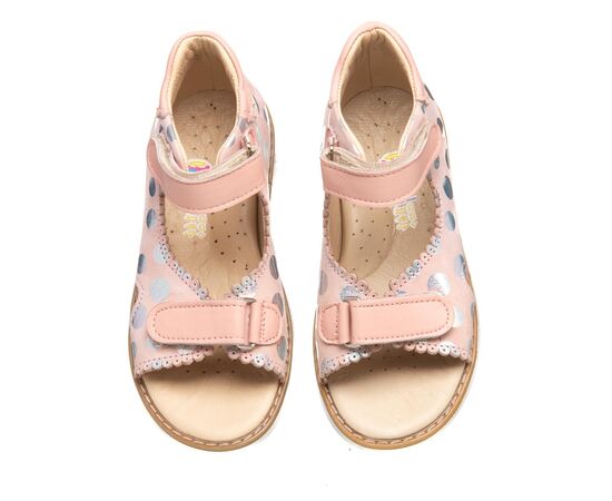 THEO LEO 0070 - нежные пудровые босоножки для девочки, украшены кружками-голограммами. Выполнены из натуральной кожи. Подкладка и стелька с анатомическим супинатором - натуральная кожа. Одеваются и фиксируются на ножке с помощью двух липучек. Подошва - термопластиковая резина.