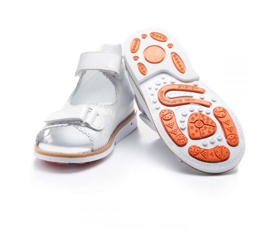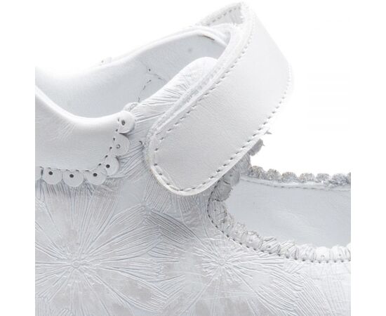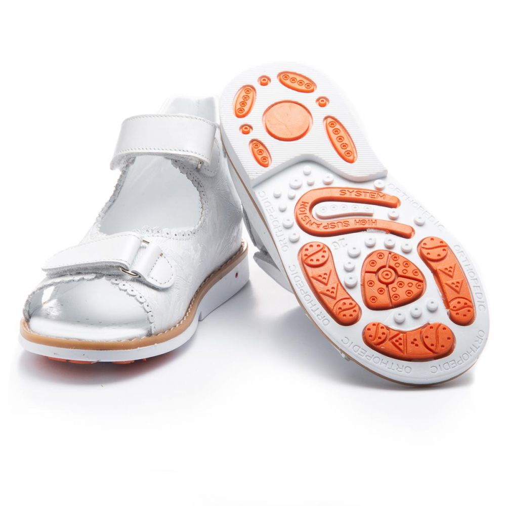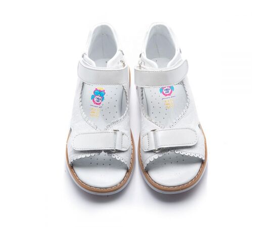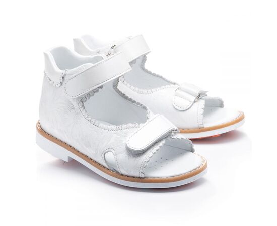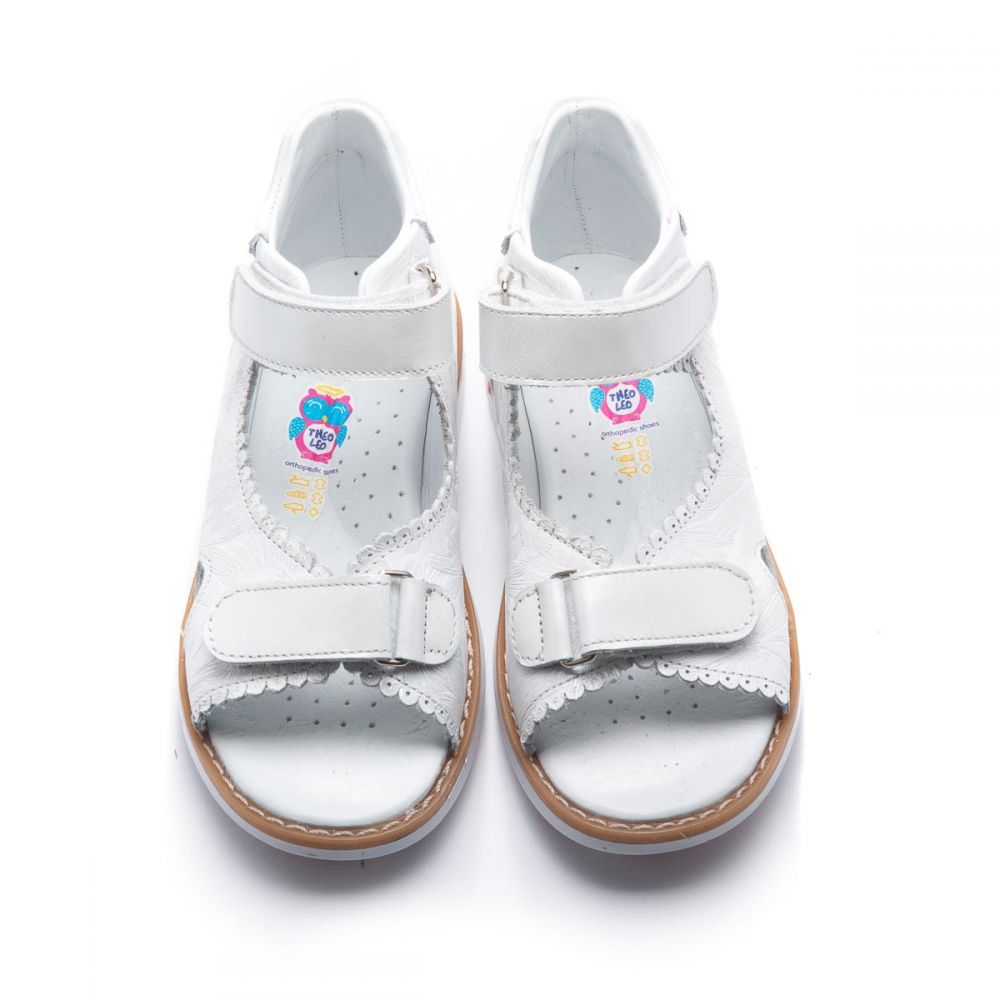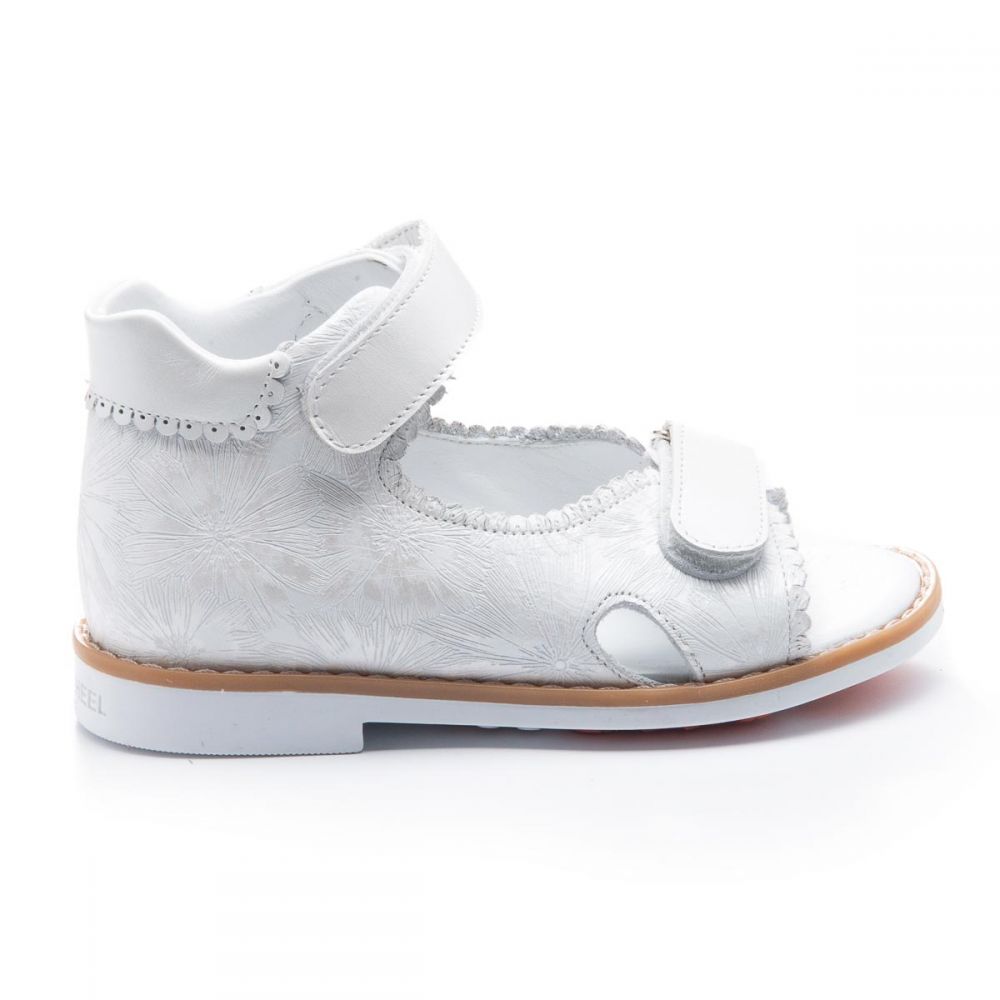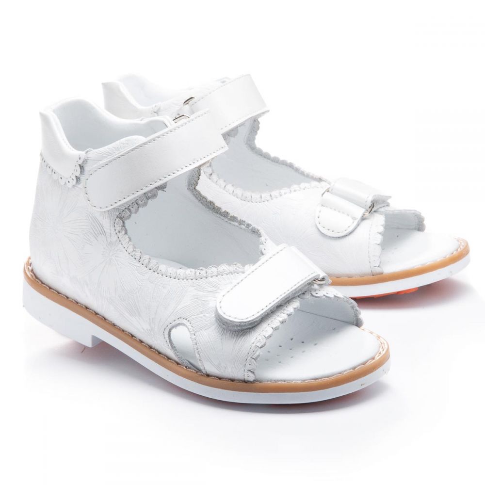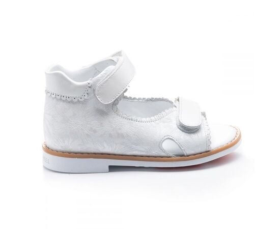 THEO LEO 1133 - красивые и нарядные босоножки для девочки выполнены из натуральной кожи белого цвета. Две липучки помогут зафиксировать обувь по полноте стопы. Модель украшена тиснением и ажурными вставками. Подкладка и стелька с анатомическим супинатором изготовлены из натуральной кожи. Подошва из термопластичной резины с каблуком Томаса – не скользит и хорошо амортизирует. Благодаря каблуку Томаса детская стопа не будет заваливаться внутрь.