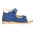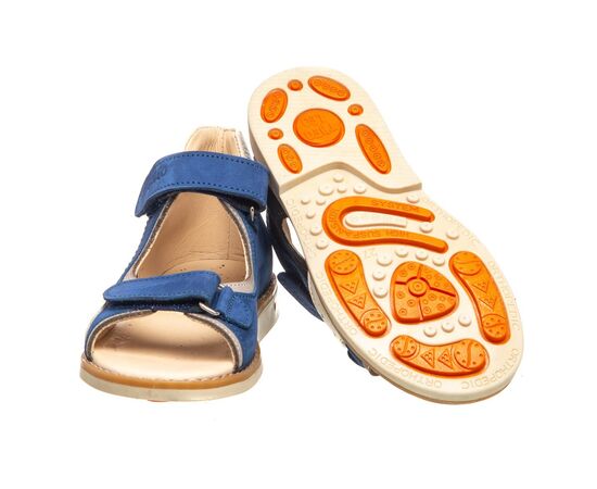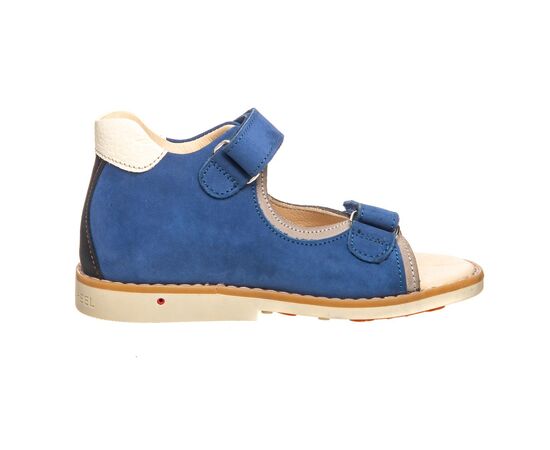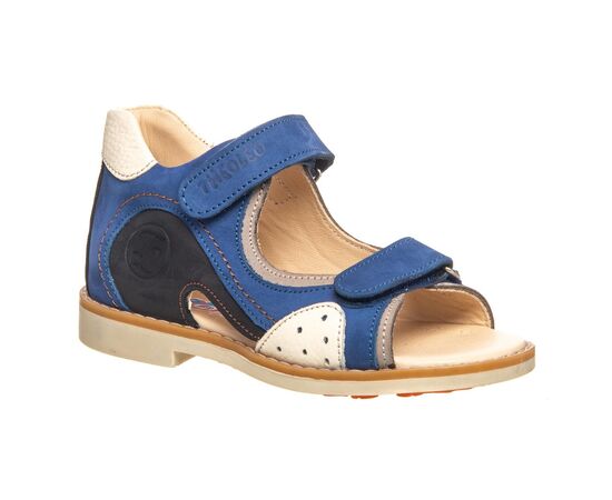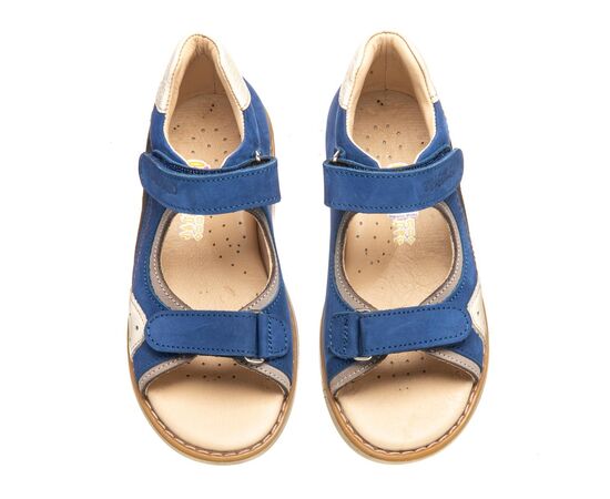THEO LEO 0067 - босоножки для мальчика из натурального нубука синего цвета, декорированы бежевыми вставками. Подкладка и стелька с анатомическим супинатором - натуральная кожа. Одеваются и фиксируются на ножке с помощью двух липучек. Подошва - термопластиковая резина.