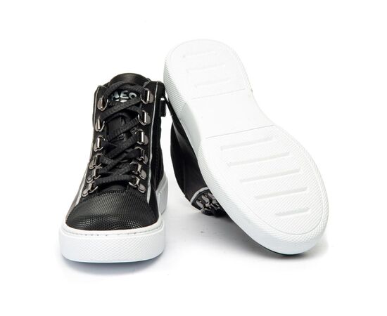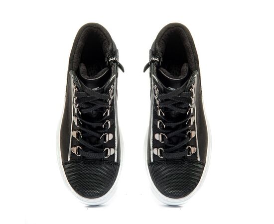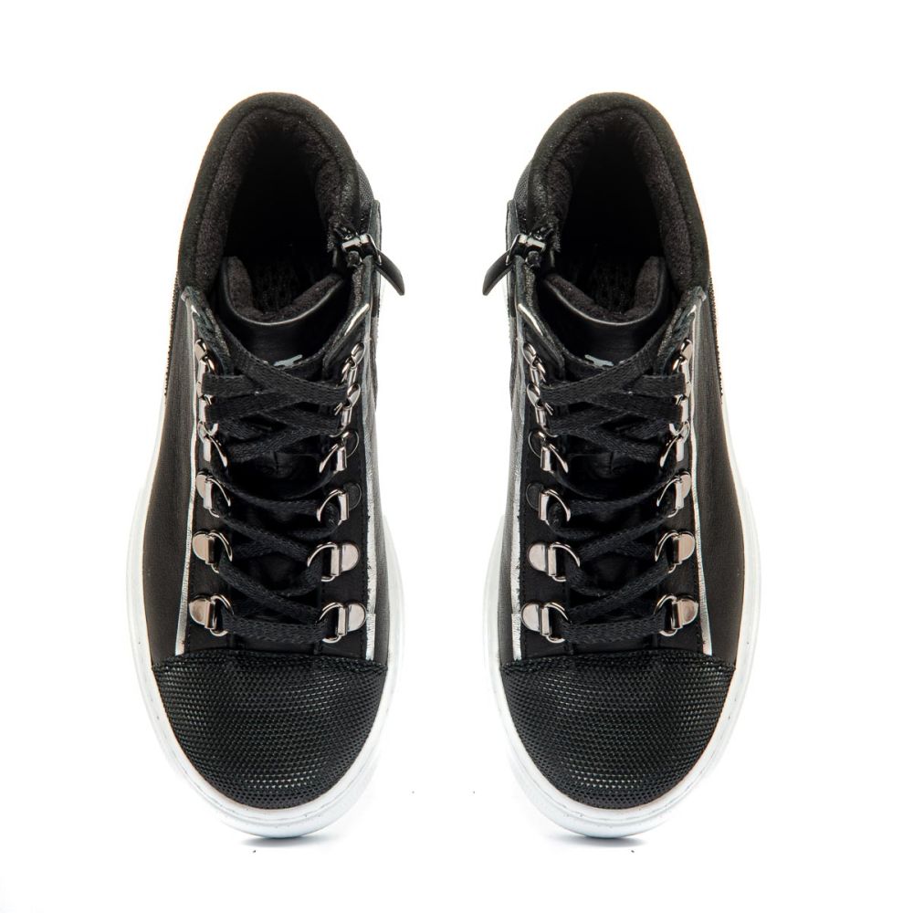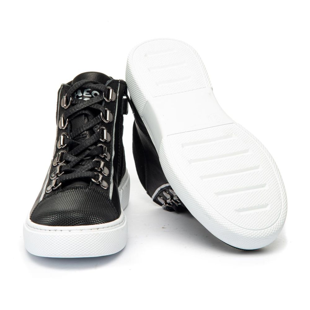 Theo Leo 1341- демисезонные ботинки выполнены из натуральной кожи черного цвета. Модель на молнии, надежно фиксируется на ноге с помощью красиво оформленной шнуровки.