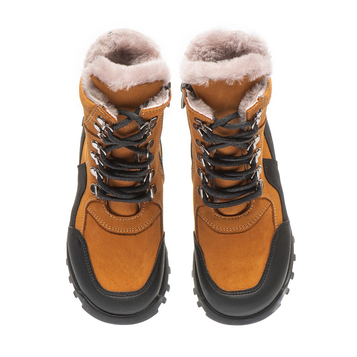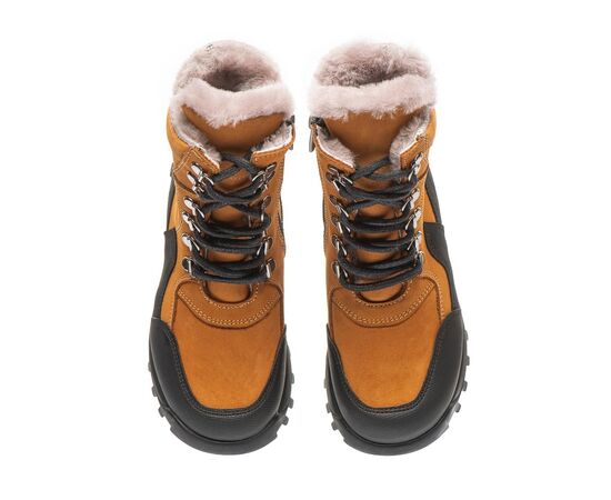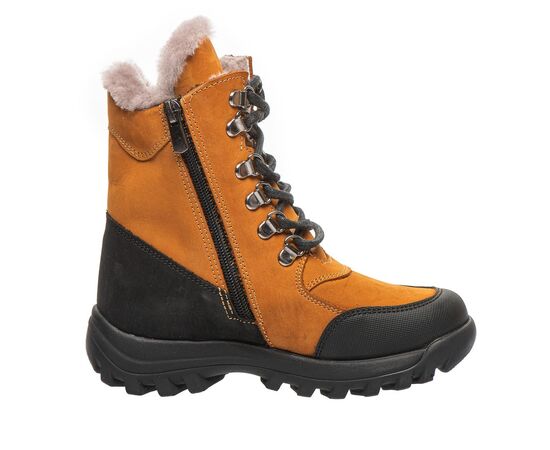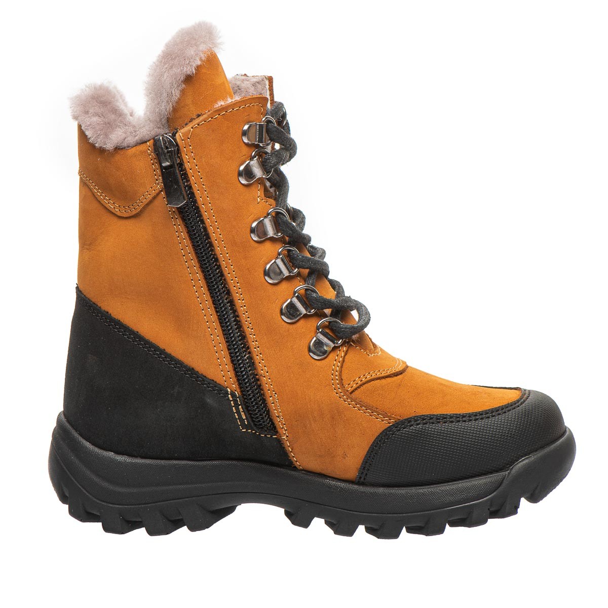 Theo Leo 612423 детские зимние ботинки пошиты из натурального нубука невероятного рыжего цвета. Внутри утеплены натуральной цигейкой. Удобство и скорость обувания обеспечит боковая молния, которая дополнена шнуровкой для лучшей фиксации ножки. Стильные зимние ботинки пошиты на контрасте цвета. Модель дополнена вставкой из натурального нубука черного цвета, носочек защищен вставкой "неубивайка".