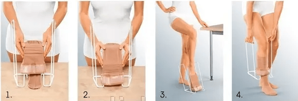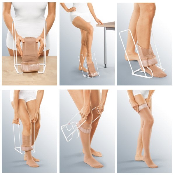 - у пожилых, малоподвижных и ослабленных пациентов решает проблему одевания компрессионного трикотажа самостоятельно без посторонней помощи;
