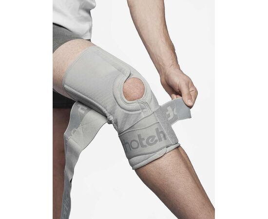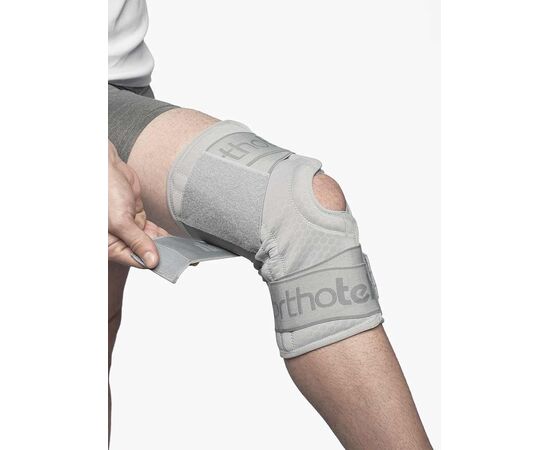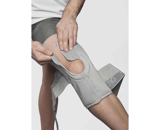 1. Покладіть на коліно наколінник Standard plus так, щоб м'яке кільце щільно обернулося навколо колінної чашки. Використовуючи елементи липучки, стягніть конструкцію і зафіксуйте її на місці, спочатку прив'язавши елемент над колінною чашкою, а потім елемент під нею. Переконайтеся, що кільце точно відцентроване на колінній філіжанці і надійно закріплене і Вам зручно.