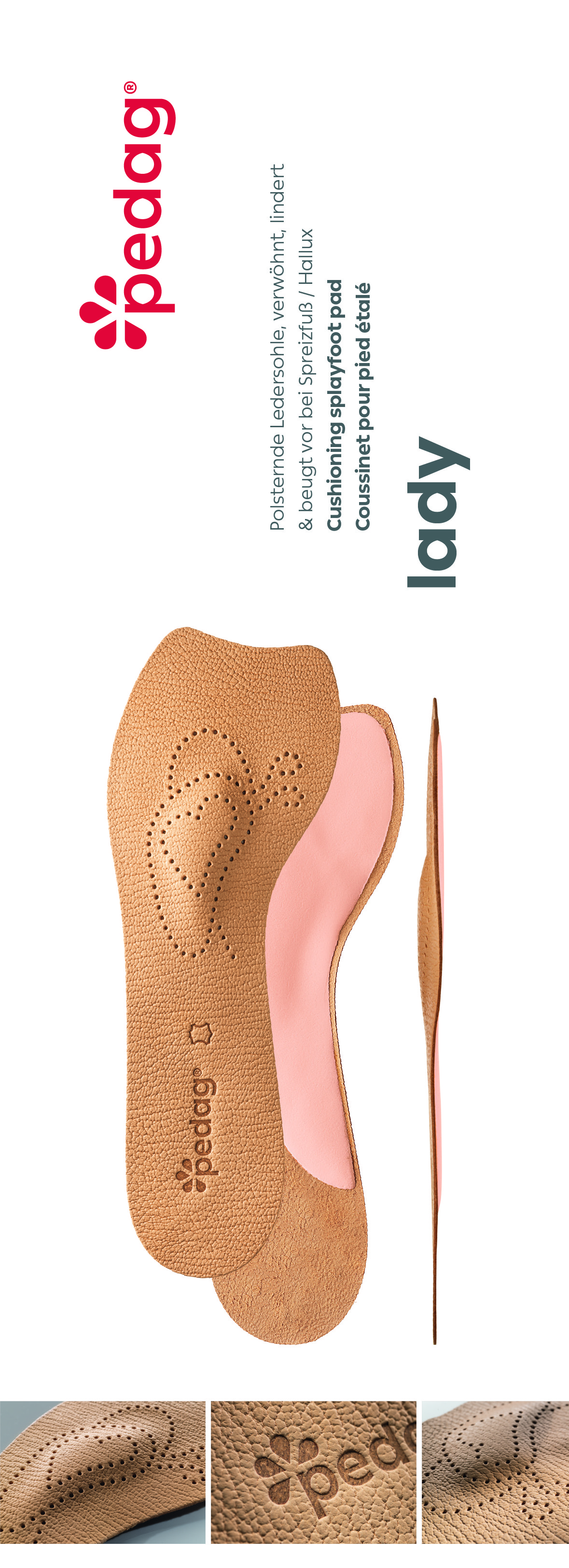 - Частое использование высоких каблуков может повредить ноги. На высоких каблуках около 75% веса припадает на переднюю часть стопы, что может вызвать как плоскостопие, так и более серьезные проблемы. PEDAG Lady специально создана, чтобы уменьшить нагрузку на ноги и избежать болезненных ощущений;