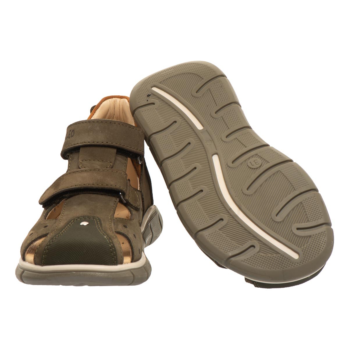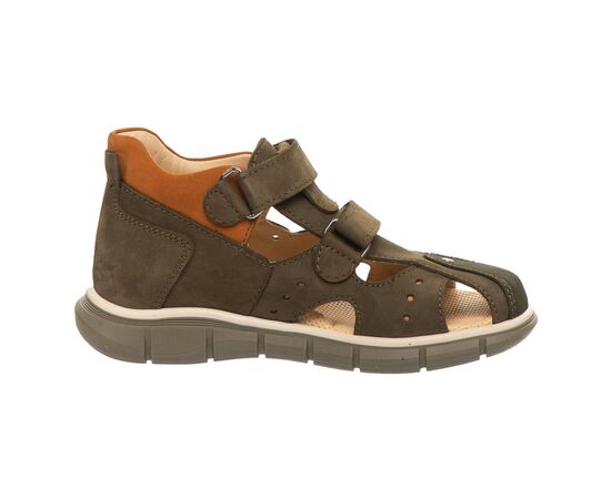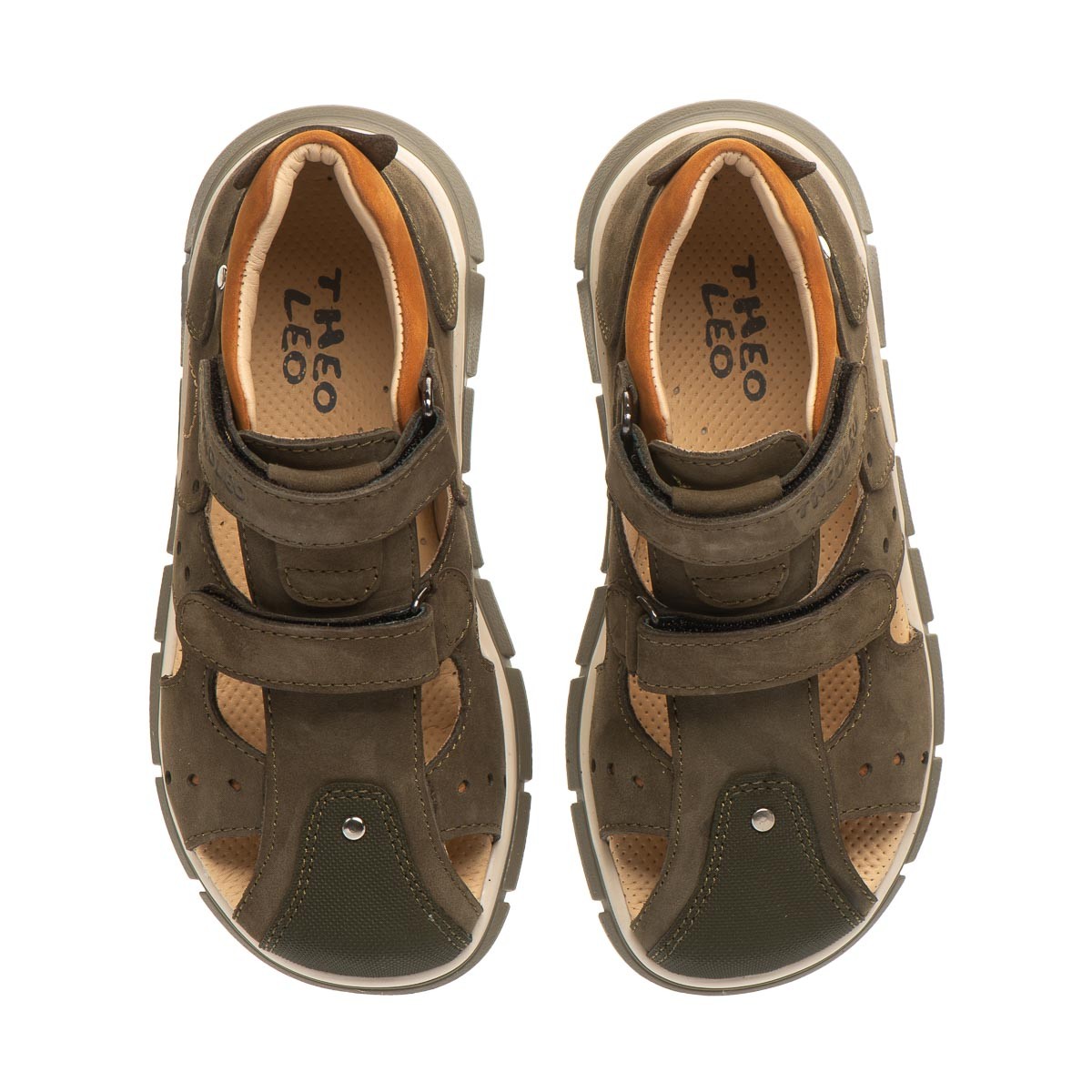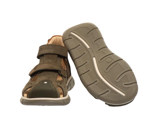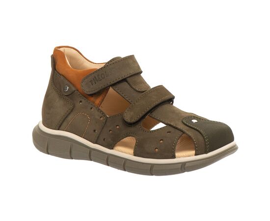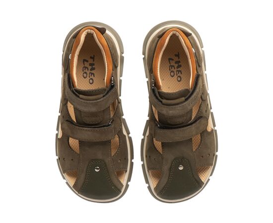 Theo Leo T007 удобная закрытая модель босоножек выполнена в комбинации натурального нубука цвета хаки. Применение кожи разных фактур придает модели босоножек особого шарма. Модель дополнена фигурными вырезами, что добавляет комфорта ножкам ребенка. Носочек в обуви защищен вставкой "неубивайка".