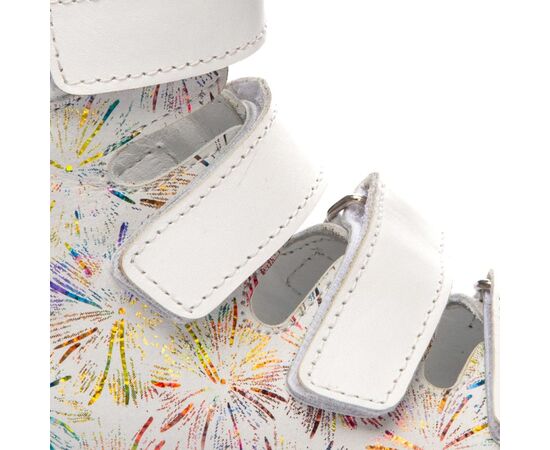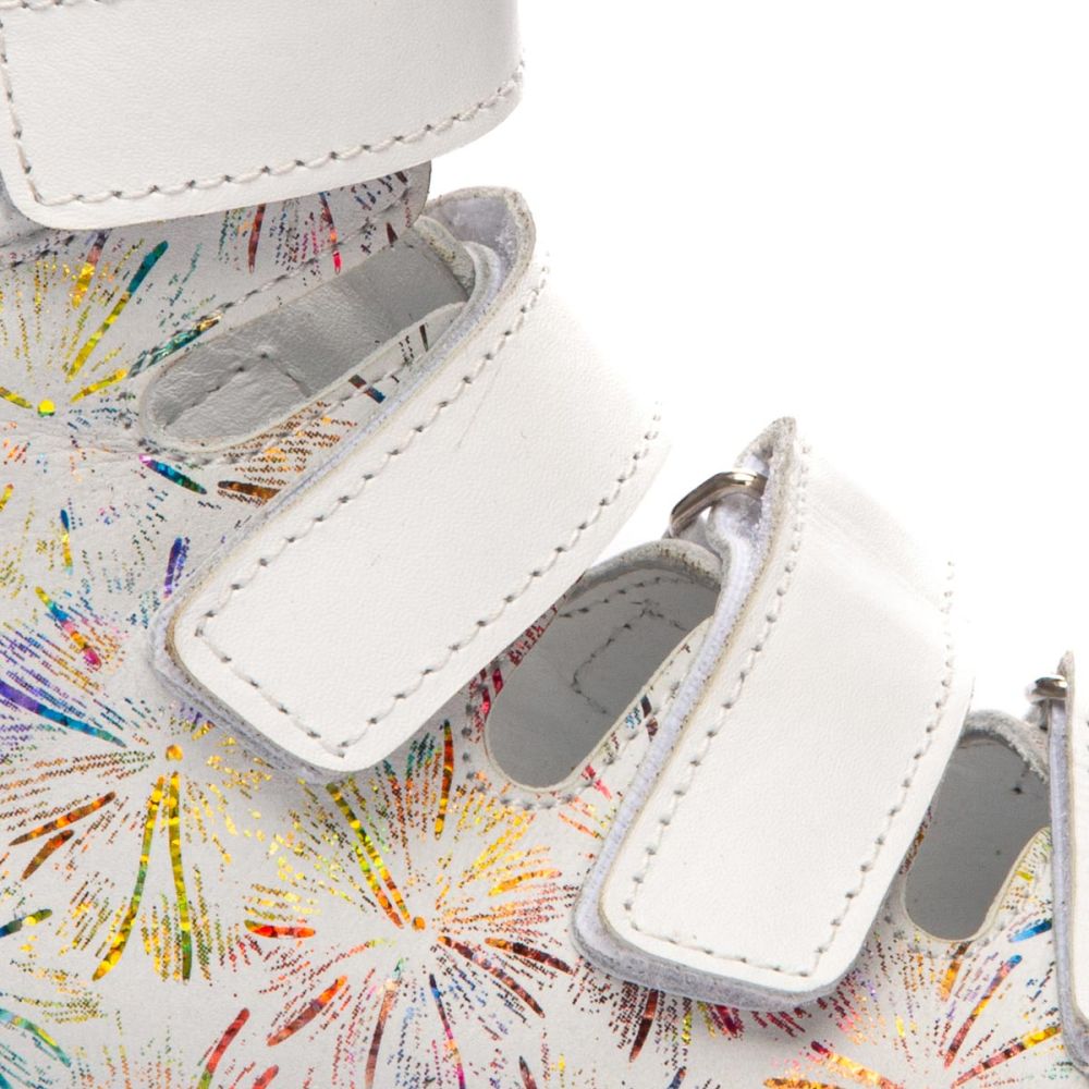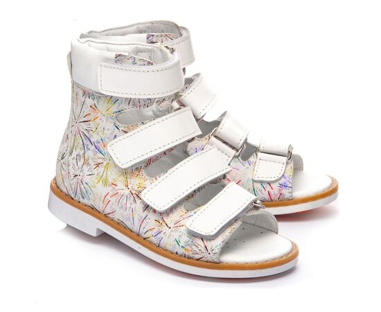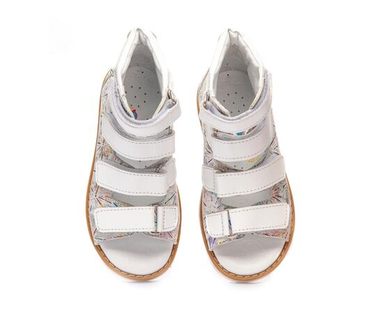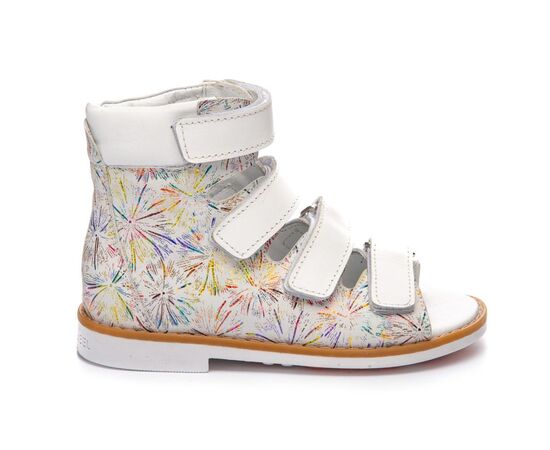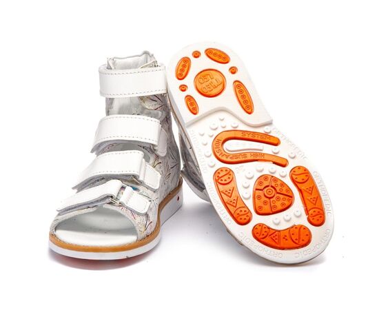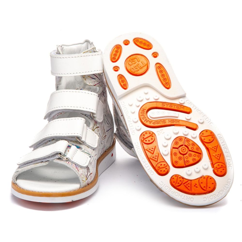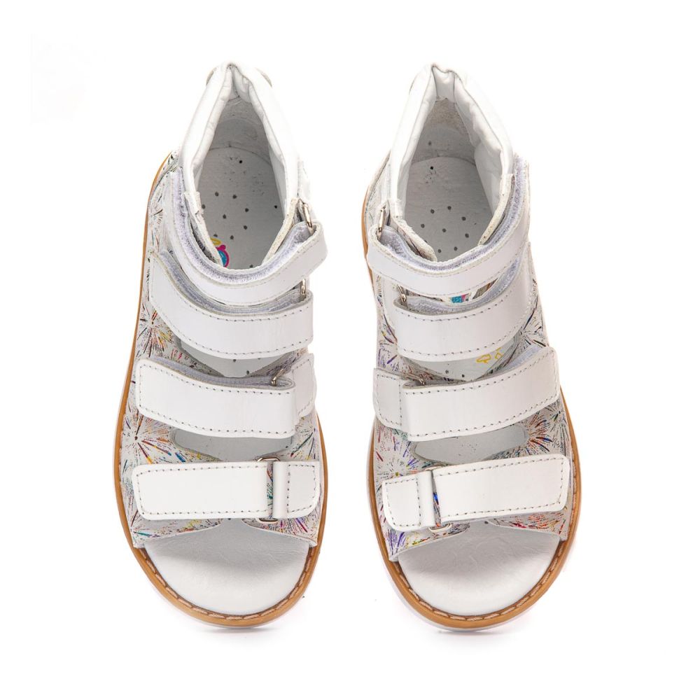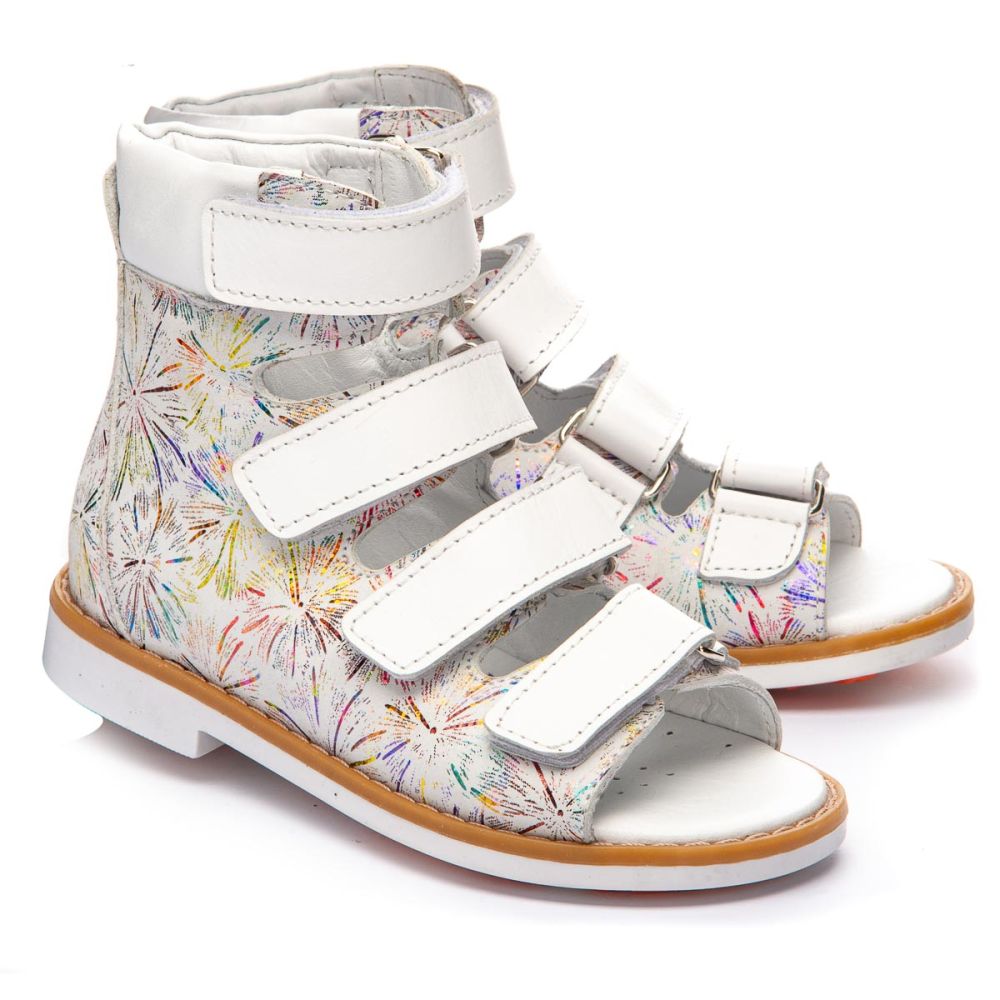 THEO LEO 1228 - ортопедические босоножки для девочки из натуральной кожи белого цвета на 4 липучках. Подкладка и стелька - натуральная кожа. Соблюдены все необходимые требования к ортопедической обуви: анатомический супинатор, жесткий задник, высокие берцы, четыре липучки, каблук Томаса, не скользящая подошва. Благодаря каблуку Томаса детская стопа не будет заваливаться внутрь.