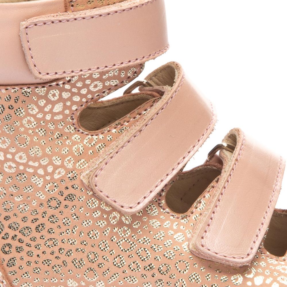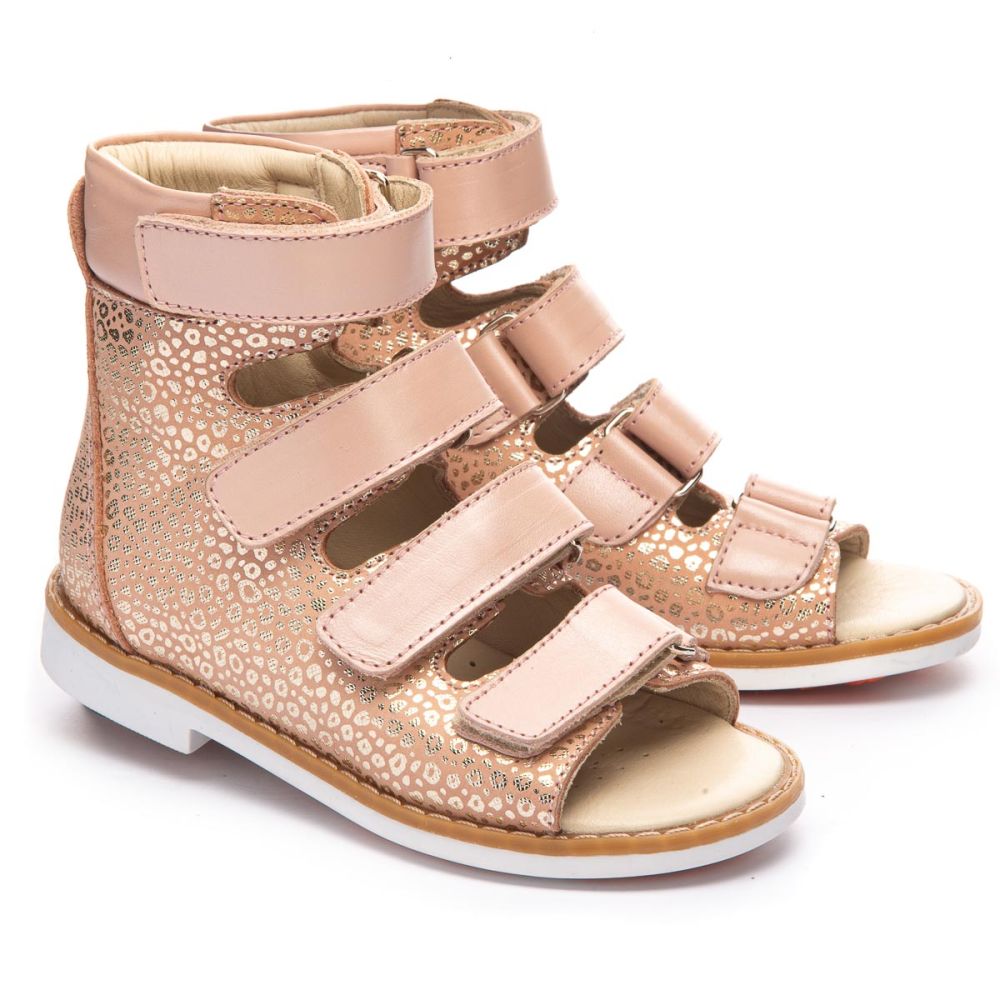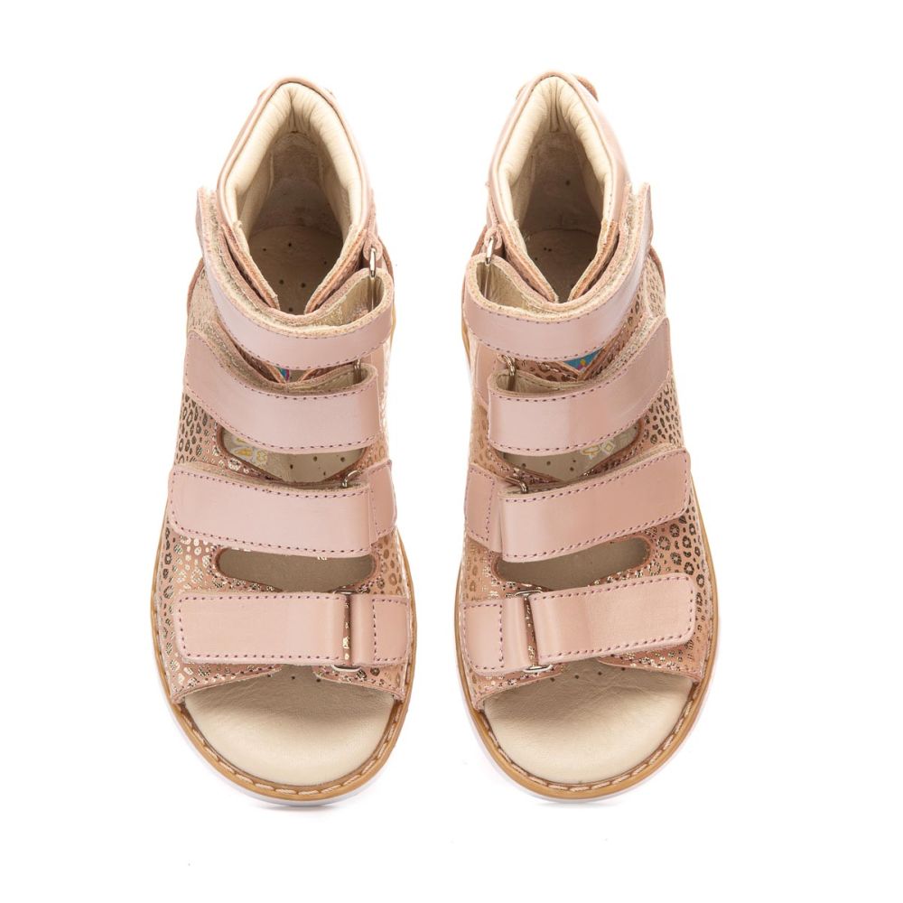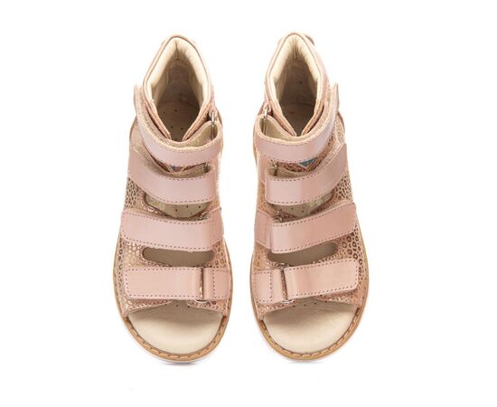 THEO LEO 1231 - ортопедичні босоніжки для дівчинки з натуральної шкіри бежевого кольору з золотим малюнком на 4 липучках.