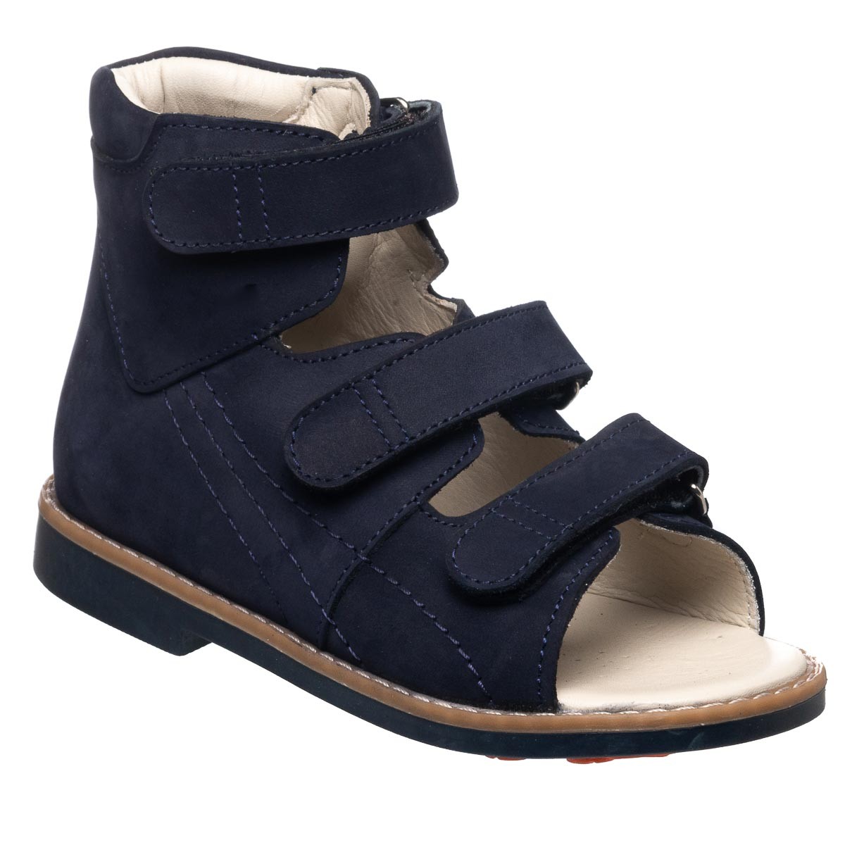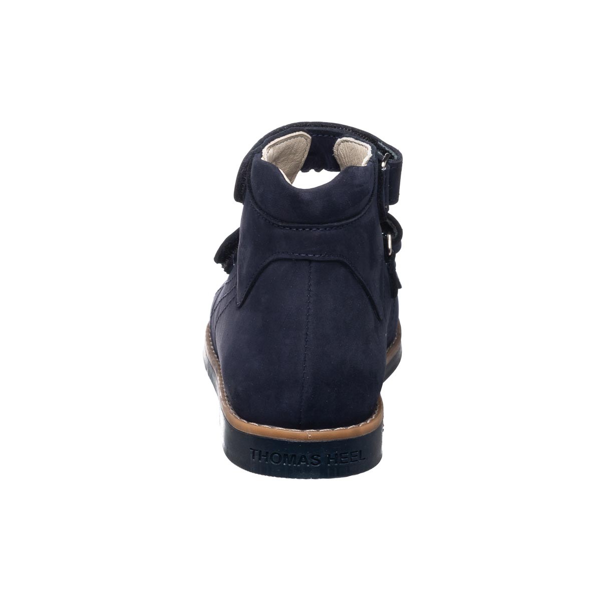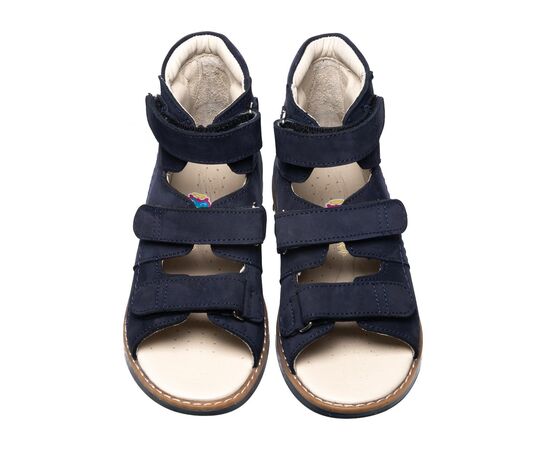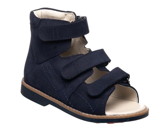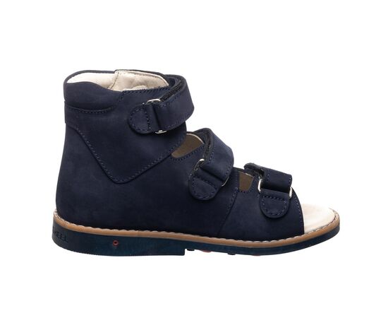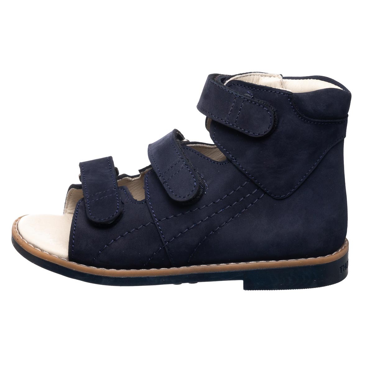 THEO LEO 1128 - ортопедические сандалии с высоким задником выполнены из натурального нубука темно синего цвета. Стелька с анатомическим супинатором и подкладка - натуральная кожа. Одеваются фиксируются с помощью трех липучек. Подошва из термопластичной резины с каблуком Томаса - не скользит и хорошо амортизирует. Благодаря каблуке Томаса детская стопа не будет заваливаться внутрь.