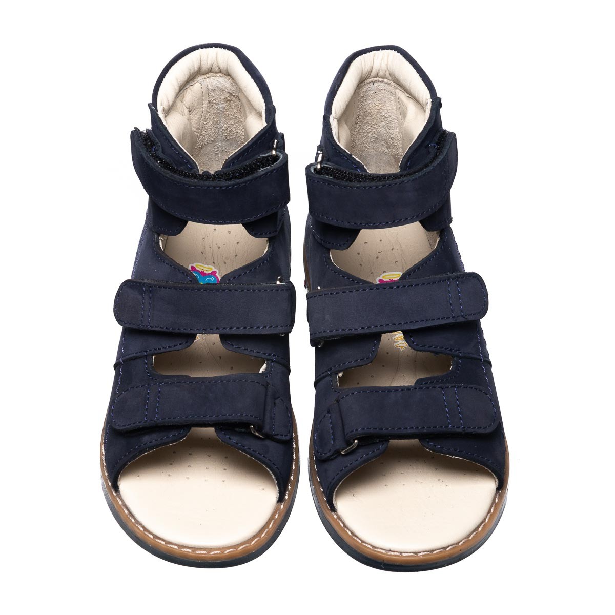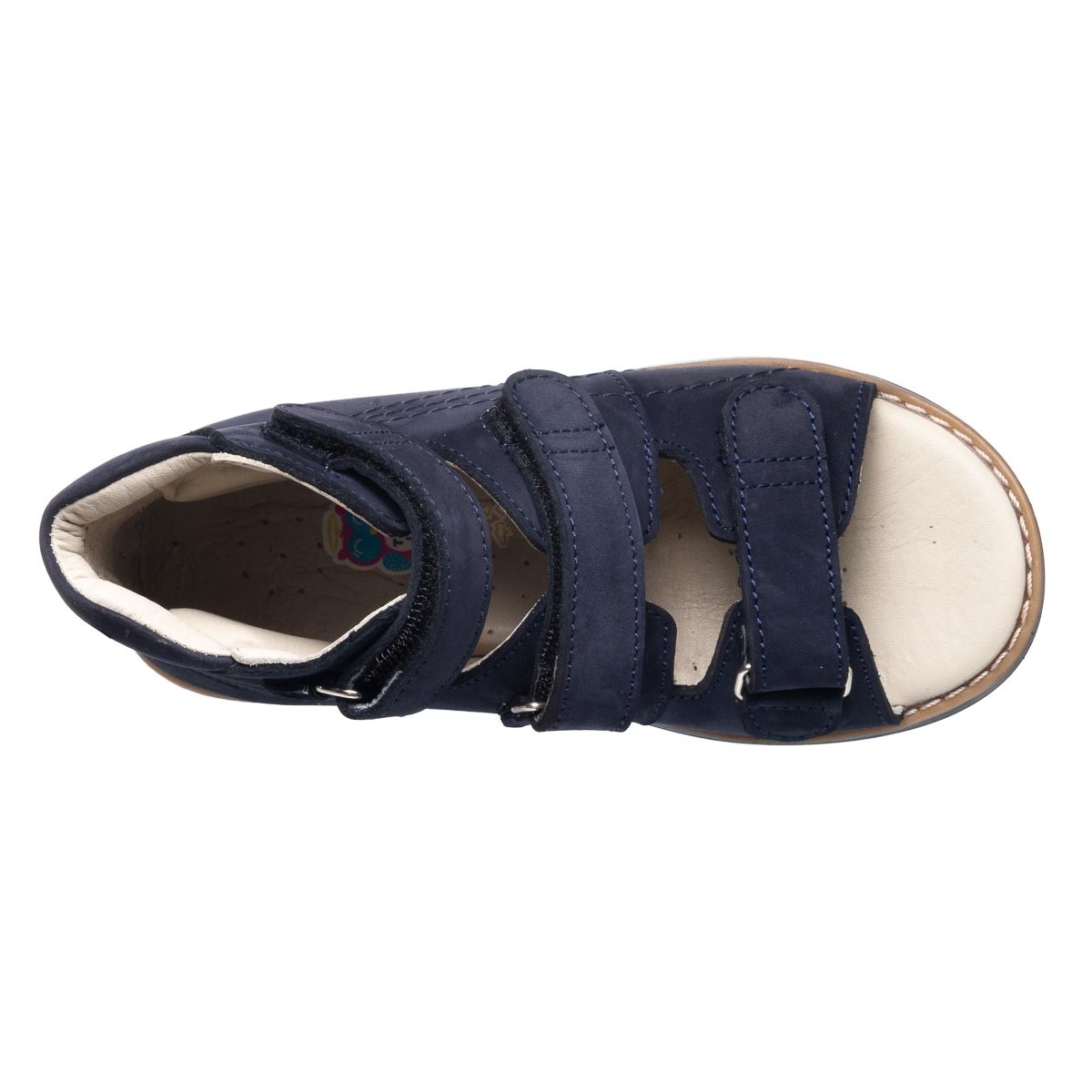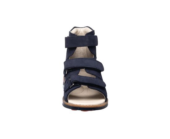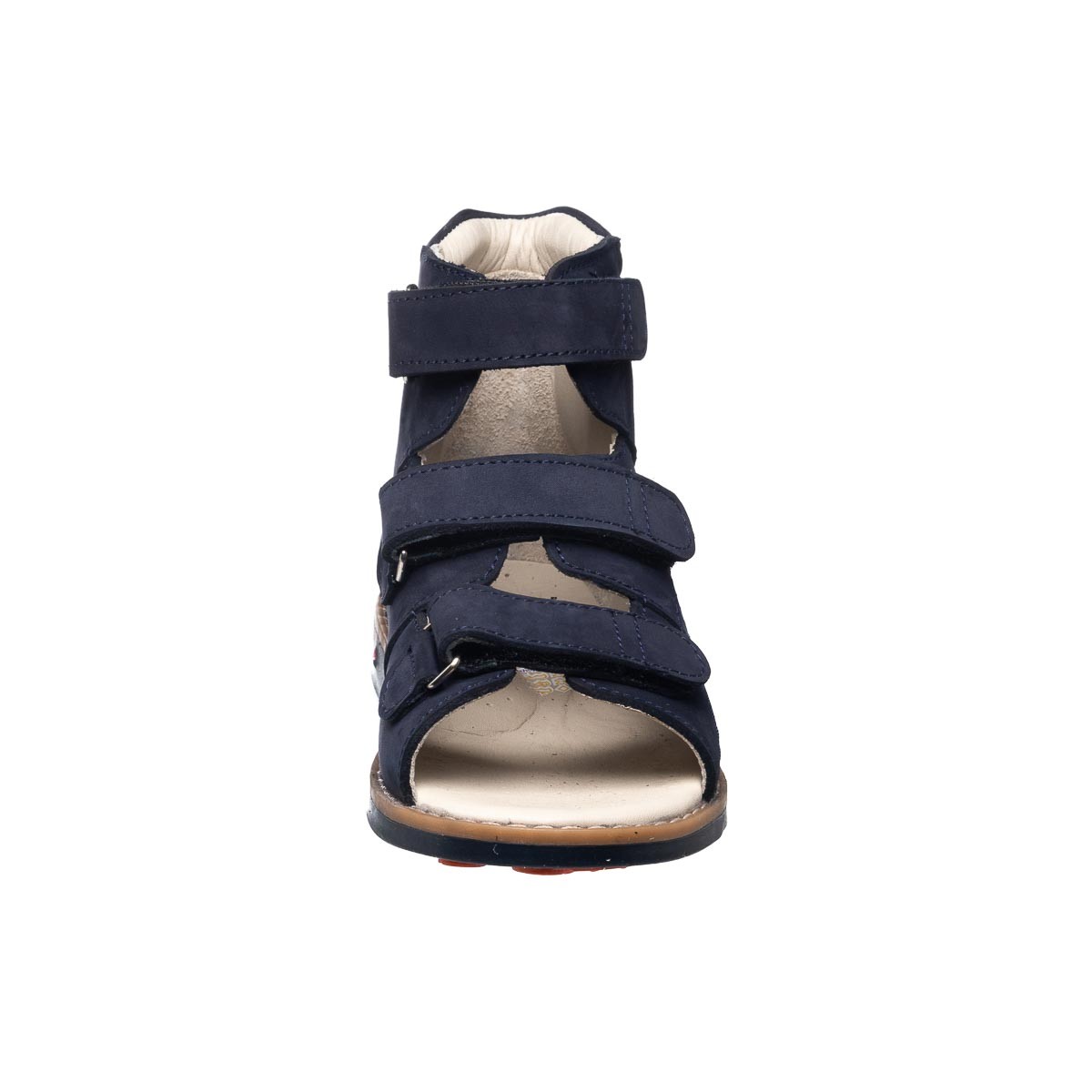 THEO LEO 1128 - ортопедические сандалии с высоким задником выполнены из натурального нубука темно синего цвета. Стелька с анатомическим супинатором и подкладка - натуральная кожа. Одеваются фиксируются с помощью трех липучек. Подошва из термопластичной резины с каблуком Томаса - не скользит и хорошо амортизирует. Благодаря каблуке Томаса детская стопа не будет заваливаться внутрь.