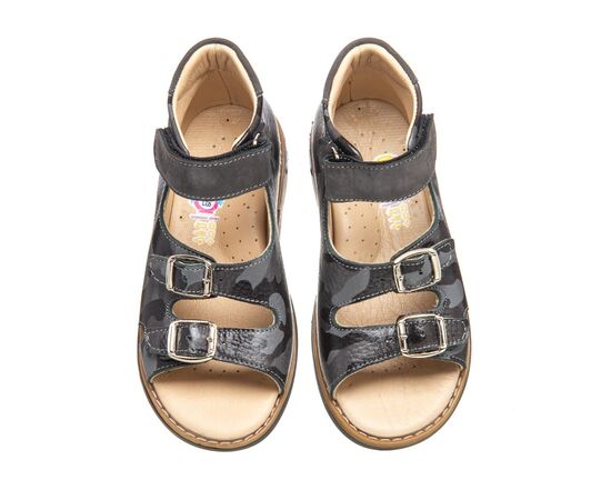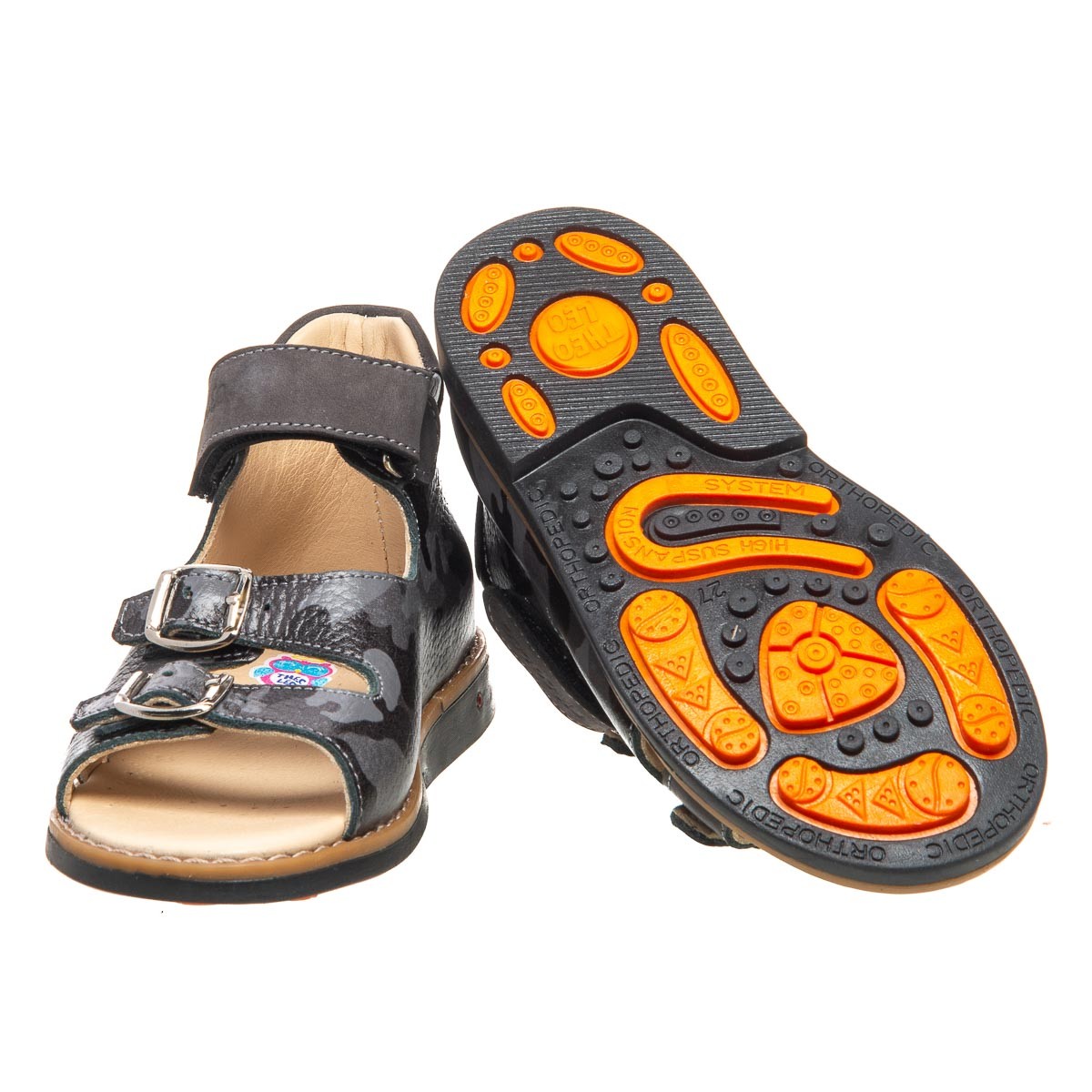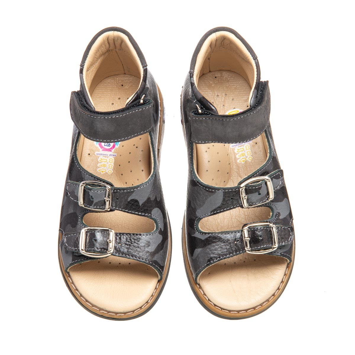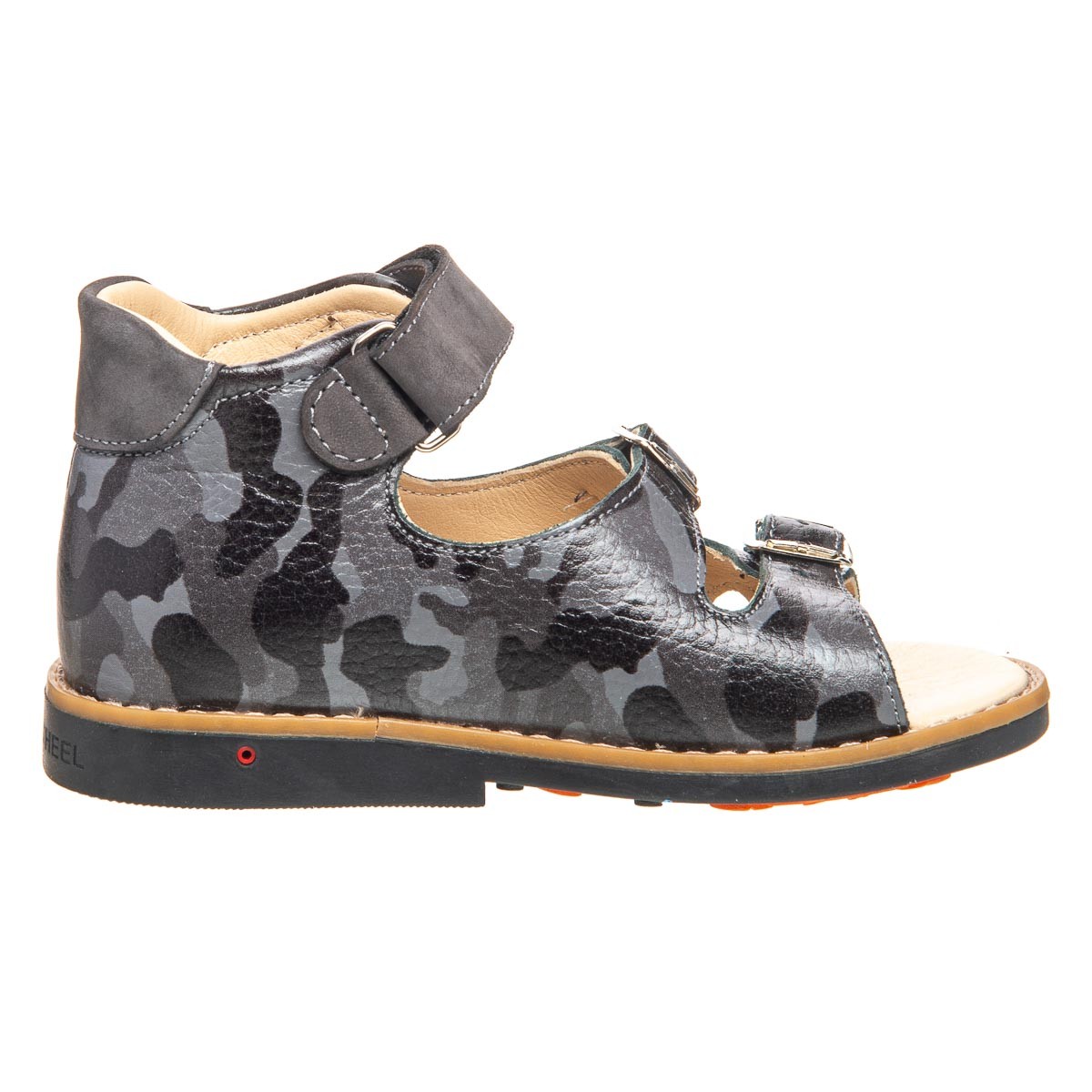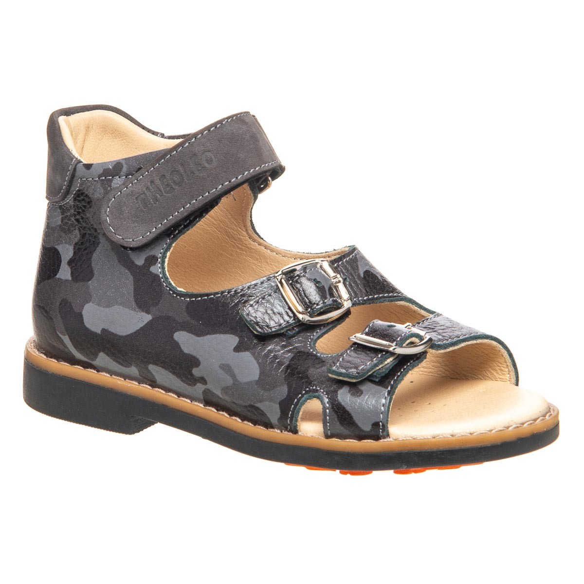 Theo Leo 0074 - босоножки для мальчика из натуральной кожи серого цвета расцветки камуфляж. Удобная фиксация на ноге с помощью липучек и застежек. Подкладка и стелька с анатомическим супинатором - натуральная кожа. В модели присутствует жесткая пятка и каблук Томаса. Подошва - термопластиковая резина, не скользящая, хорошо амортизирует при ходьбе. Благодаря каблуку Томаса детская стопа не будет заваливаться внутрь.