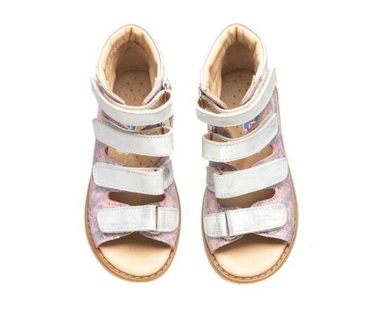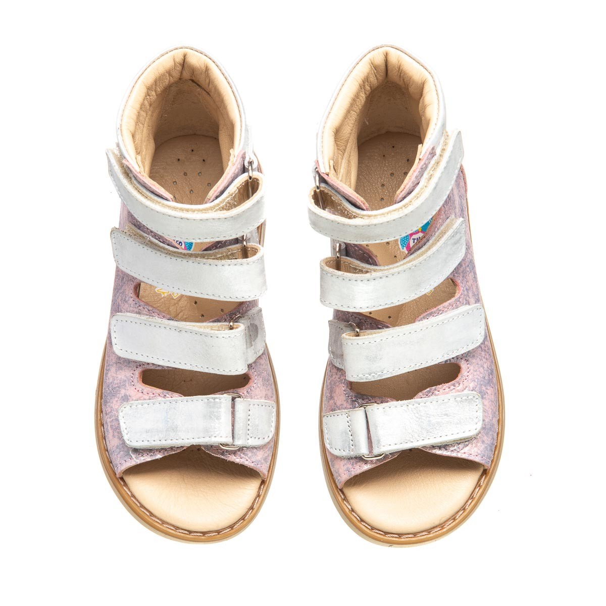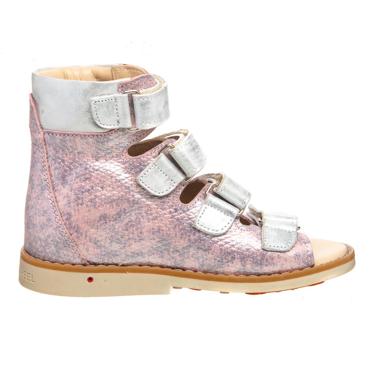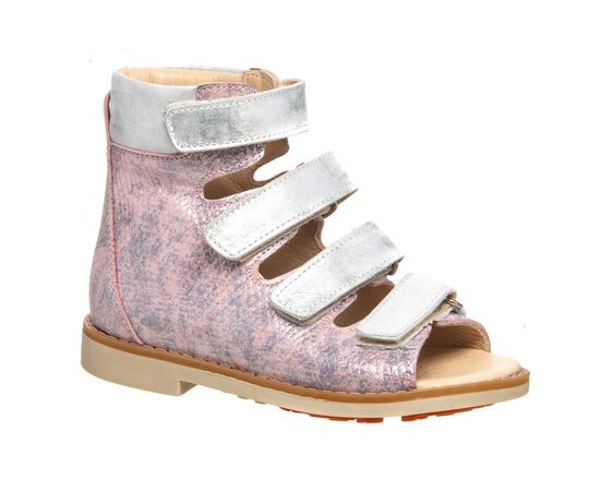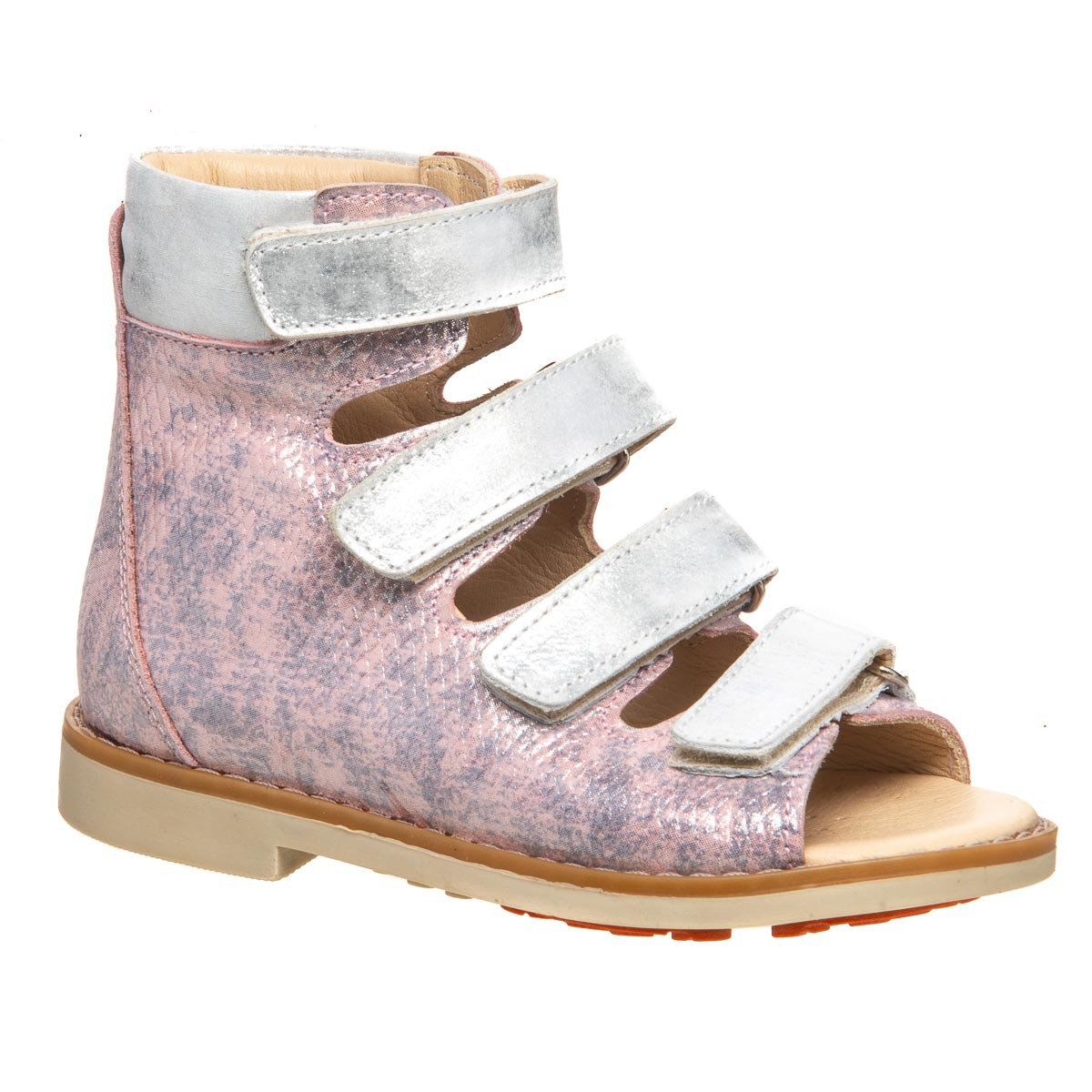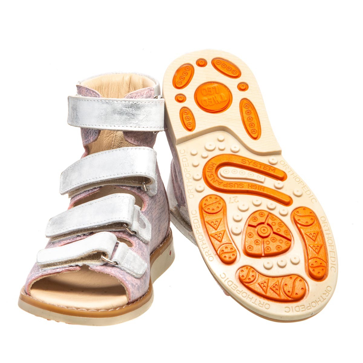 THEO LEO 0076 - ортопедические босоножки для девочки из натуральной кожи розово-серебристого цвета на 4 липучках. Подкладка и стелька - натуральная кожа. Соблюдены все необходимые требования к ортопедической обуви: анатомический супинатор, жесткий задник, высокие берцы, четыре липучки, каблук Томаса, не скользящая подошва. Благодаря каблуку Томаса детская стопа не будет заваливаться внутрь.