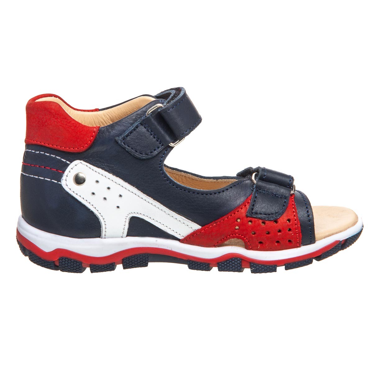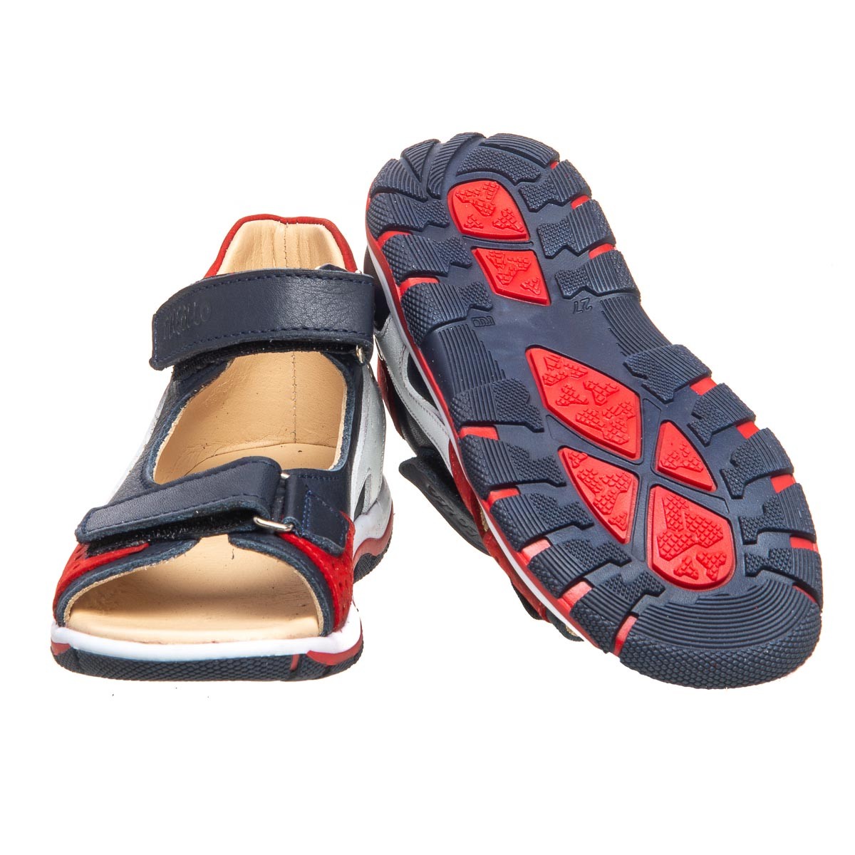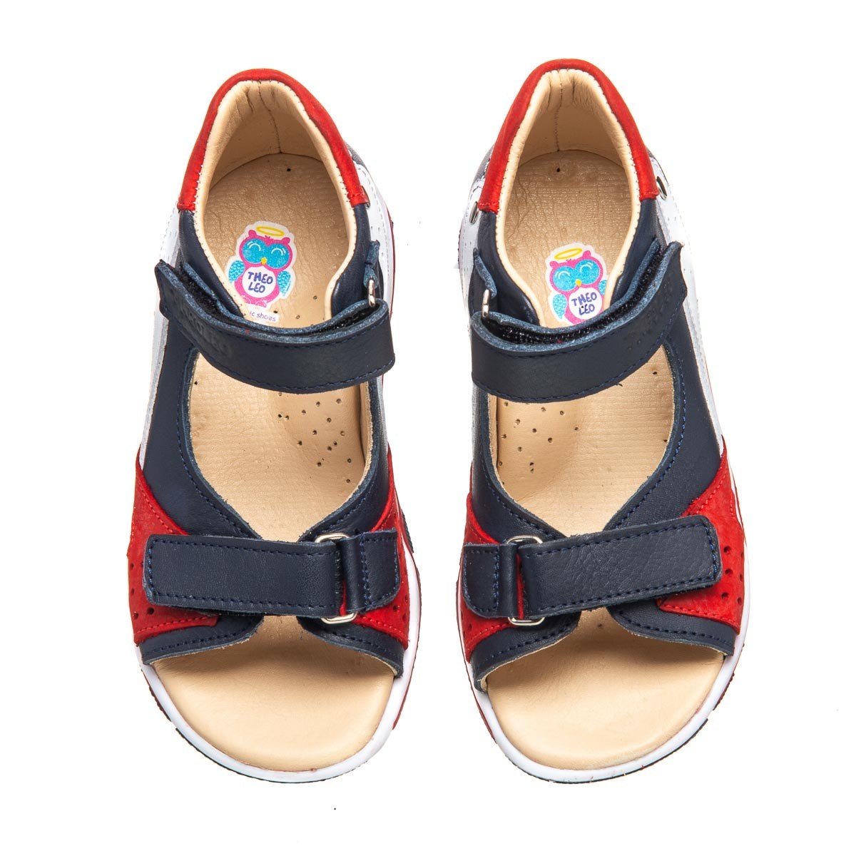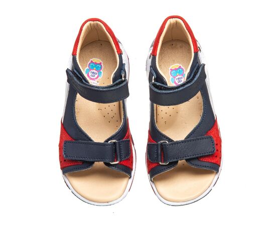 THEO LEO 0075 - сандалии из натуральной кожи синего цвета на 3-цветной подошве. Модель декорирована вставками красного и белого цвета. Стелька с анатомическим супинатором и подкладка - натуральная кожа. Одеваются и фиксируются с помощью двух липучек. Подошва из термопластичной резины – не скользит и хорошо амортизирует.