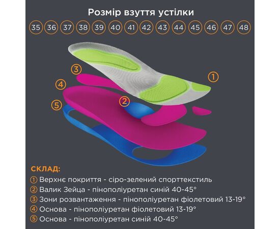 • основа стелек изготовлена из 2-компонентного полиуретана• метатарзальный валик оказывает выраженную поддержку поперечному своду стопы, снимает нагрузку с переднего отдела стопы