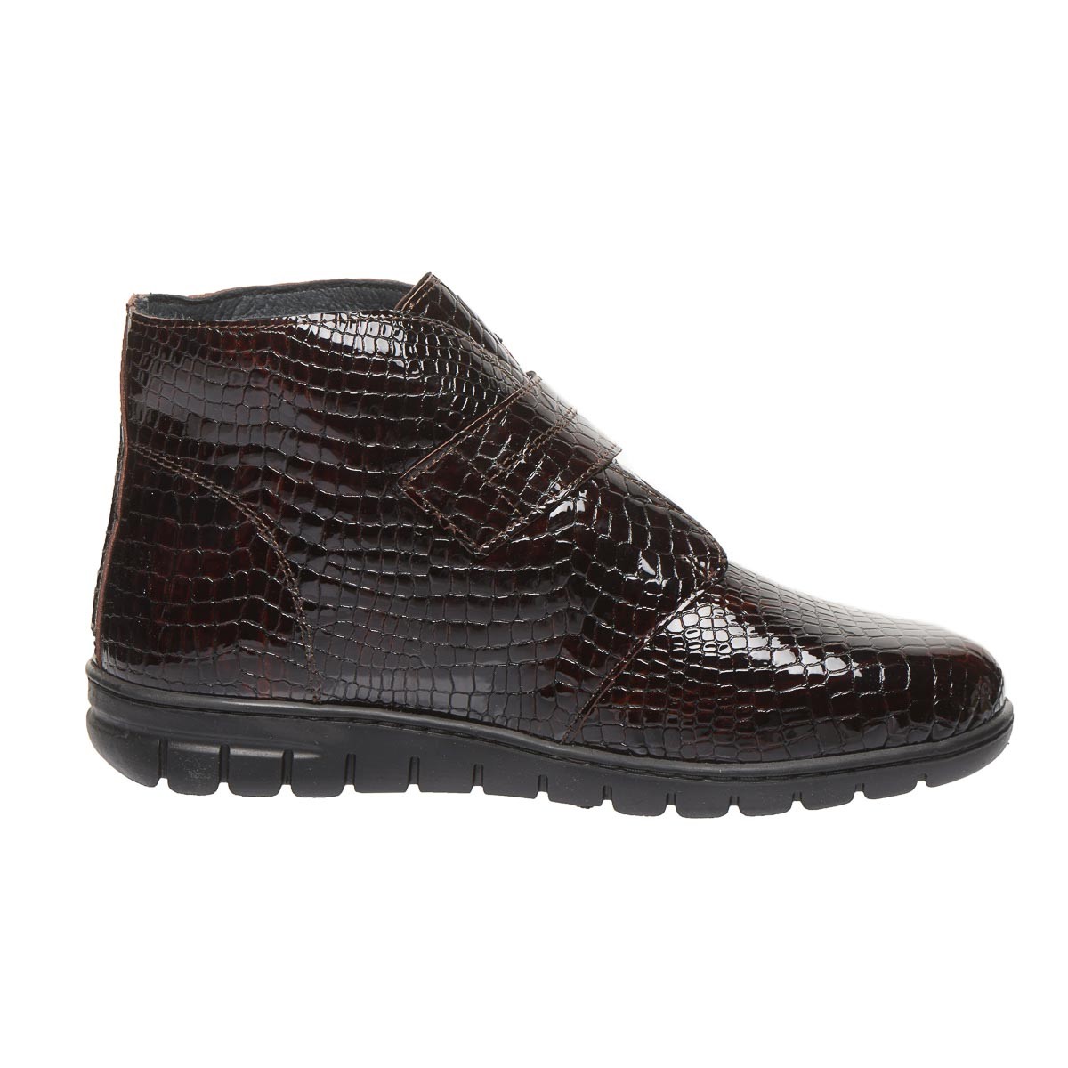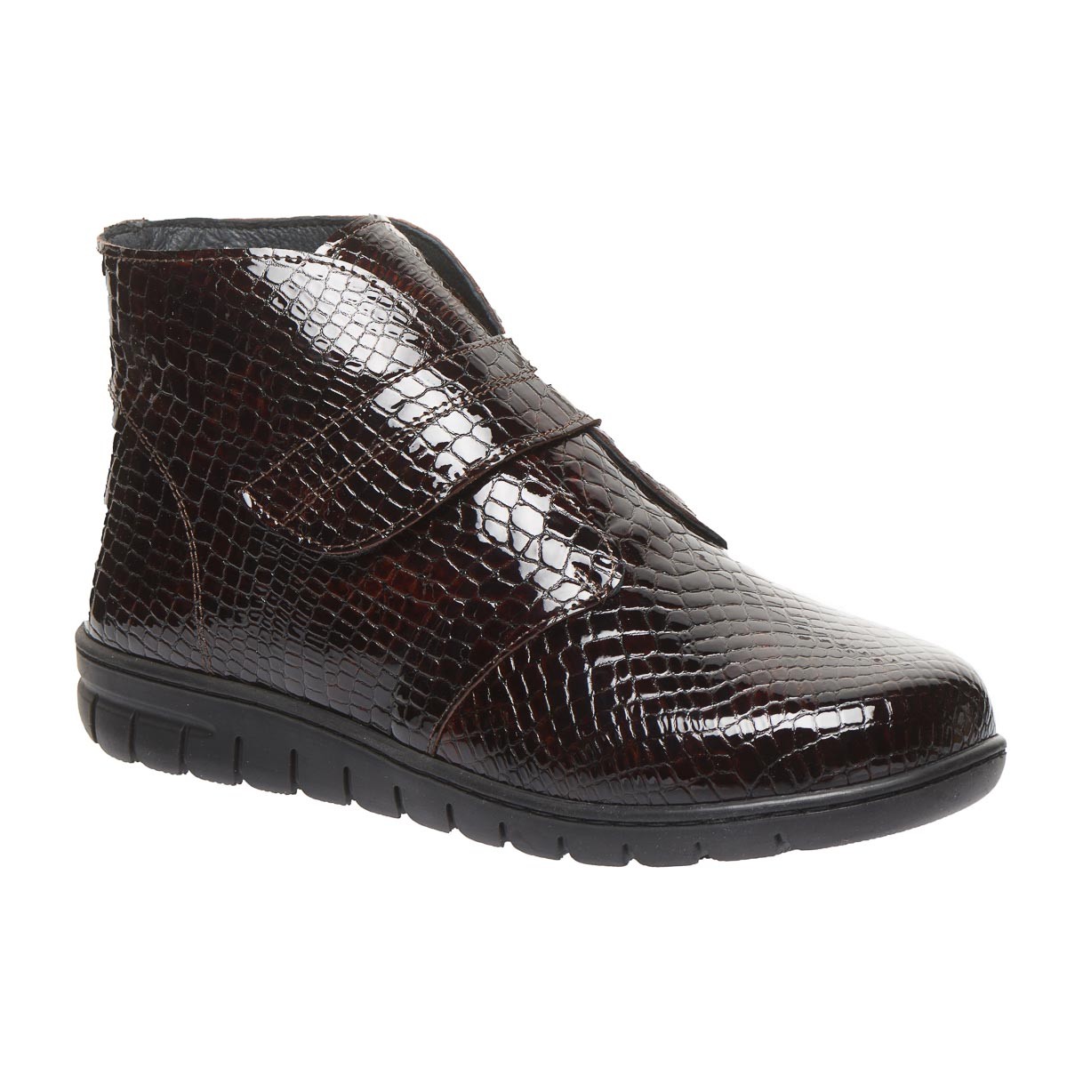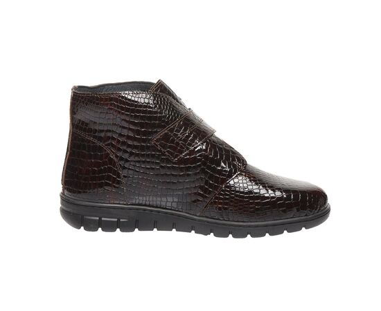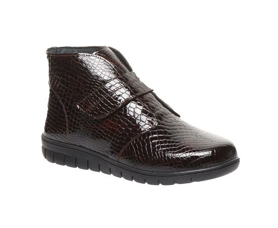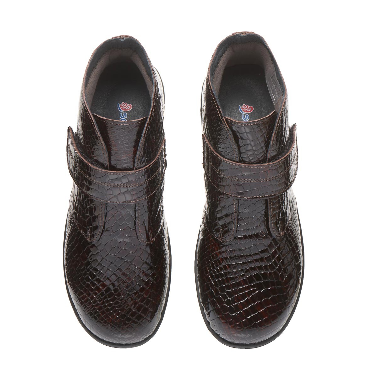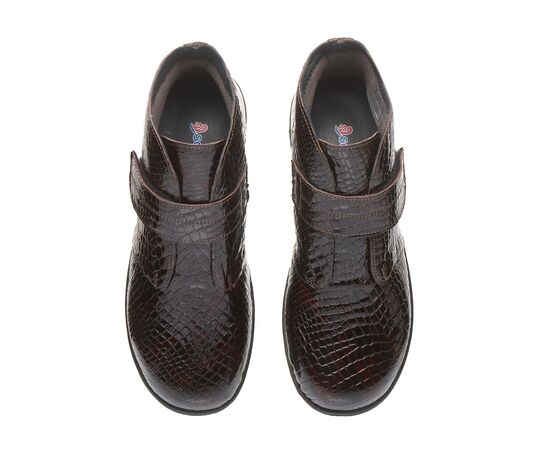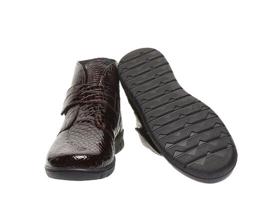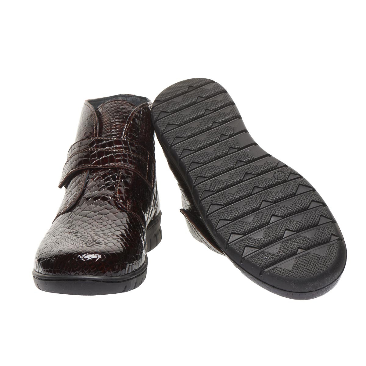 Удобная демисезонная обувь изготовлена из натуральной лаковой кожи, коричневого цвета, обеспечивает максимальное удобство, поможет при профилактике и лечении плоскостопия любого типа или вальгусной деформации.