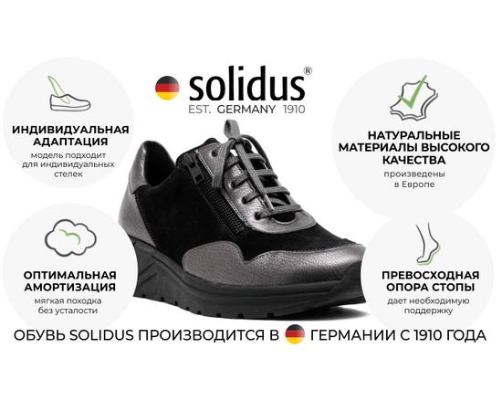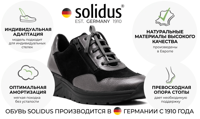 Обувь немецкого бренда Solidus учитывает все анатомические особенности стоп: благодаря разнообразию из 30 колодок, 8 вариантов полноты и половинных размеров, съемным стелькам, будто на заказ, вы получаете обувь, о которой всегда мечтали.