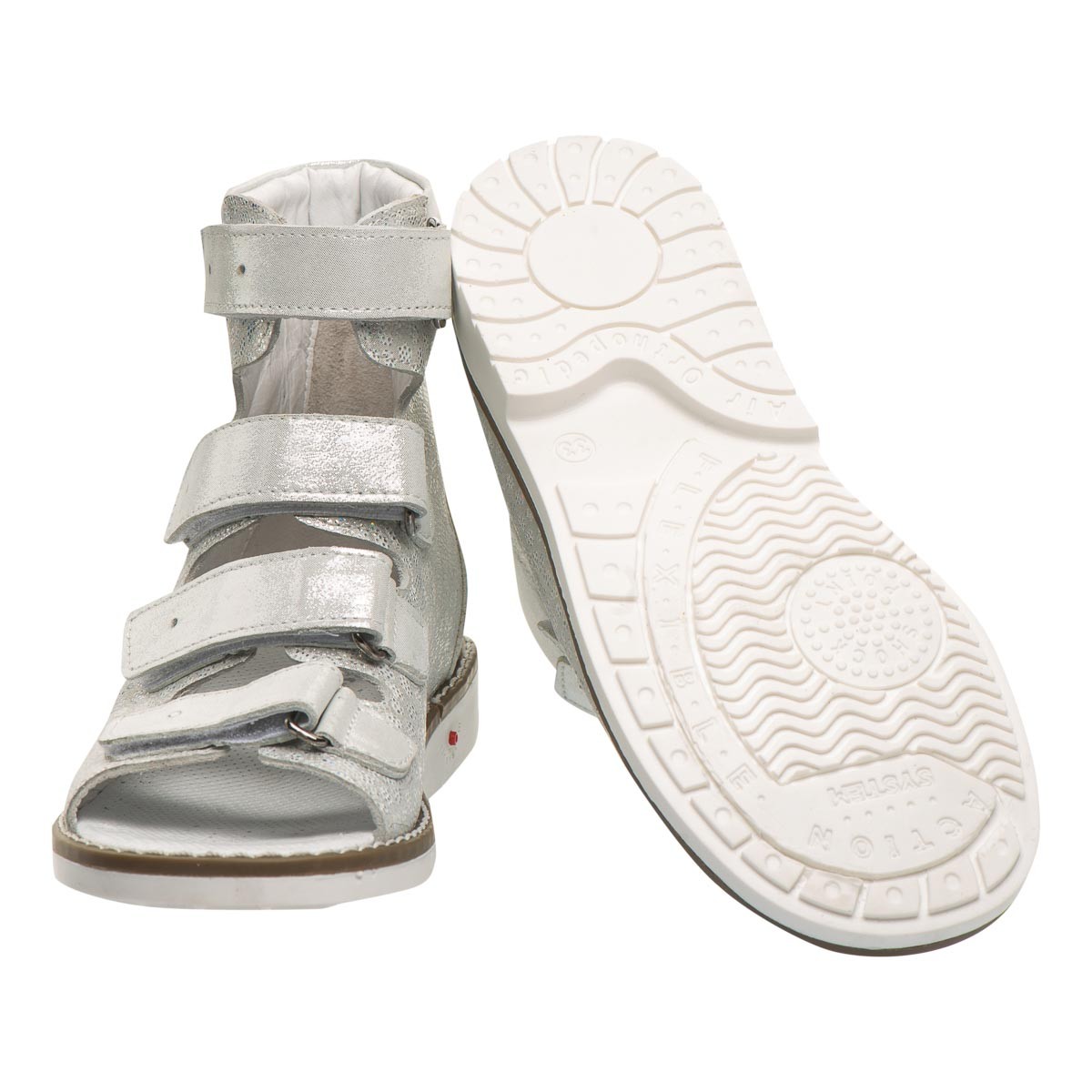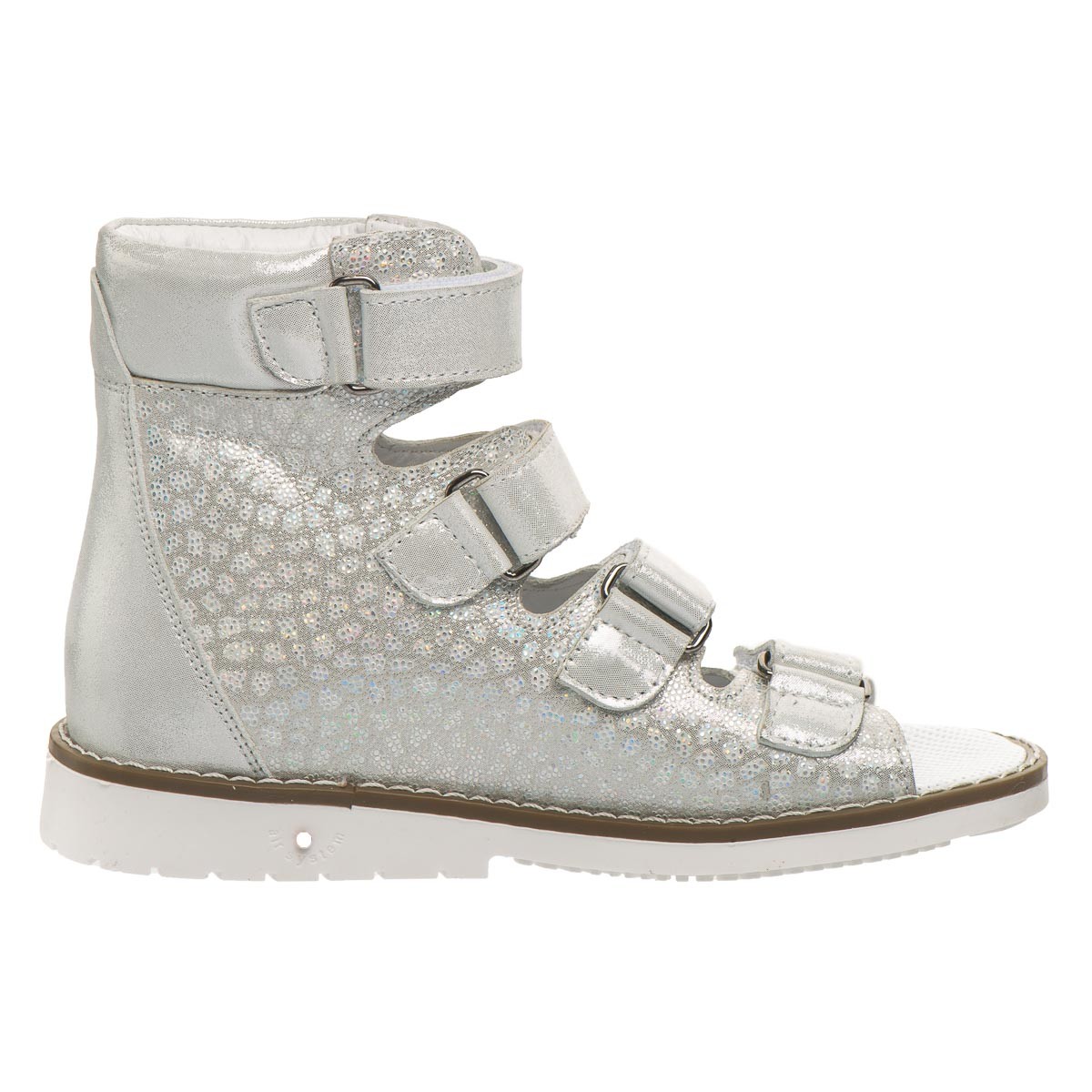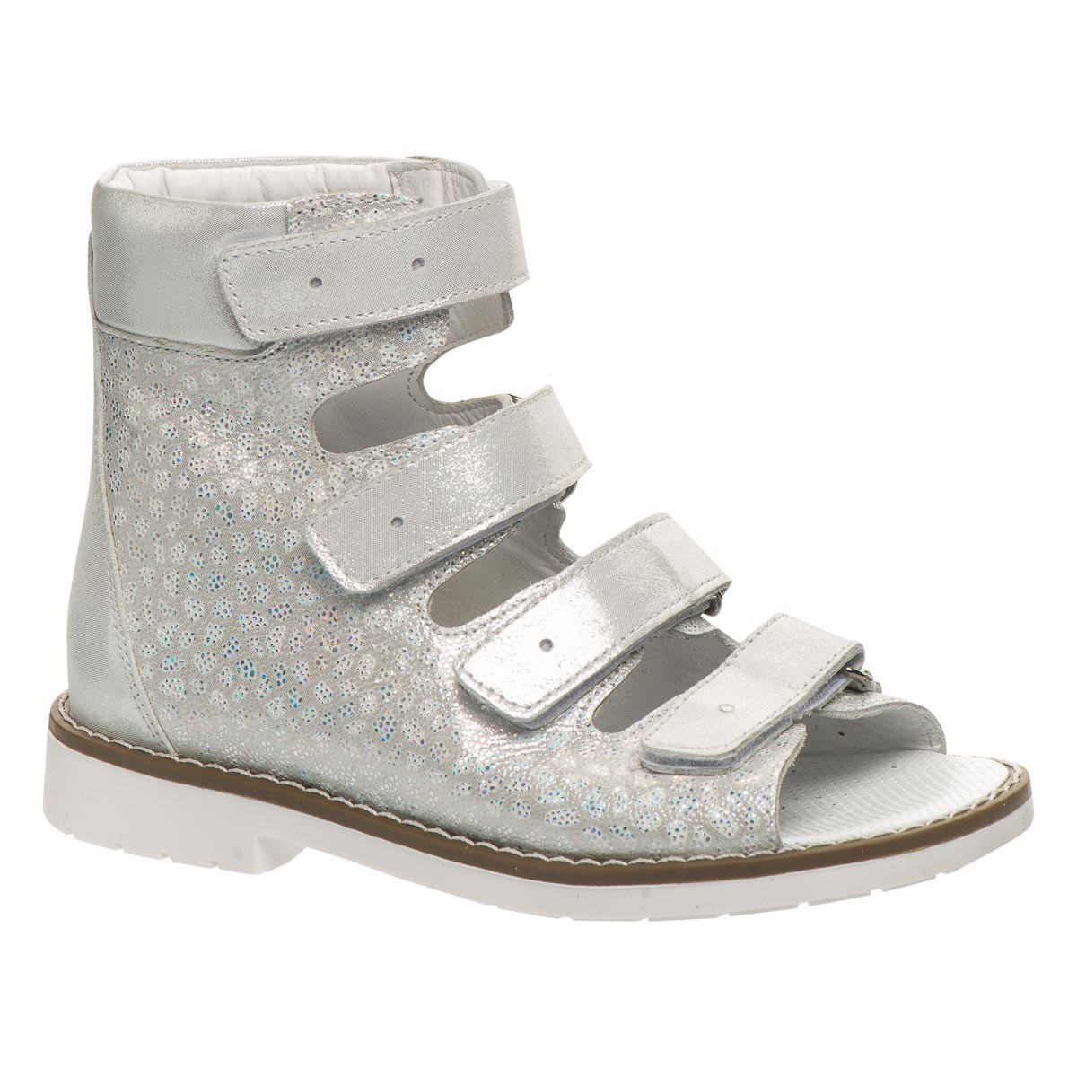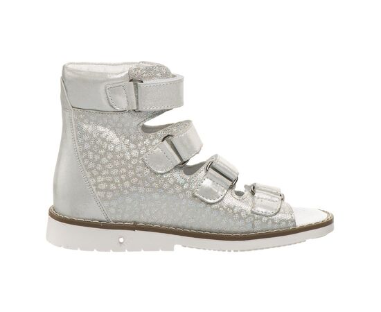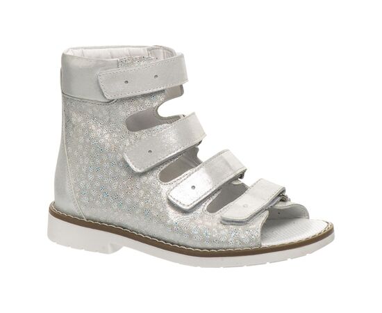THEO LEO 2213 WH-SIL ортопедичні босоніжки для дівчинки створені в комбінації натуральної шкіри білого кольору, зі срібним узором, на 4 липучках. Дотримані всі необхідні вимоги до ортопедичного взуття: анатомічний супінатор, жорсткий задник, високі берці, чотири липучки, каблук Томаса. Завдяки каблуку Томаса створюється необхідна підтримка в області внутрішньої частини стопи, відбувається рівномірний розподіл ударного навантаження на стопу при русі та запобігає зміщенню ноги всередину.