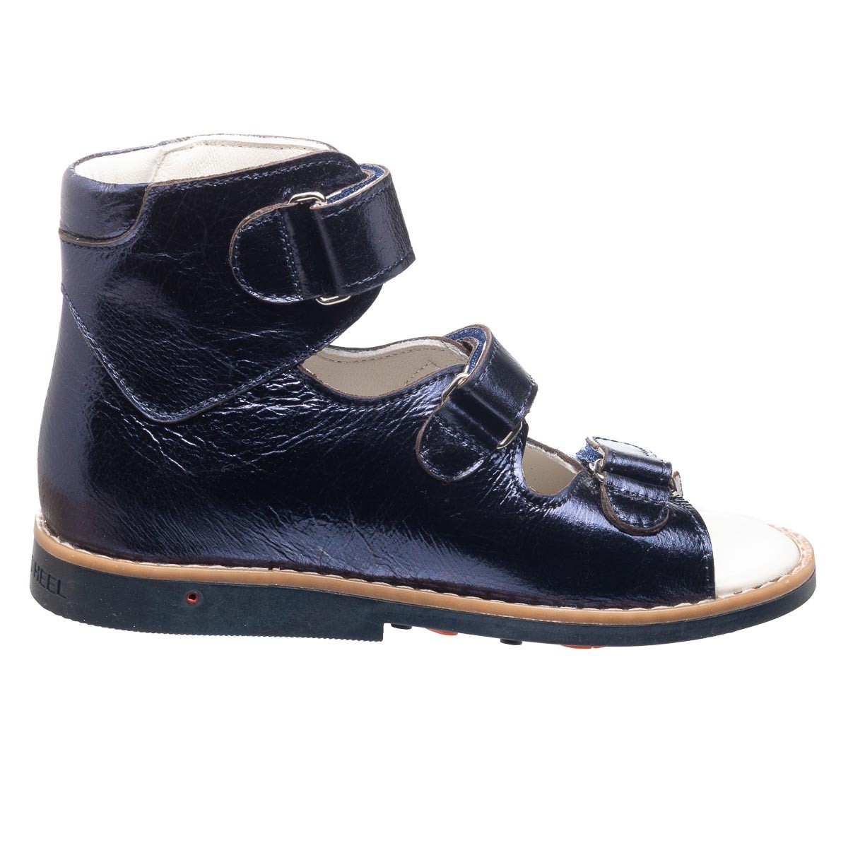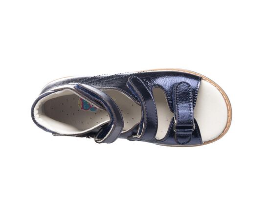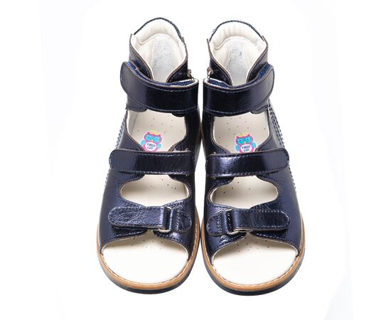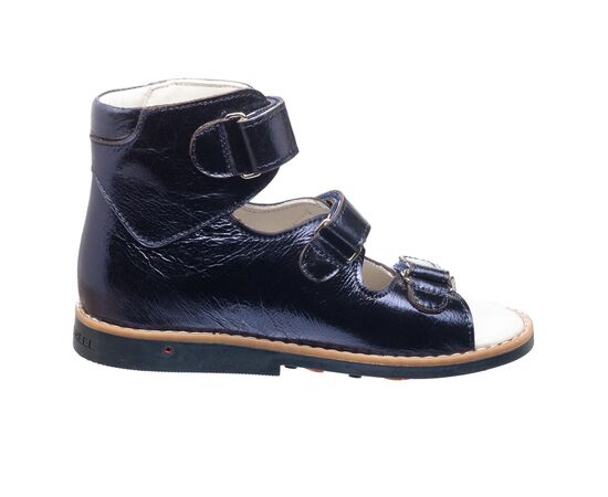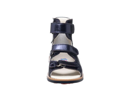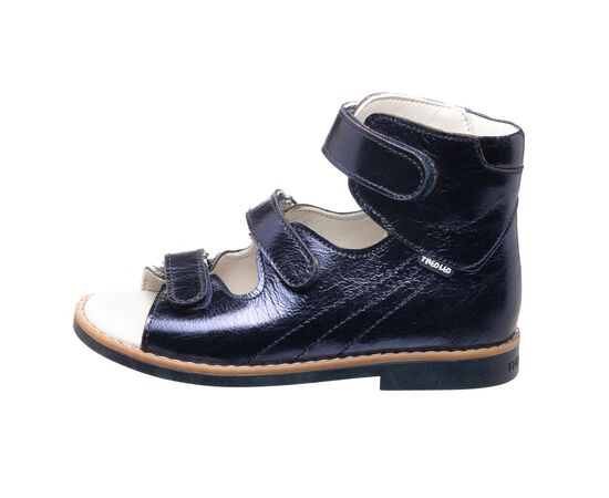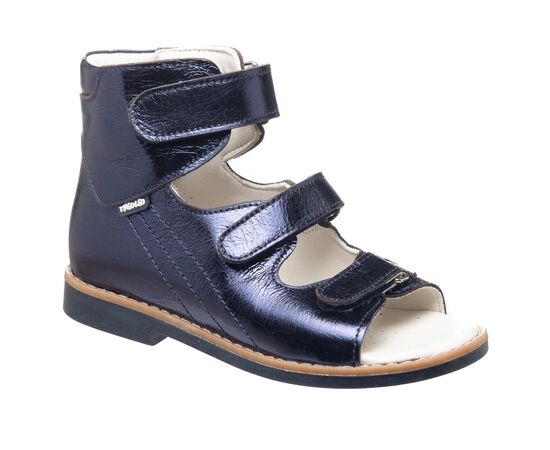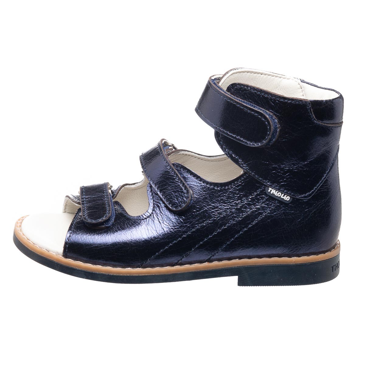 THEO LEO 951 - ортопедичні сандалі з високим задником виконані з натуральної шкіри темно синього кольору з перламутровим відливом. Устілка з анатомічним супінатором і підкладка - натуральна шкіра. Одягаються та іксуються за допомогою трьох липучок. Підошва з термопластичної гуми з каблуком Томаса - не ковзає і добре амортизує. Завдяки підборах Томаса дитяча стопа не буде завалюватися всередину.